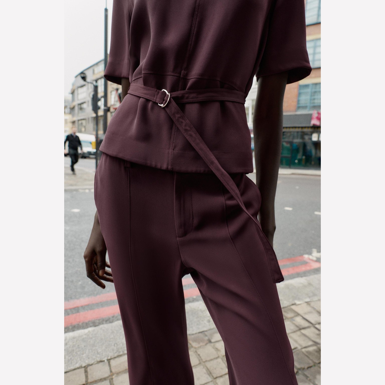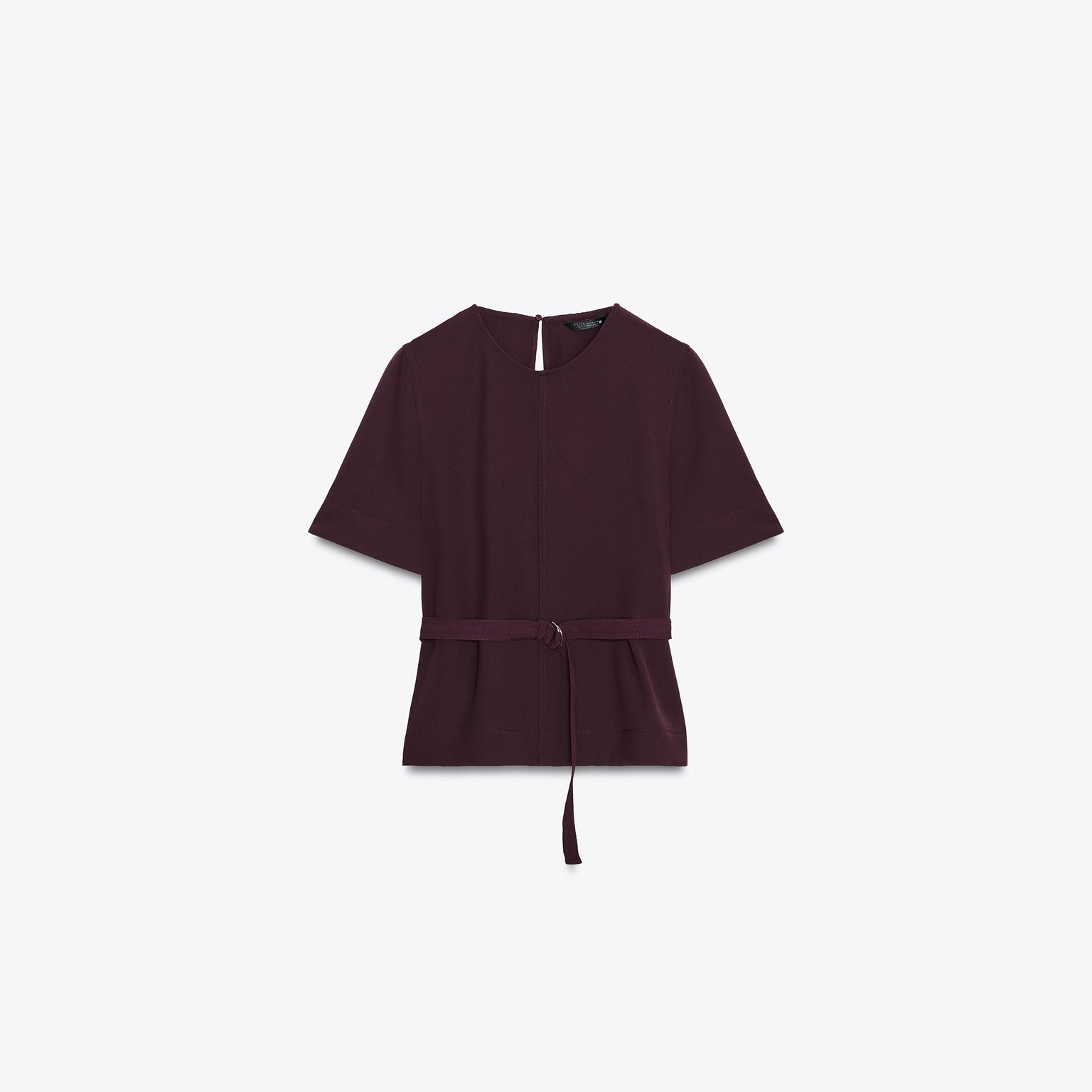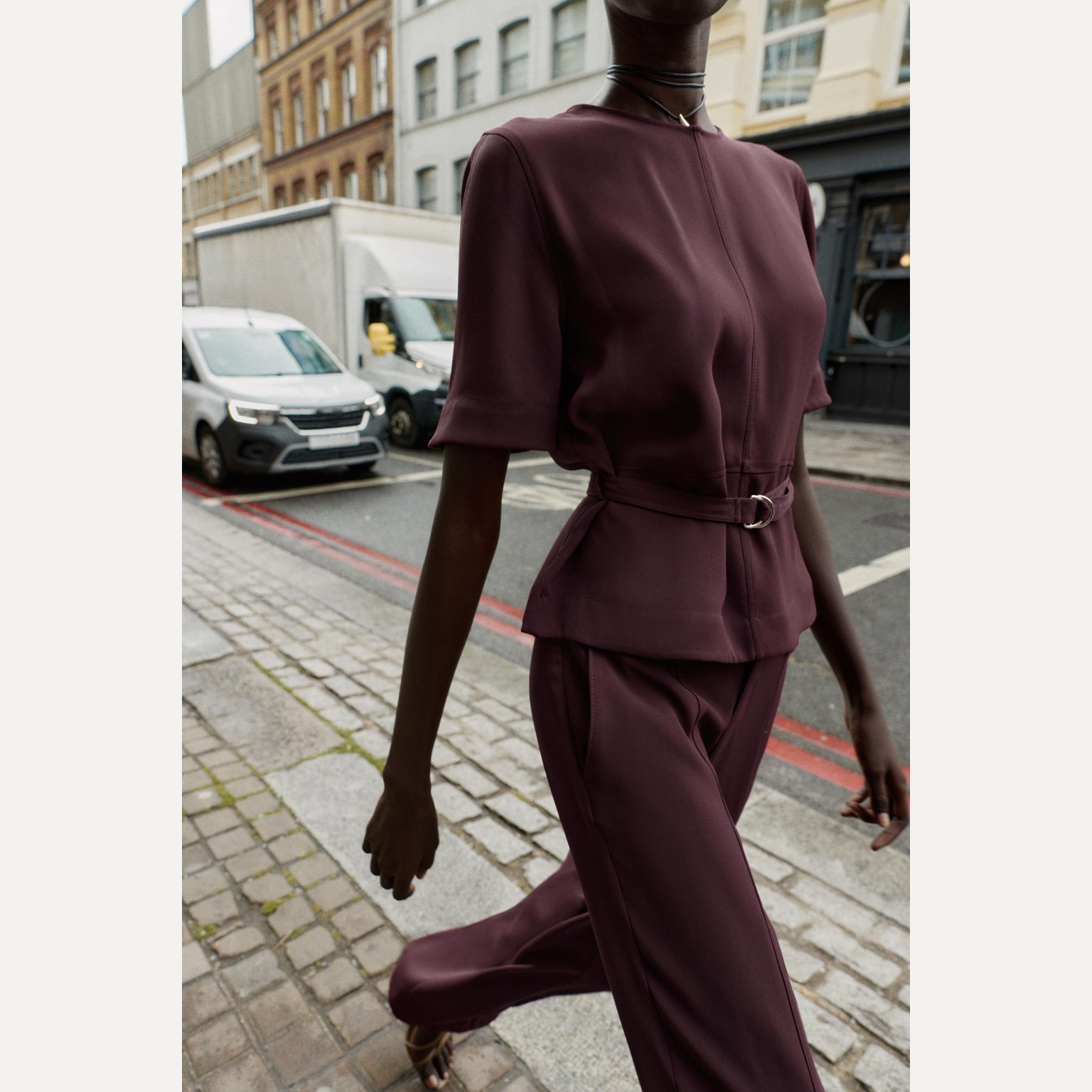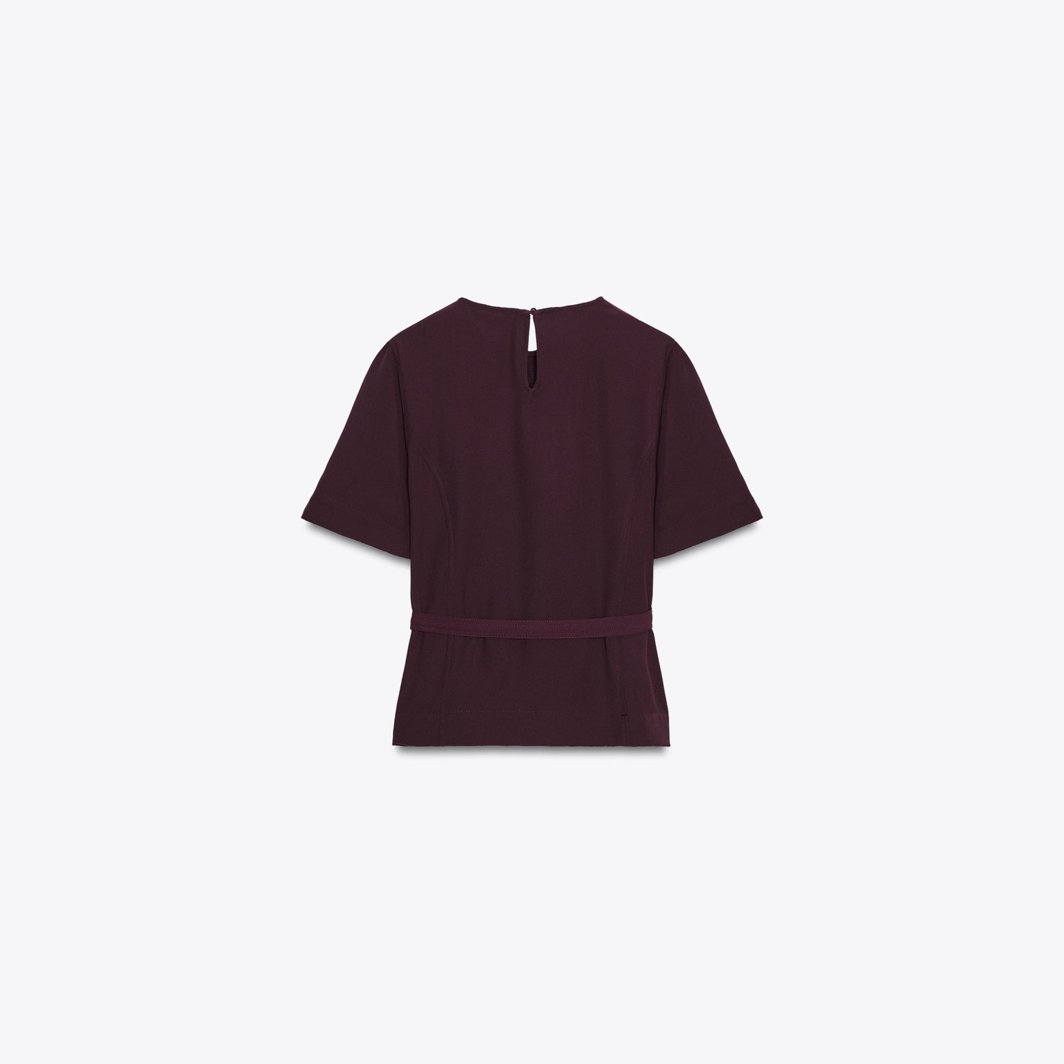 توب بأكمام قصيرة مع حزام مطابق – لون باذنجاني – Aubergine (Short Sleeve Belted Top) توب أنيق بتصميم بسيط وعملي، يتميز بياقة دائرية وأكمام قصيرة، مع حزام مطابق يحدد الخصر ويمنح لمسة عصرية. يأتي بفتحات جانبية عند الحافة لحرية حركة أفضل، إضافة إلى فتحة خلفية مع زر مخفي لمظهر نظيف وراقي يناسب الإطلالات اليومية والكاجوال الأنيقة.