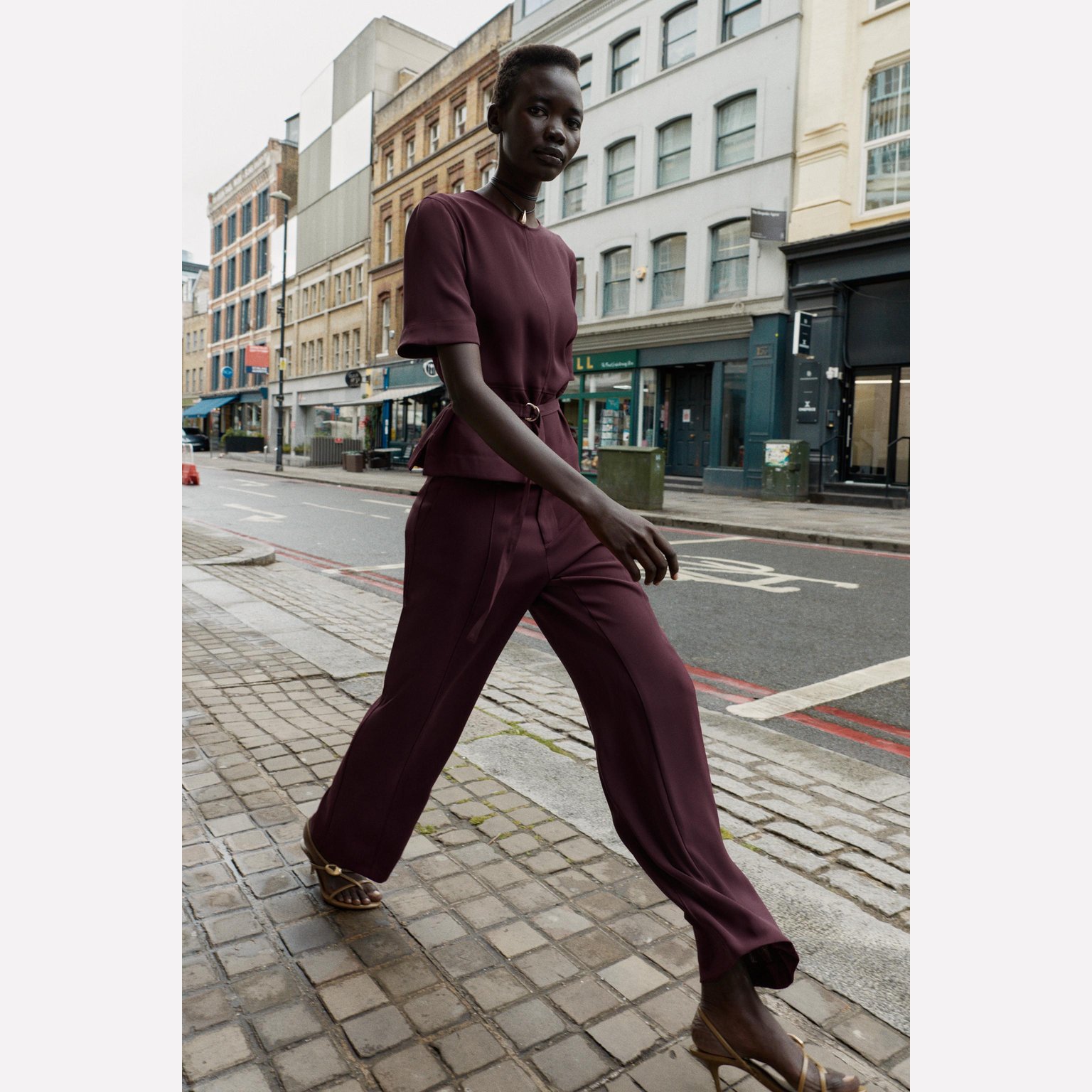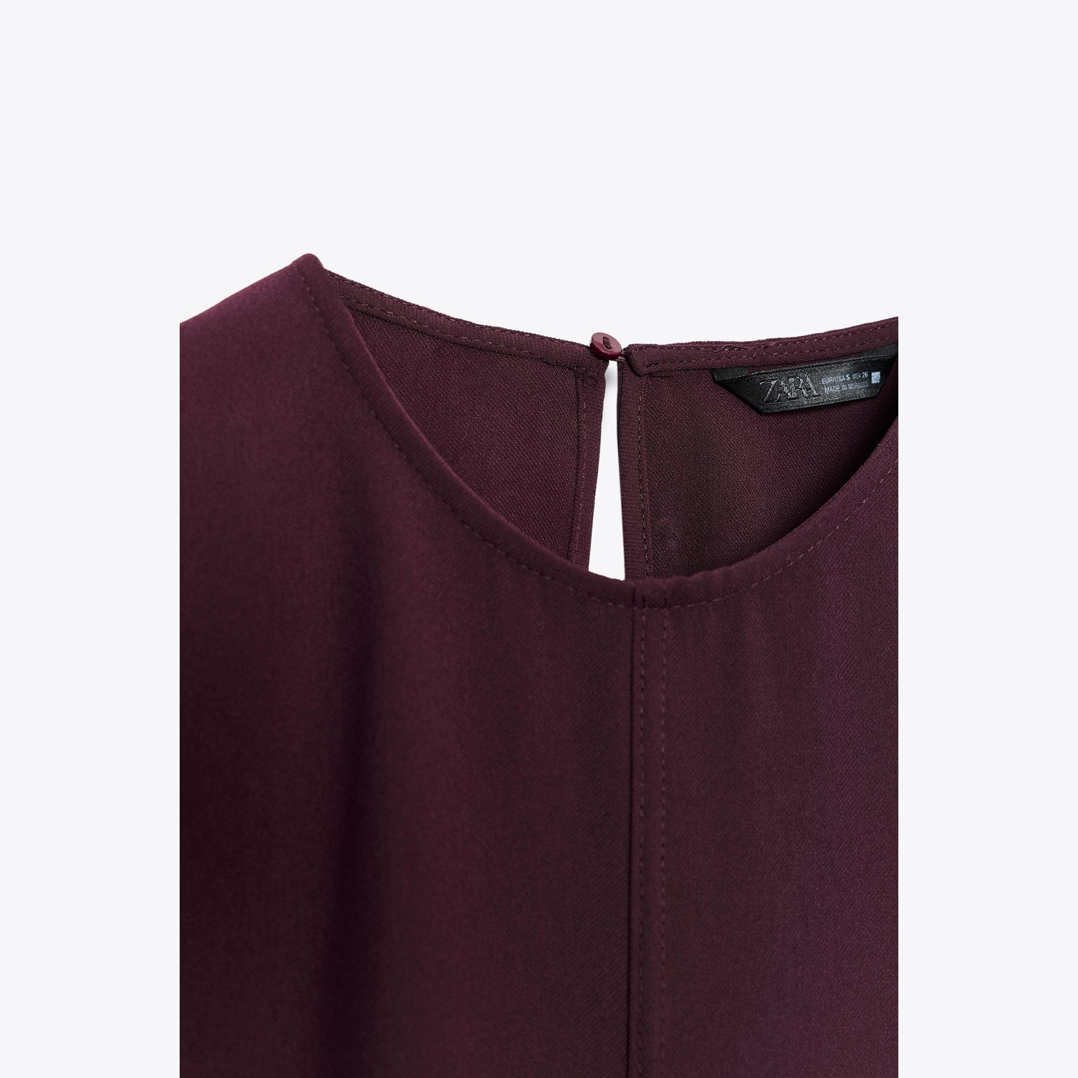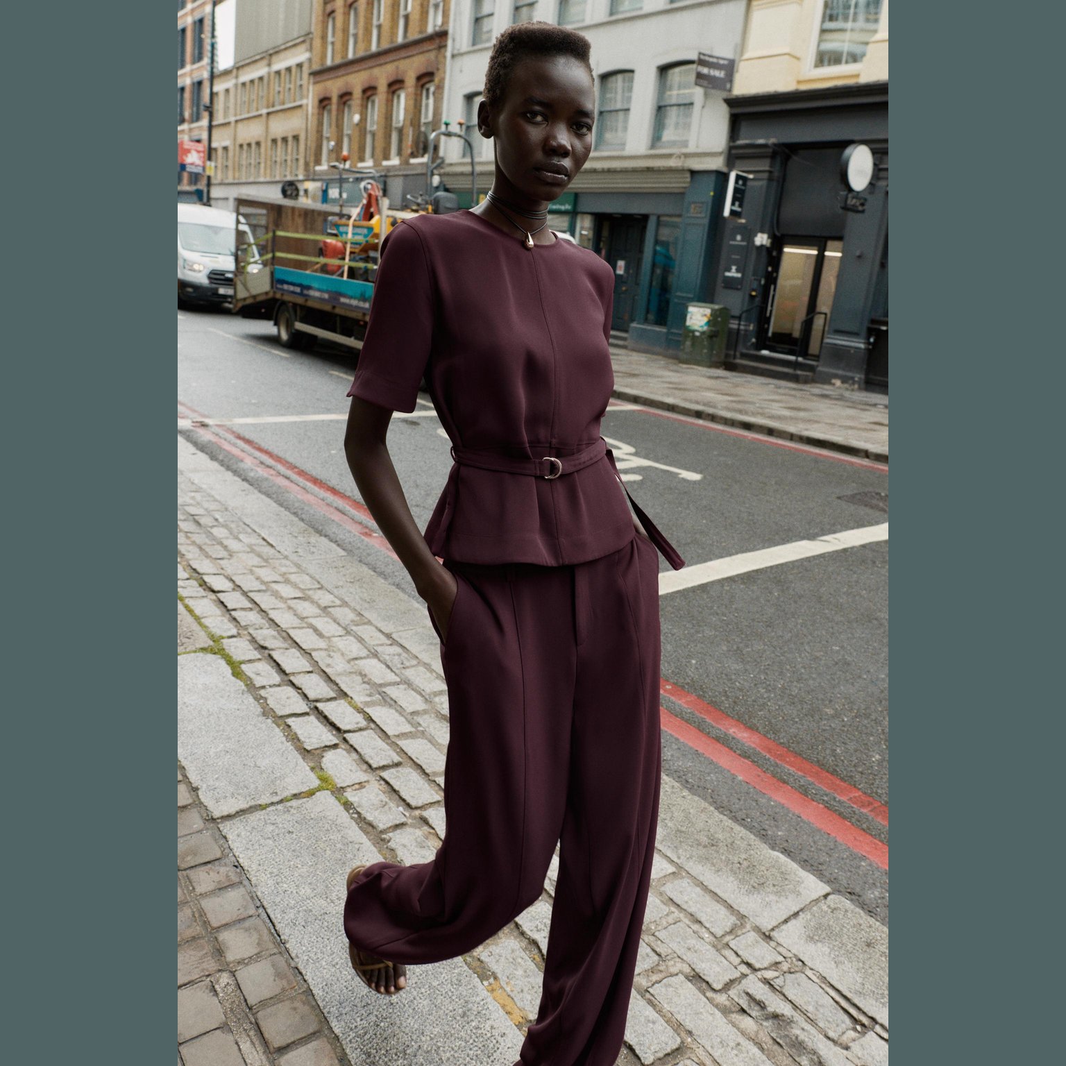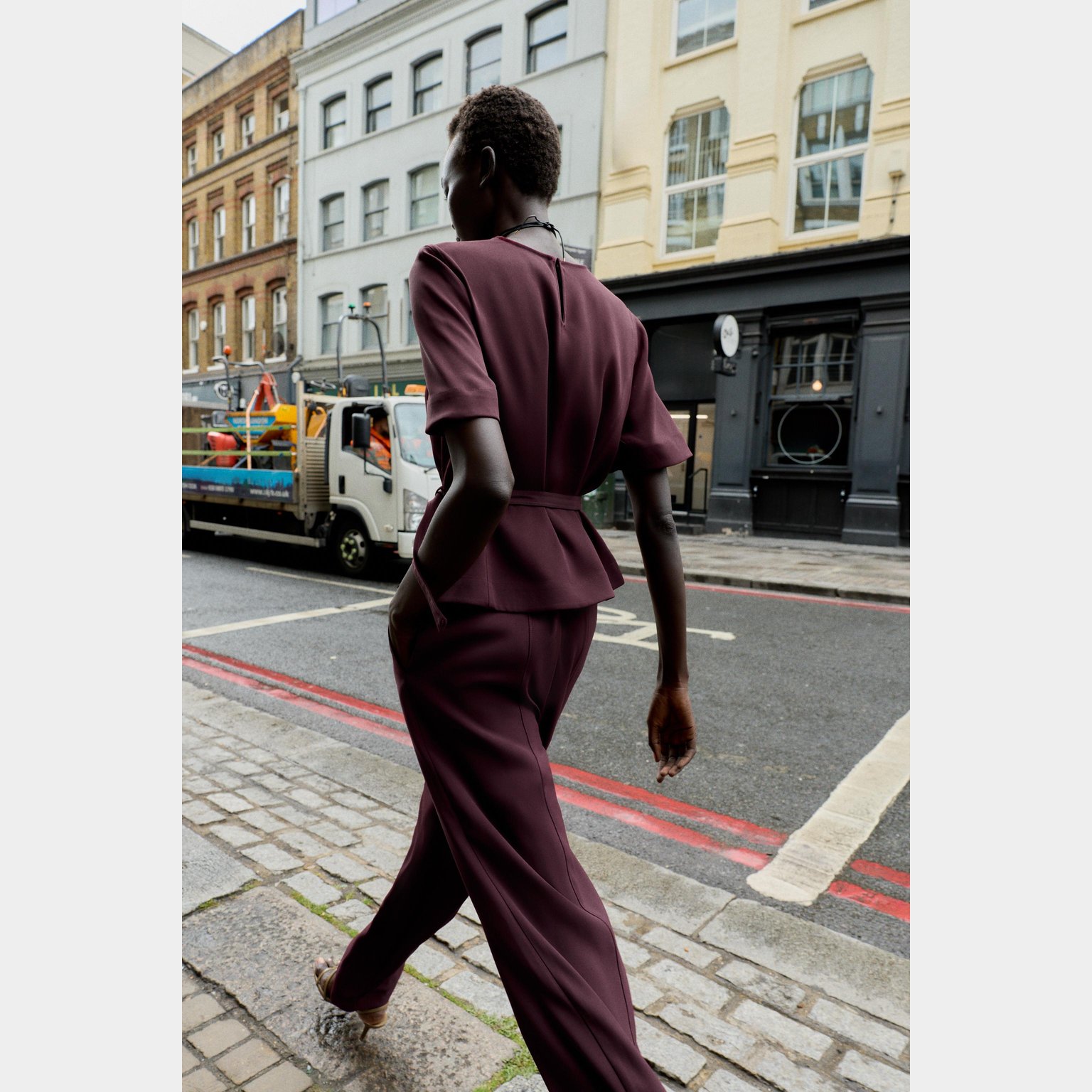 توب بأكمام قصيرة مع حزام مطابق – لون باذنجاني – Aubergine (Short Sleeve Belted Top) توب أنيق بتصميم بسيط وعملي، يتميز بياقة دائرية وأكمام قصيرة، مع حزام مطابق يحدد الخصر ويمنح لمسة عصرية. يأتي بفتحات جانبية عند الحافة لحرية حركة أفضل، إضافة إلى فتحة خلفية مع زر مخفي لمظهر نظيف وراقي يناسب الإطلالات اليومية والكاجوال الأنيقة.
