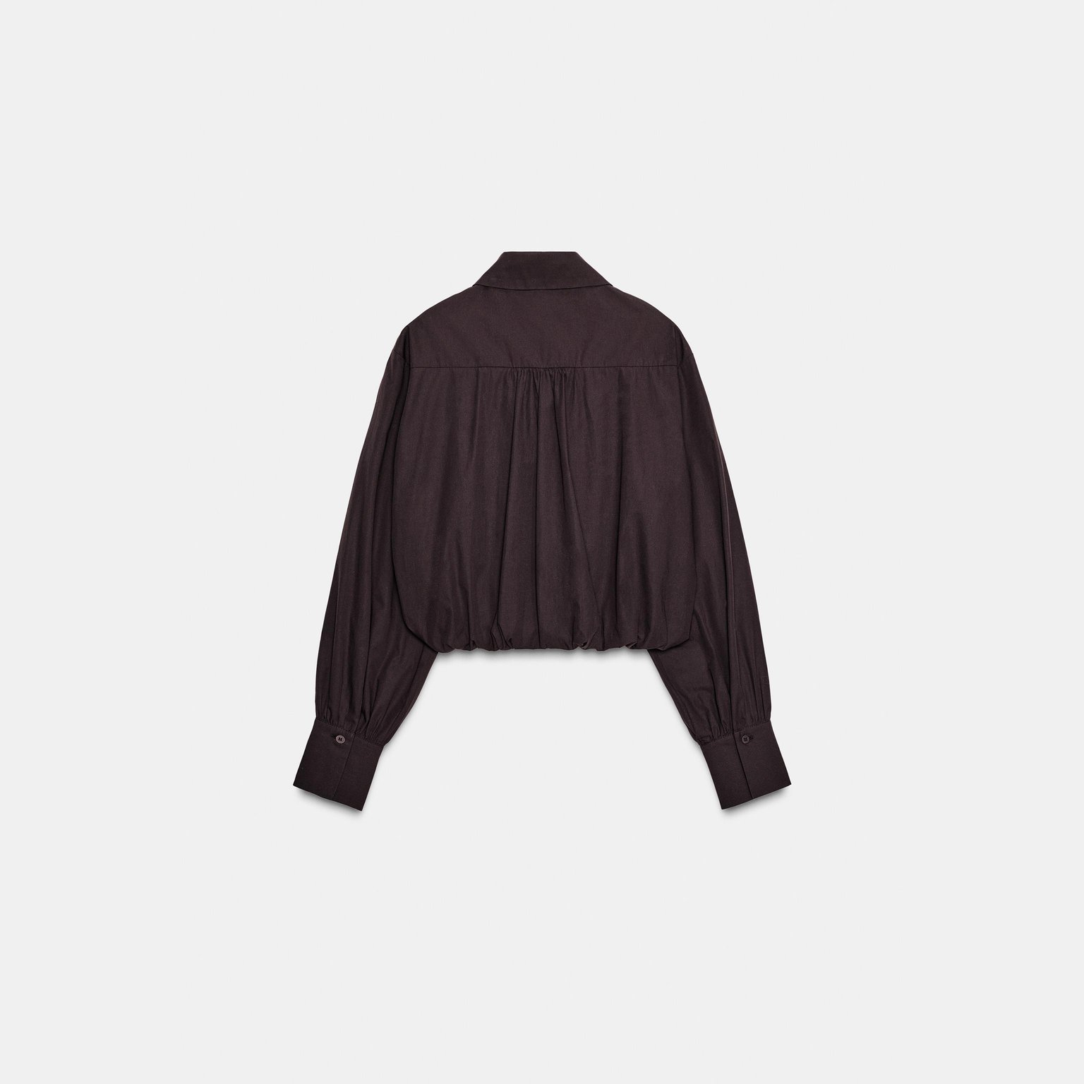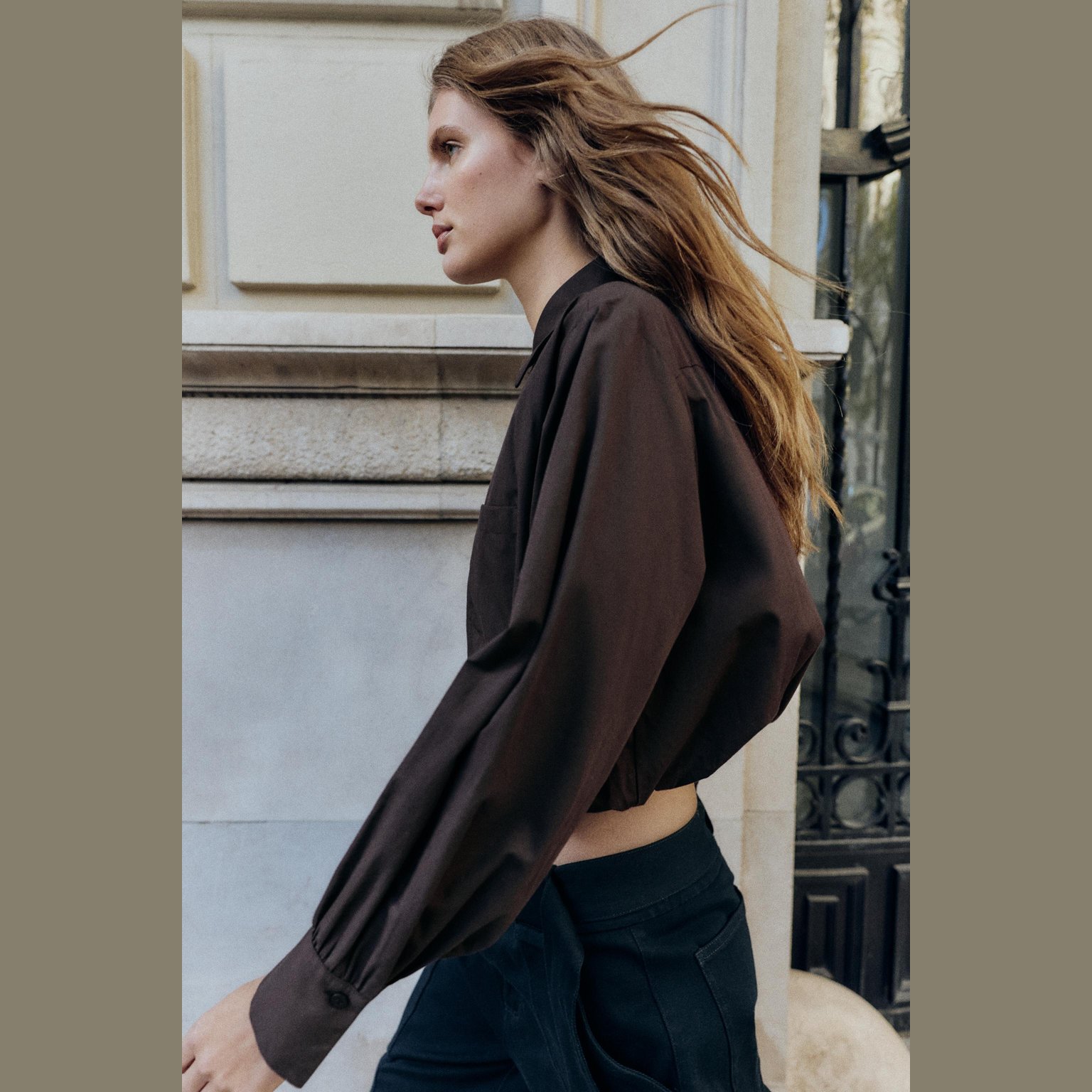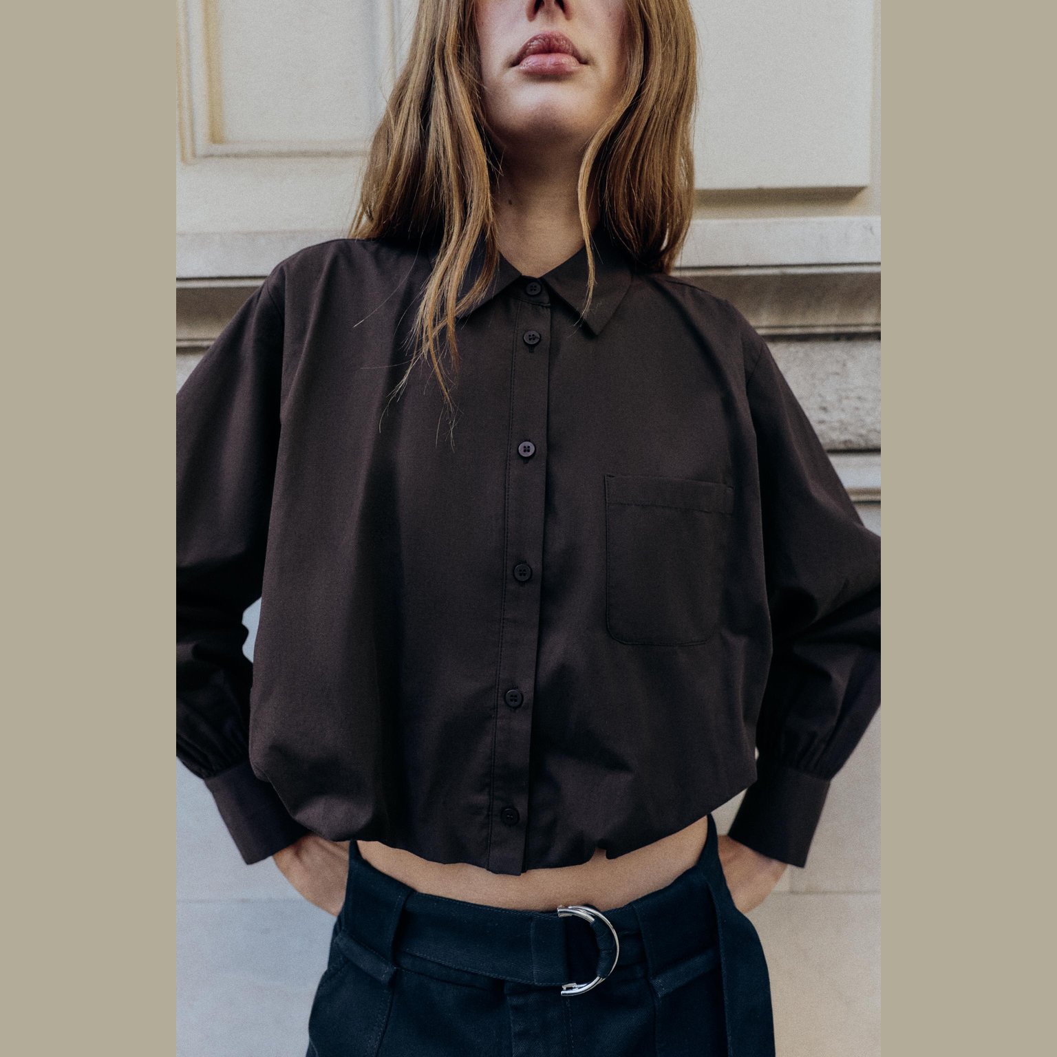 قميص بوبلين قصير بتصميم بالون – لون بني – Brown (Cropped Poplin Balloon Shirt) قميص قصير أنيق بتصميم عصري، يتميز بياقة كلاسيكية وأكمام طويلة، مع جيب رقعة أمامي يضيف لمسة عملية. يأتي بحافة بالون مزودة برباط داخلي مرن يمنح شكلًا مميزًا، إضافة إلى إغلاق أمامي بأزرار لمظهر نظيف وعملي يناسب الإطلالات اليومية والكاجوال الأنيقة.