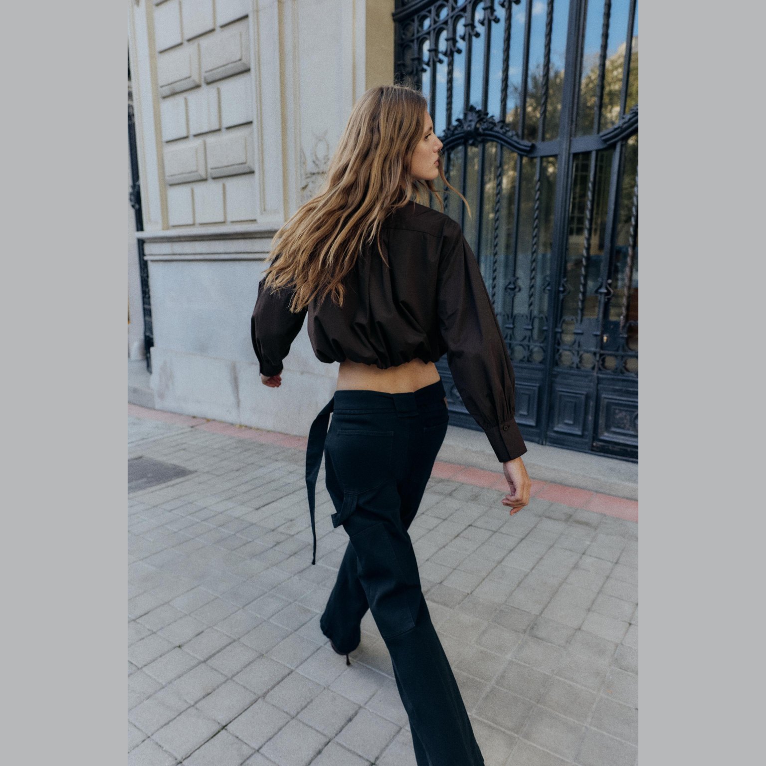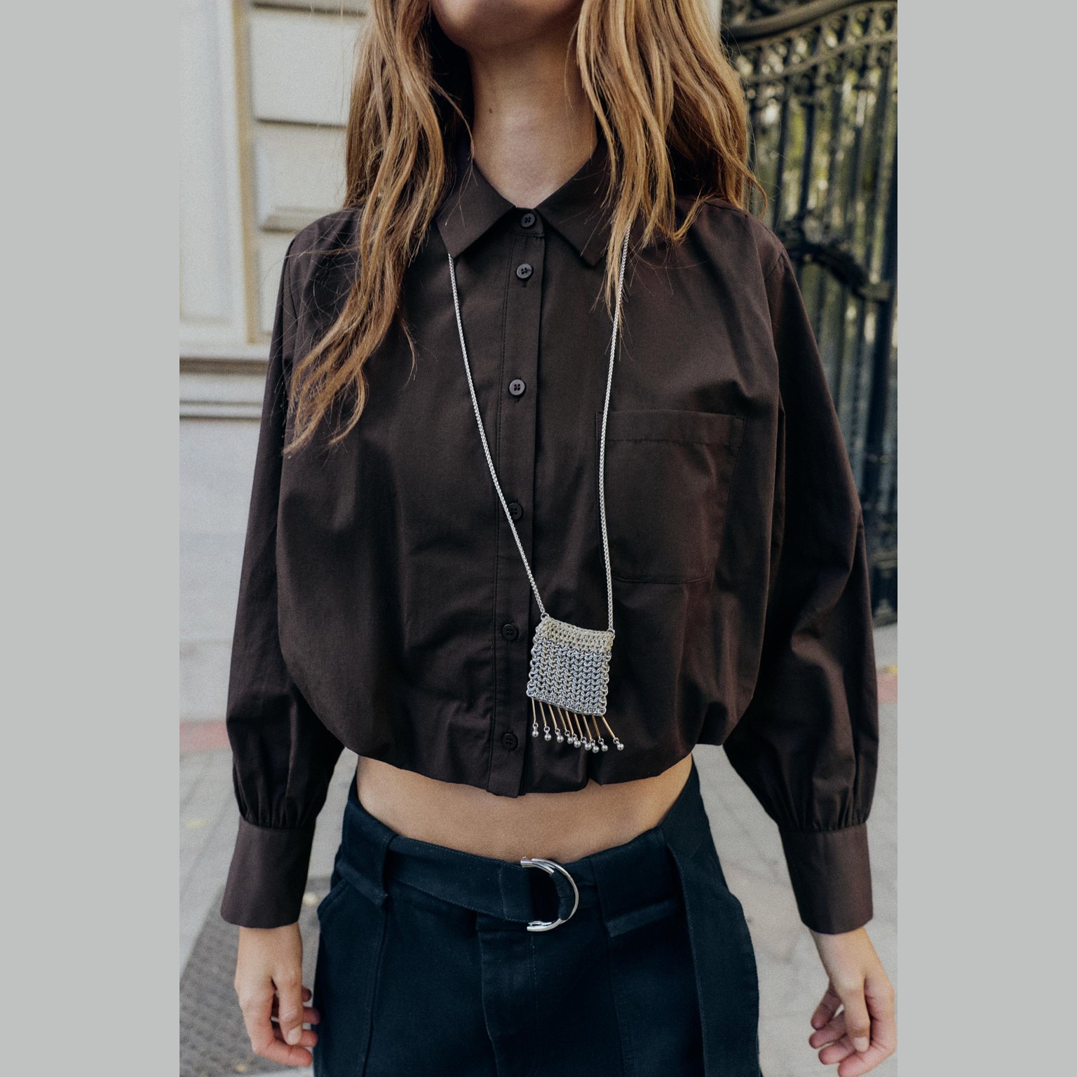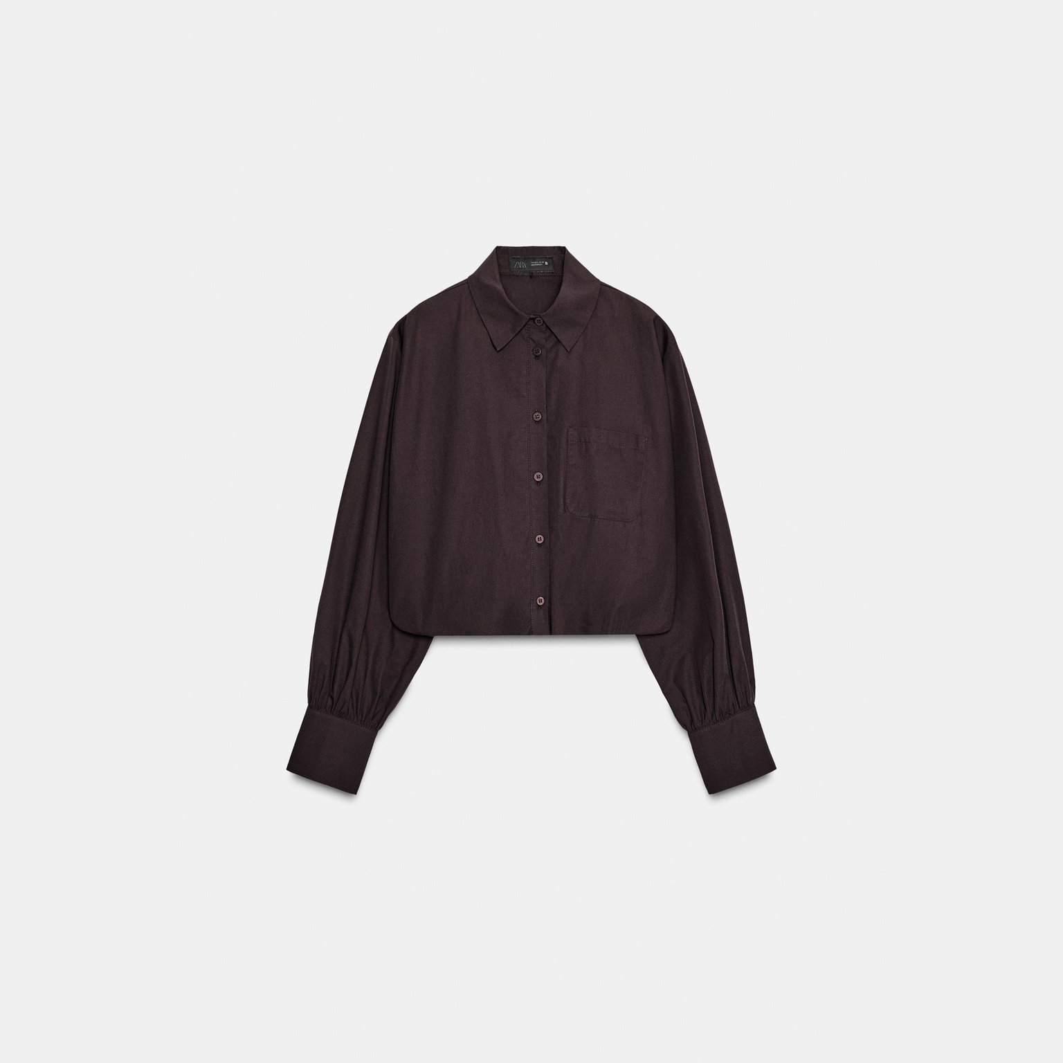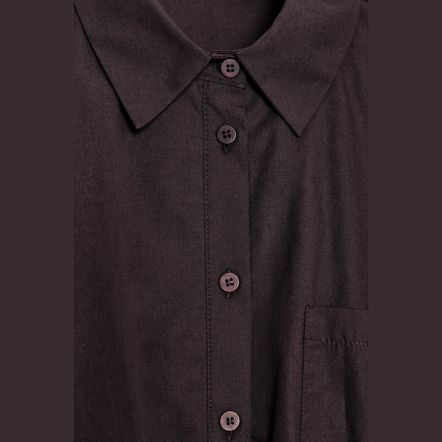قميص بوبلين قصير بتصميم بالون – لون بني – Brown (Cropped Poplin Balloon Shirt) قميص قصير أنيق بتصميم عصري، يتميز بياقة كلاسيكية وأكمام طويلة، مع جيب رقعة أمامي يضيف لمسة عملية. يأتي بحافة بالون مزودة برباط داخلي مرن يمنح شكلًا مميزًا، إضافة إلى إغلاق أمامي بأزرار لمظهر نظيف وعملي يناسب الإطلالات اليومية والكاجوال الأنيقة.