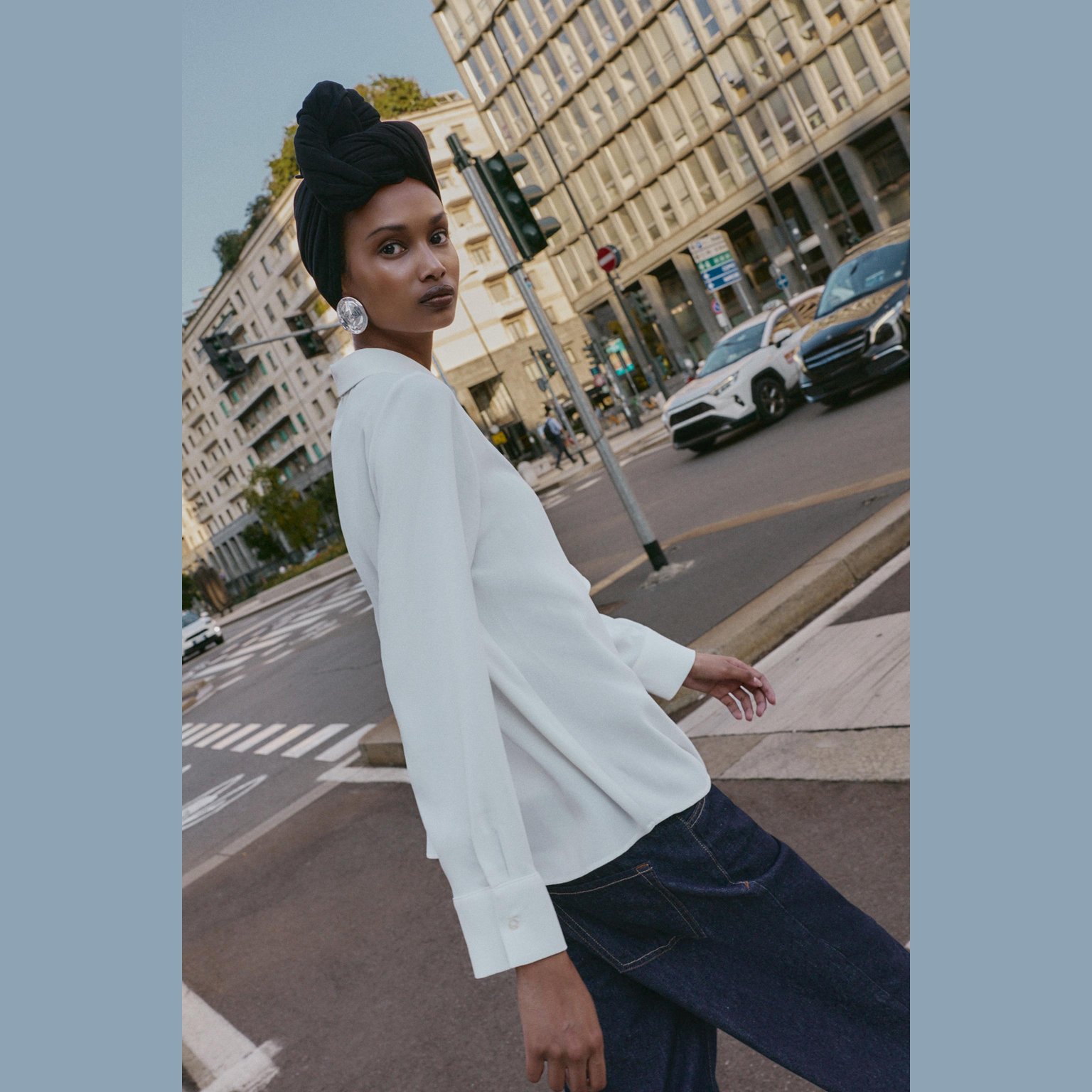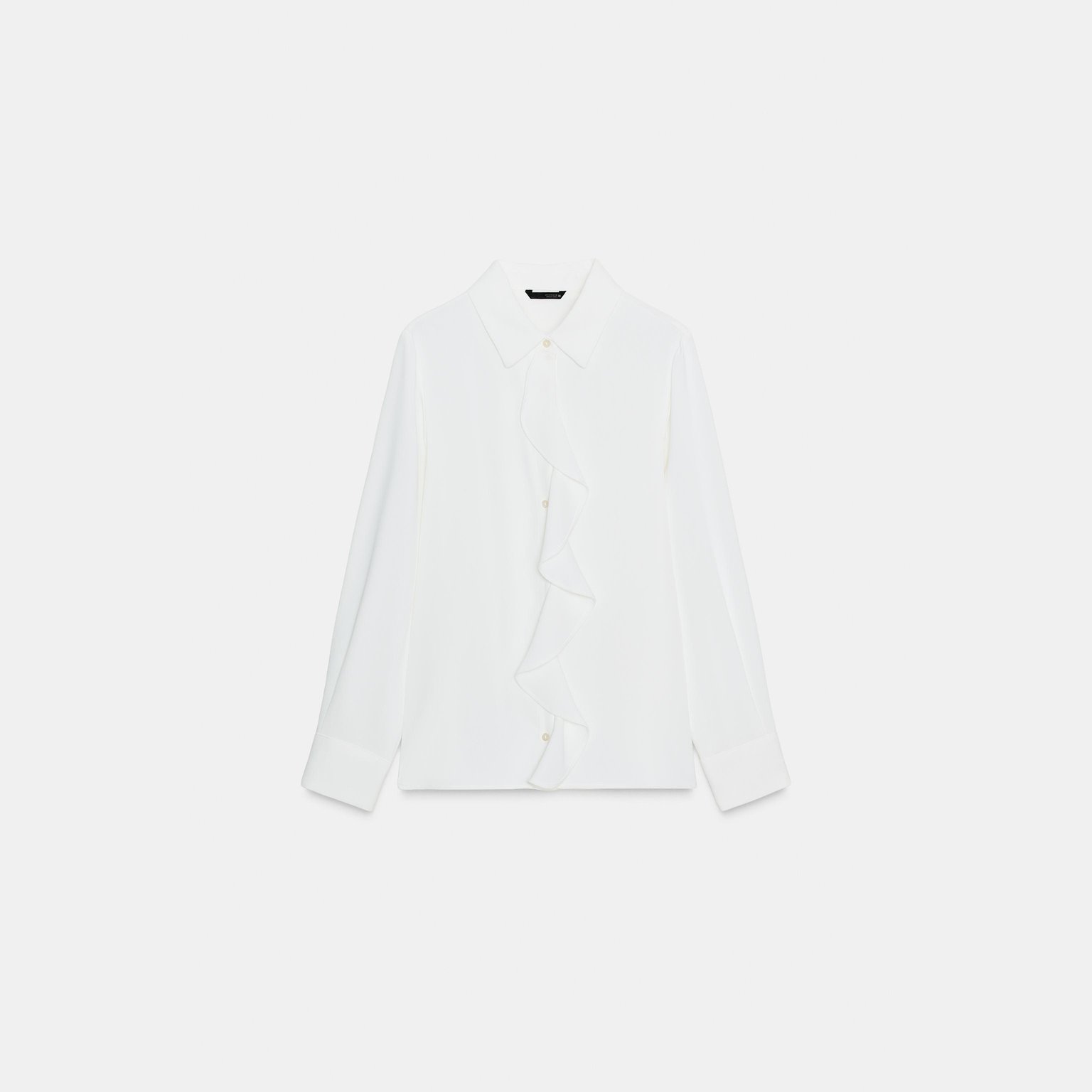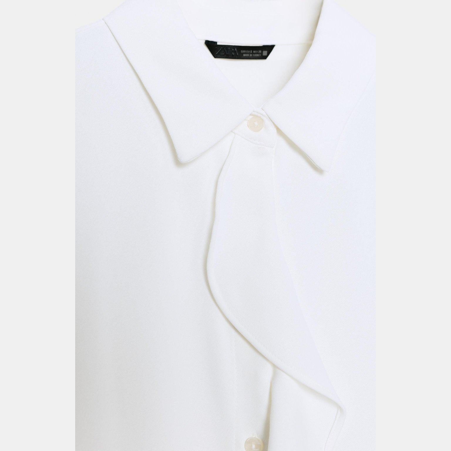 قميص كريب مع كشكش أمامي – لون أبيض محار – Oyster‑White (Crepe Shirt with Ruffle) قميص أنيق بقماش كريب انسيابي، يتميز بياقة لابيل وأكمام طويلة، مع كشكش أمامي يضيف لمسة أنثوية راقية. يأتي بإغلاق أمامي بأزرار لمظهر نظيف وعملي يناسب الإطلالات اليومية والكاجوال الأنيقة.
