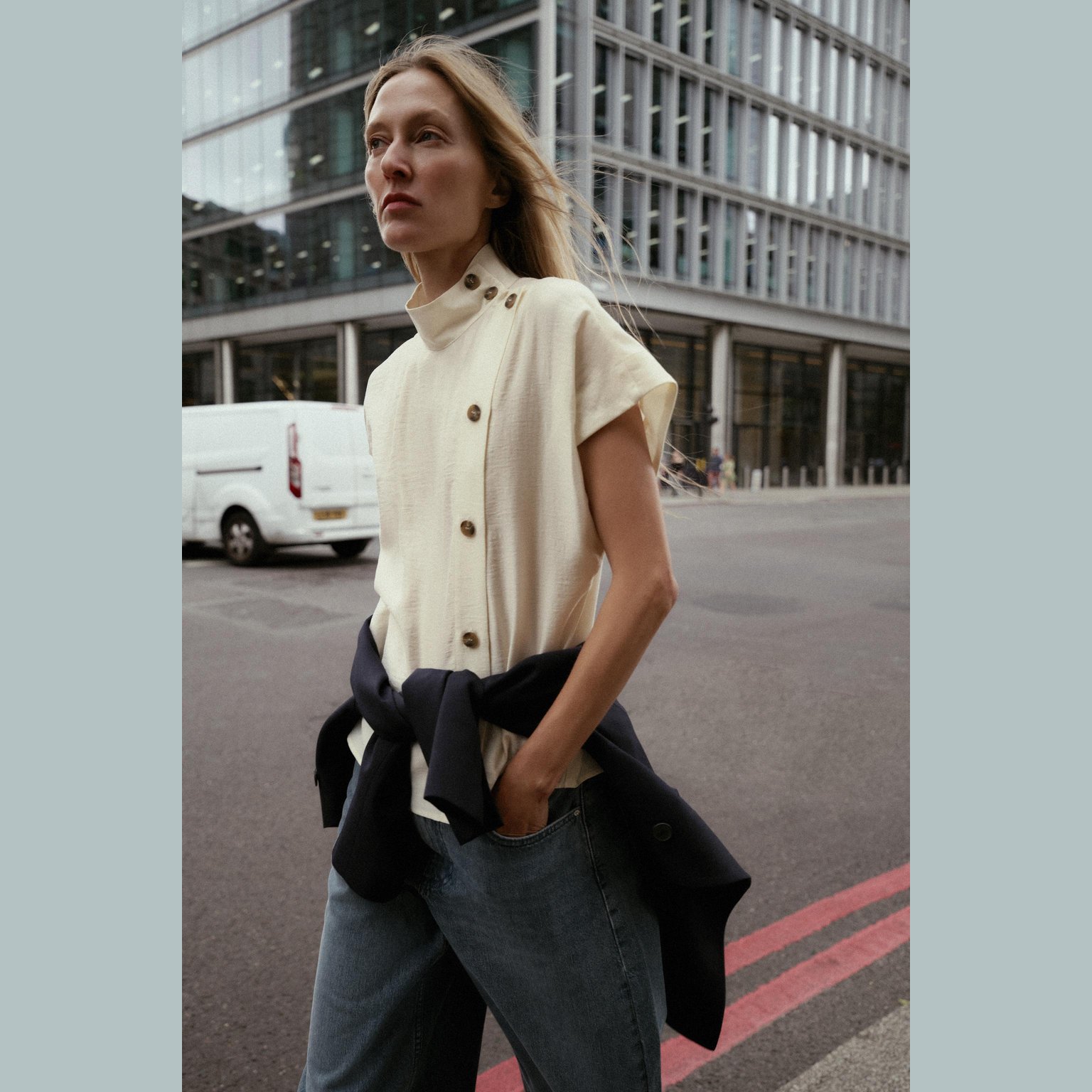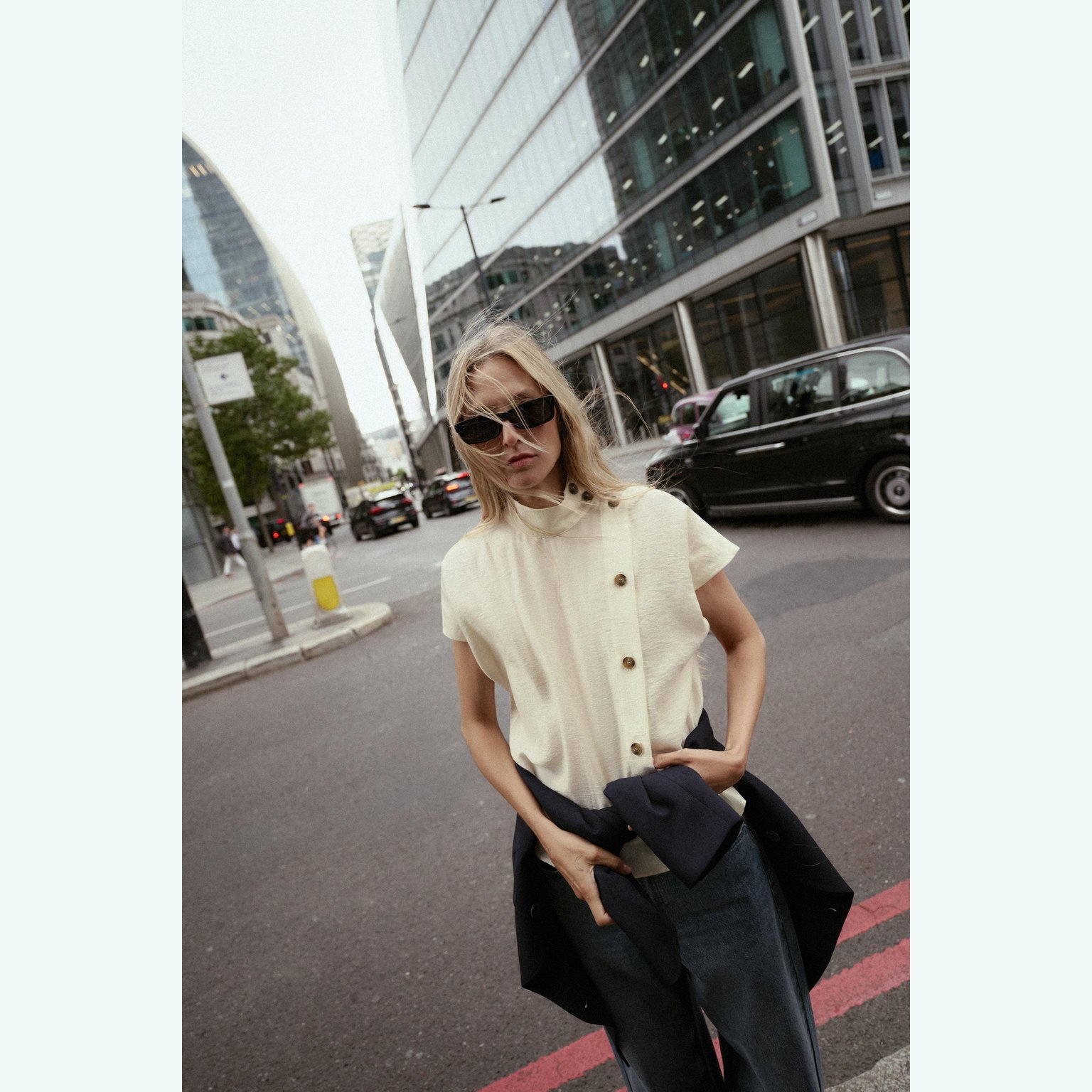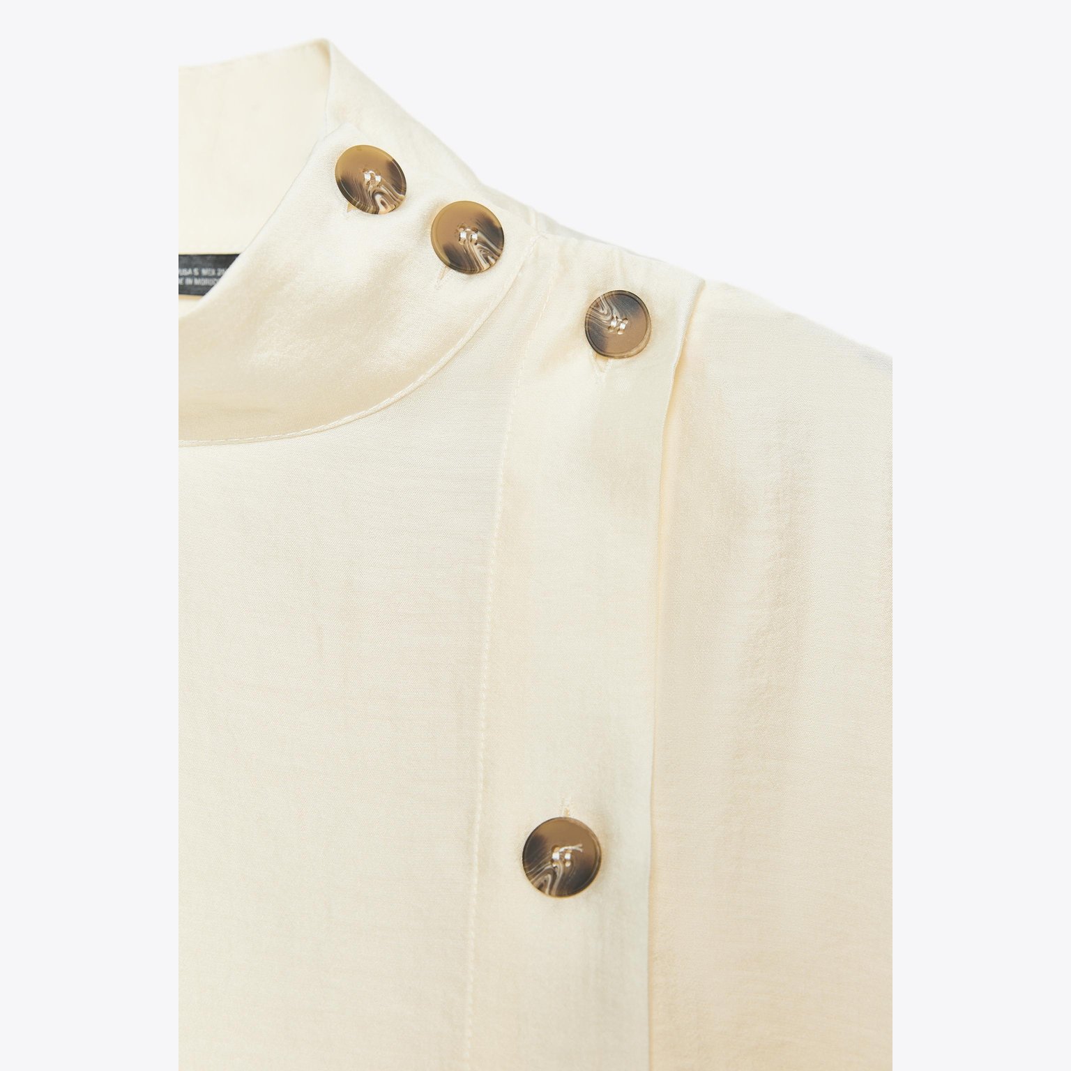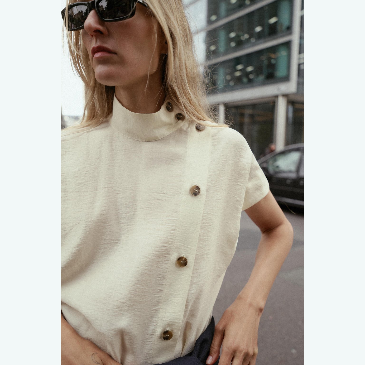 قميص بياقة واقفة مع أزرار جانبية متباينة – لون إيكرُو – Ecru (Contrast Button Shirt) قميص أنيق بتصميم عصري ناعم، يتميز بياقة واقفة وأكتاف منخفضة تمنح مظهرًا انسيابيًا. يأتي بإغلاق جانبي مزوّد بأزرار متباينة تضيف لمسة مميزة، مما يجعله خيارًا مثاليًا للإطلالات اليومية والكاجوال الأنيقة.