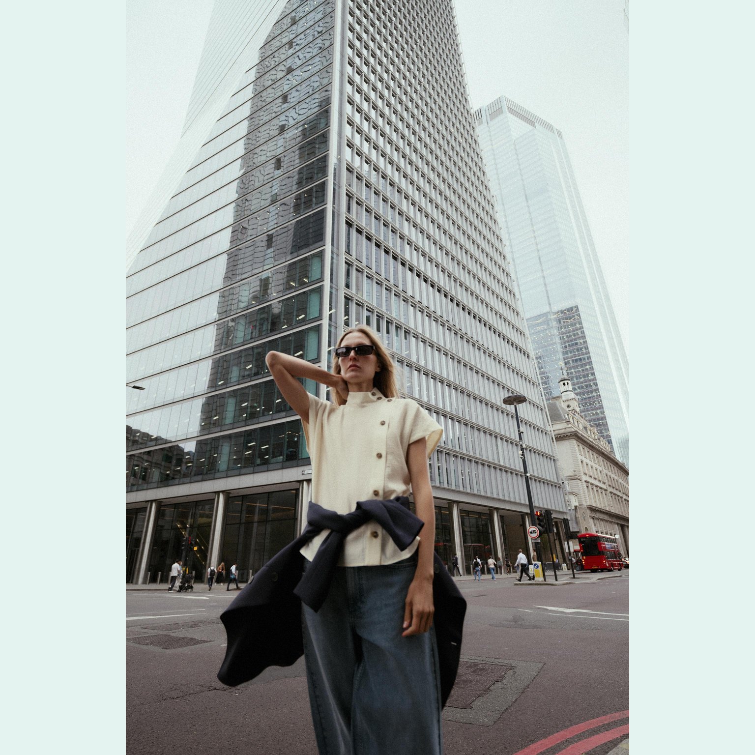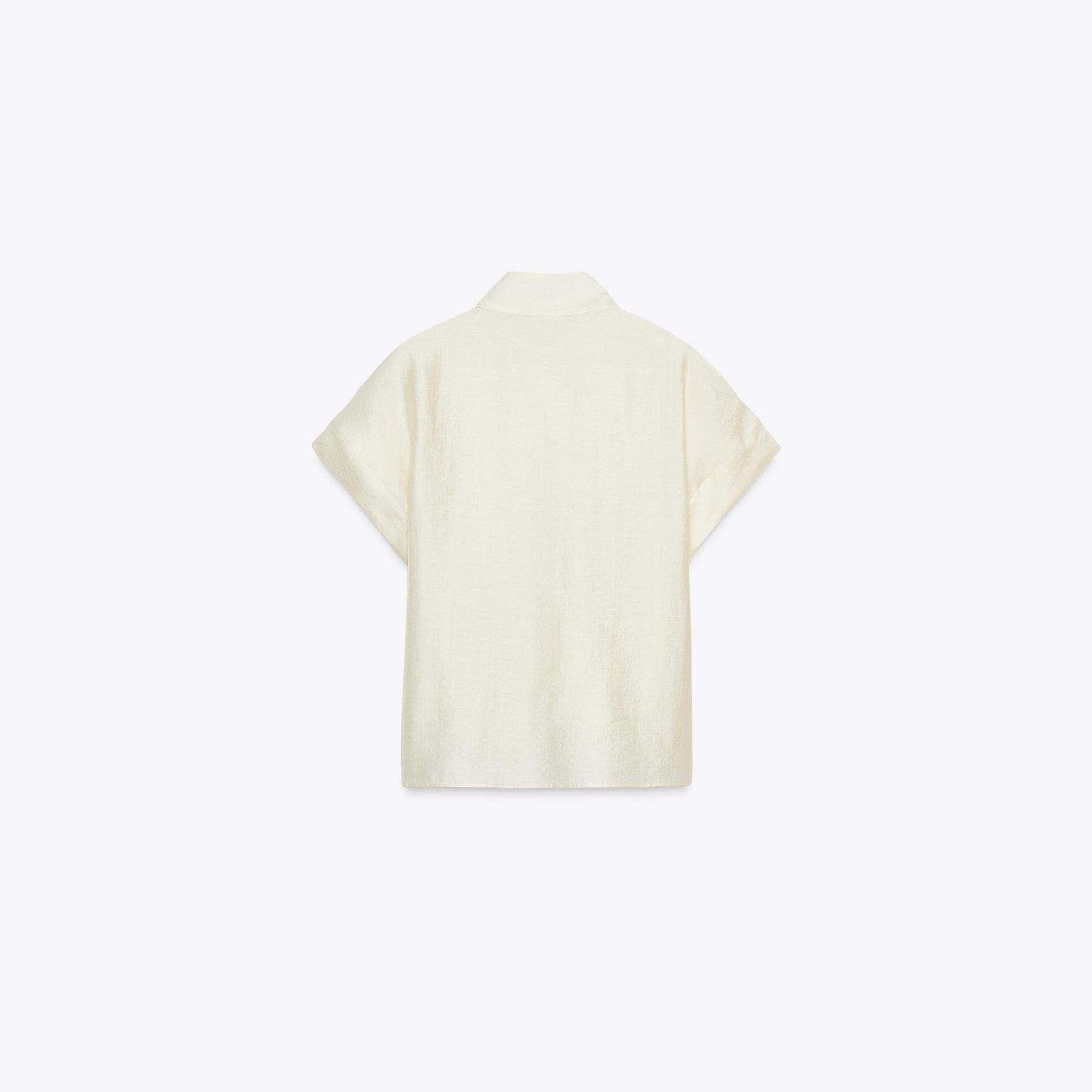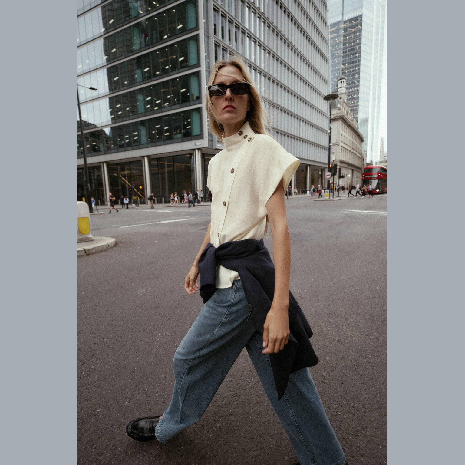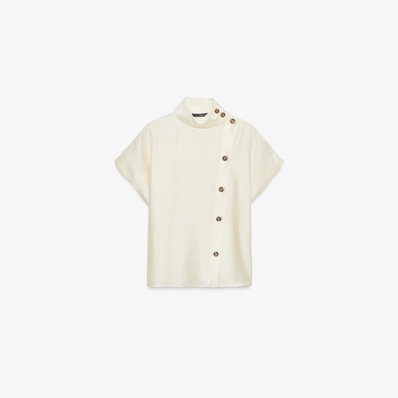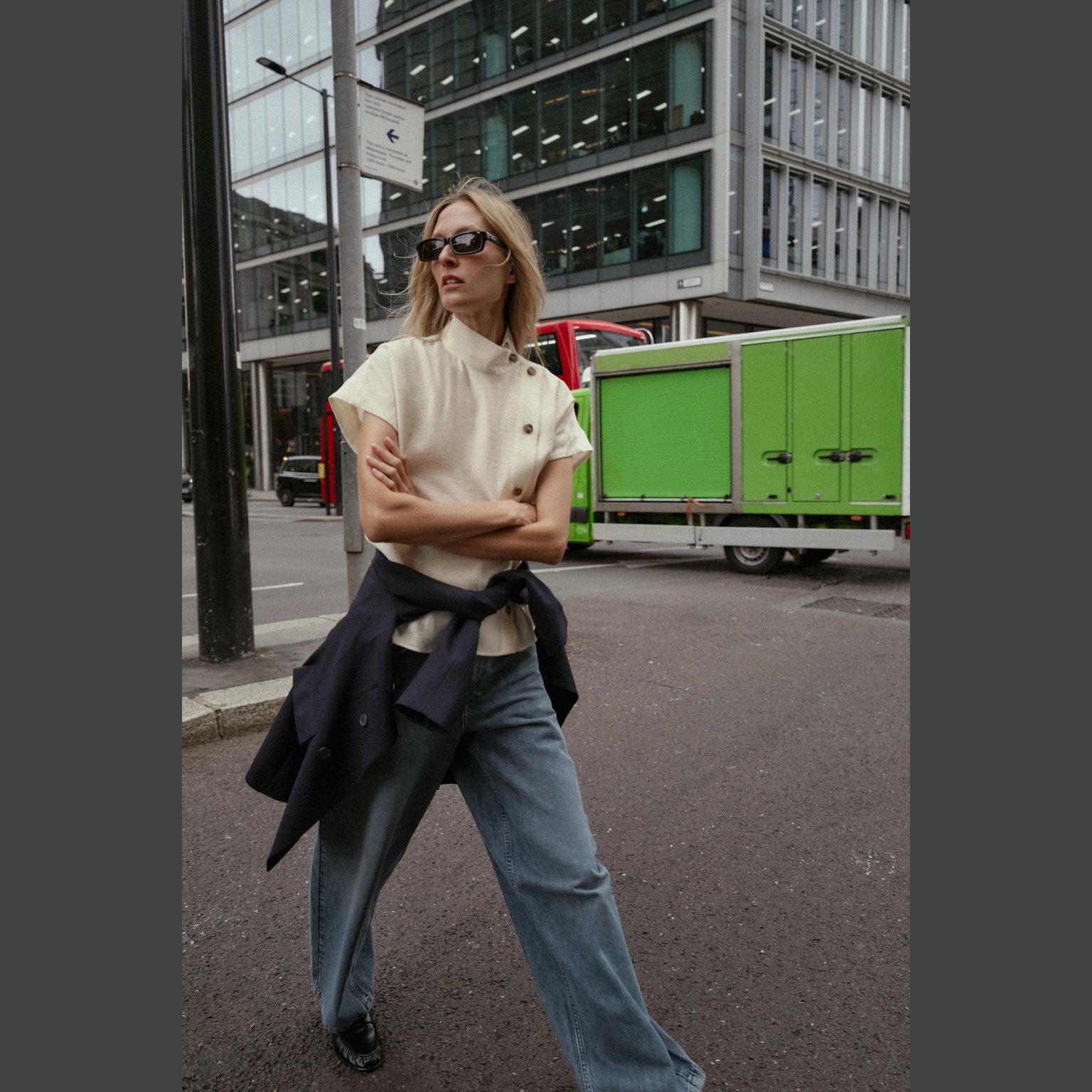 قميص بياقة واقفة مع أزرار جانبية متباينة – لون إيكرُو – Ecru (Contrast Button Shirt) قميص أنيق بتصميم عصري ناعم، يتميز بياقة واقفة وأكتاف منخفضة تمنح مظهرًا انسيابيًا. يأتي بإغلاق جانبي مزوّد بأزرار متباينة تضيف لمسة مميزة، مما يجعله خيارًا مثاليًا للإطلالات اليومية والكاجوال الأنيقة.