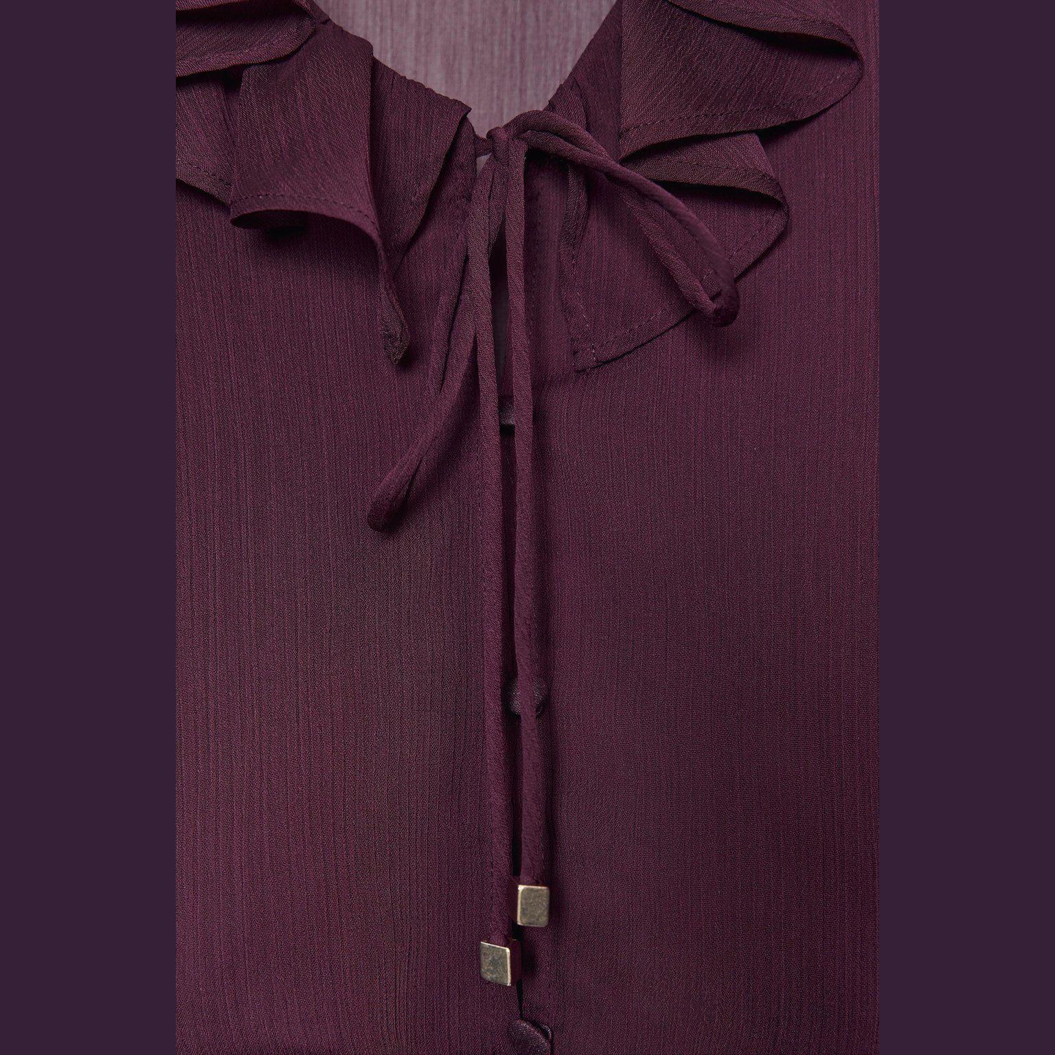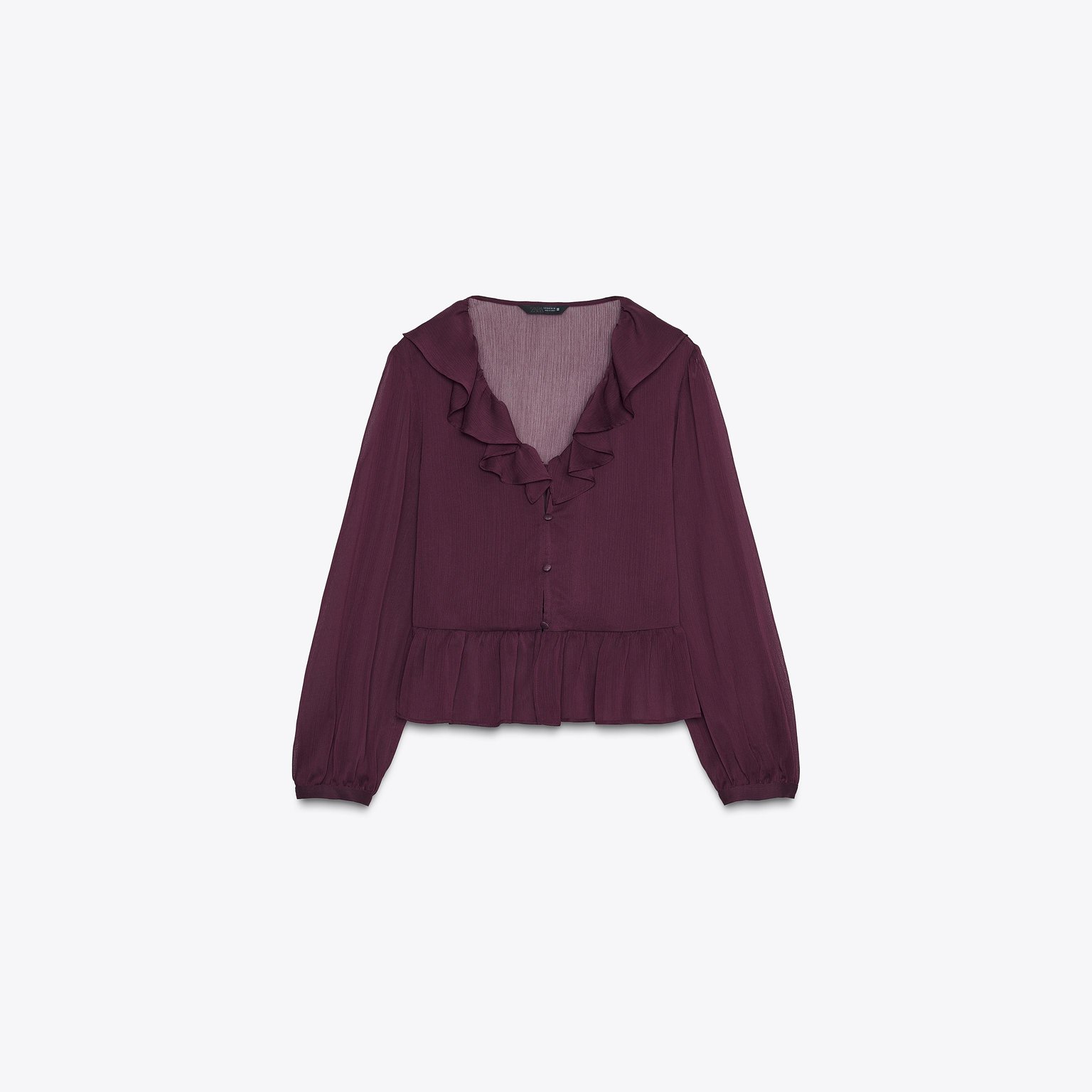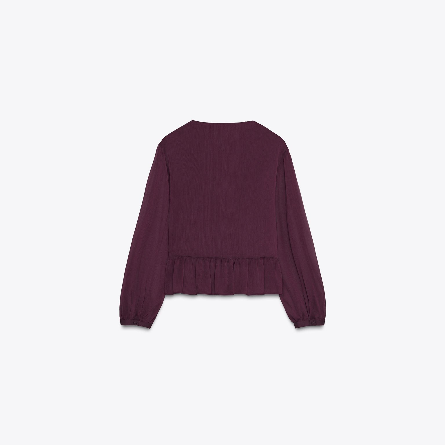 بلوزة بكشكش مع ياقة V – لون باذنجاني – Aubergine (Ruffled Blouse) بلوزة أنيقة بتصميم ناعم، تتميز بياقة V وأكمام طويلة مع أساور، إضافة إلى كشكش رقيق يمنح حركة وانسيابية للتصميم. تأتي بإغلاق أمامي بأزرار مغطّاة من نفس القماش لمظهر نظيف وراقي يناسب الإطلالات اليومية والكاجوال الأنيقة.
