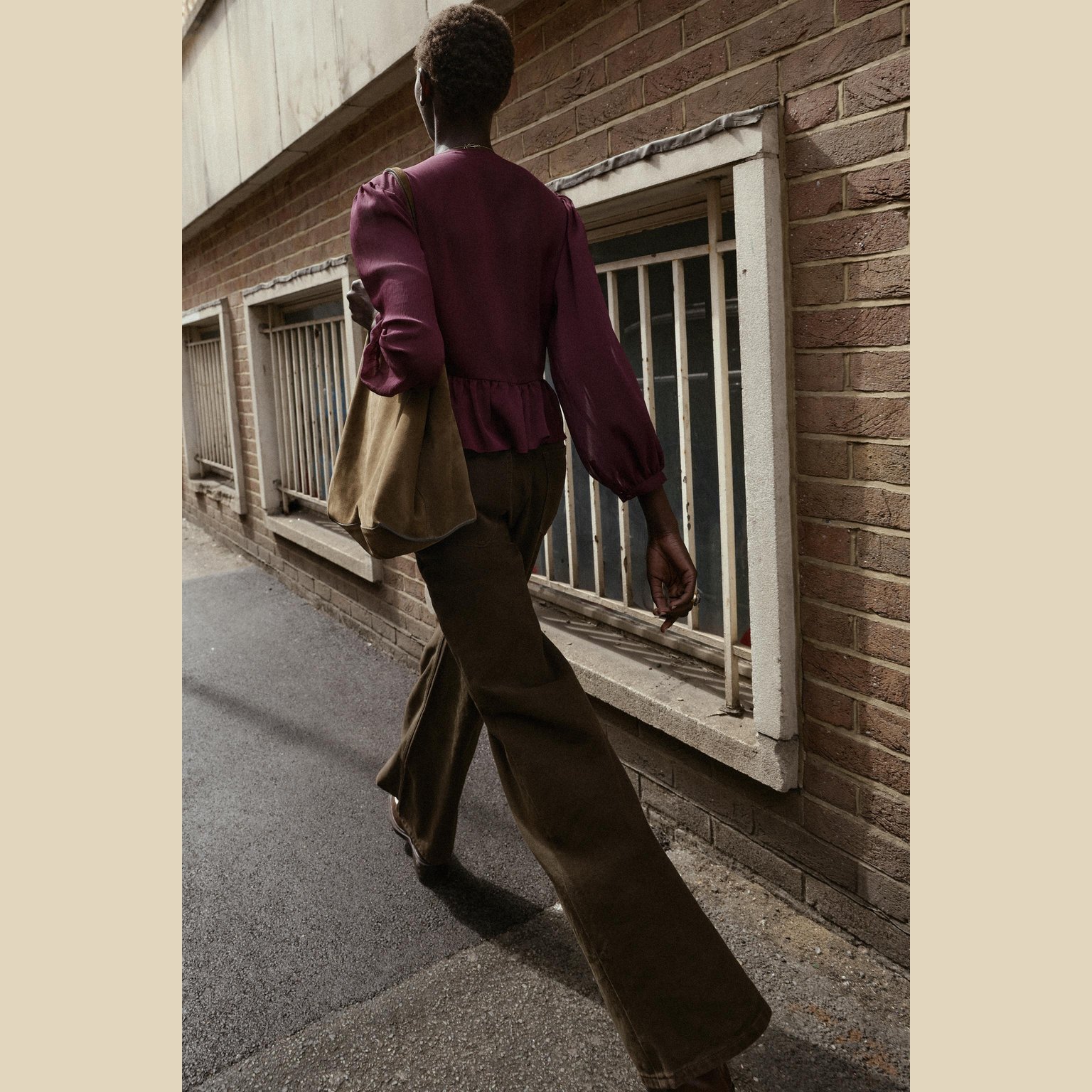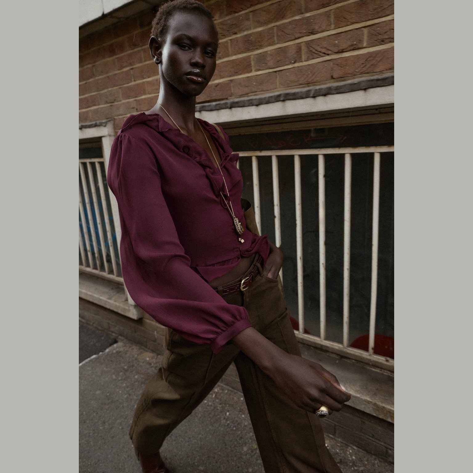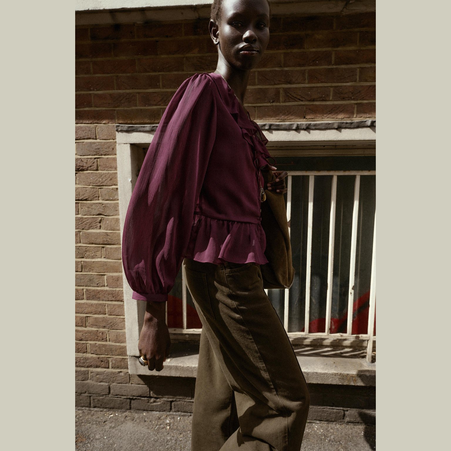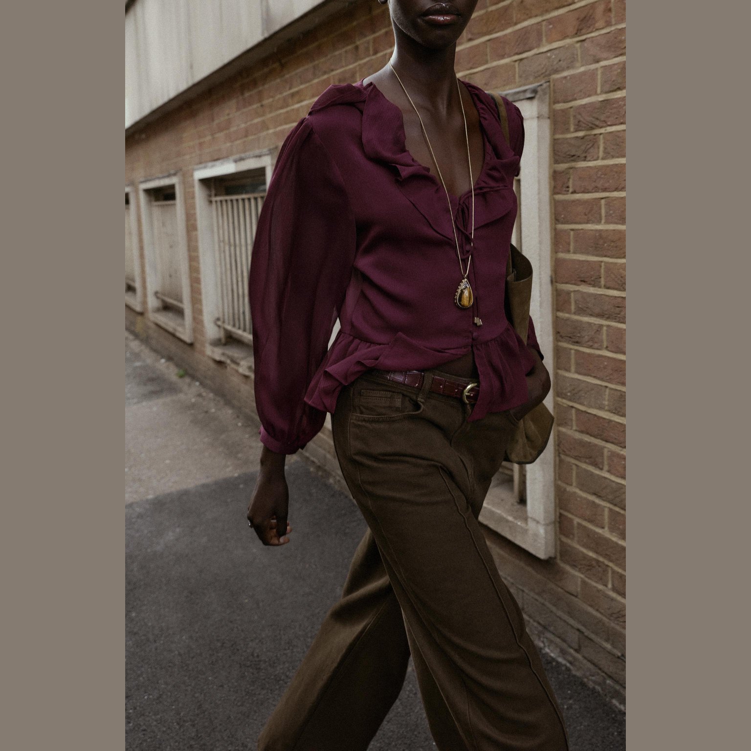 بلوزة بكشكش مع ياقة V – لون باذنجاني – Aubergine (Ruffled Blouse) بلوزة أنيقة بتصميم ناعم، تتميز بياقة V وأكمام طويلة مع أساور، إضافة إلى كشكش رقيق يمنح حركة وانسيابية للتصميم. تأتي بإغلاق أمامي بأزرار مغطّاة من نفس القماش لمظهر نظيف وراقي يناسب الإطلالات اليومية والكاجوال الأنيقة.
