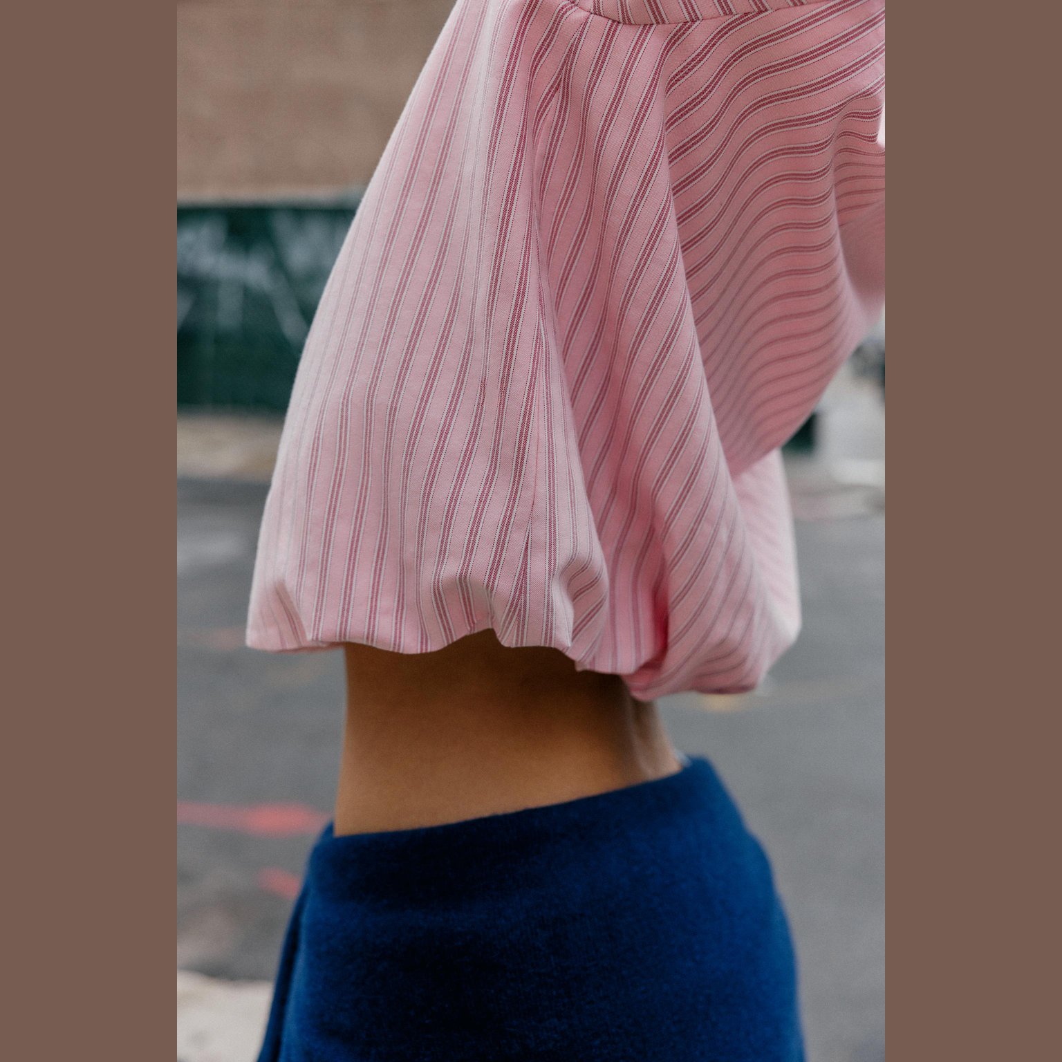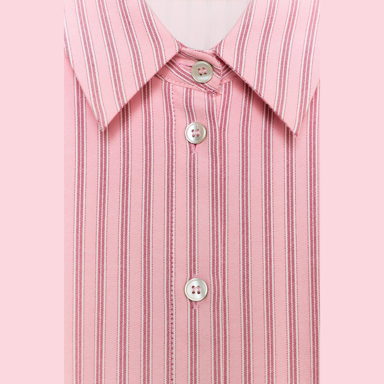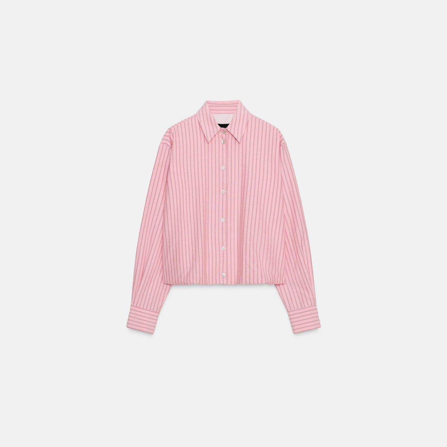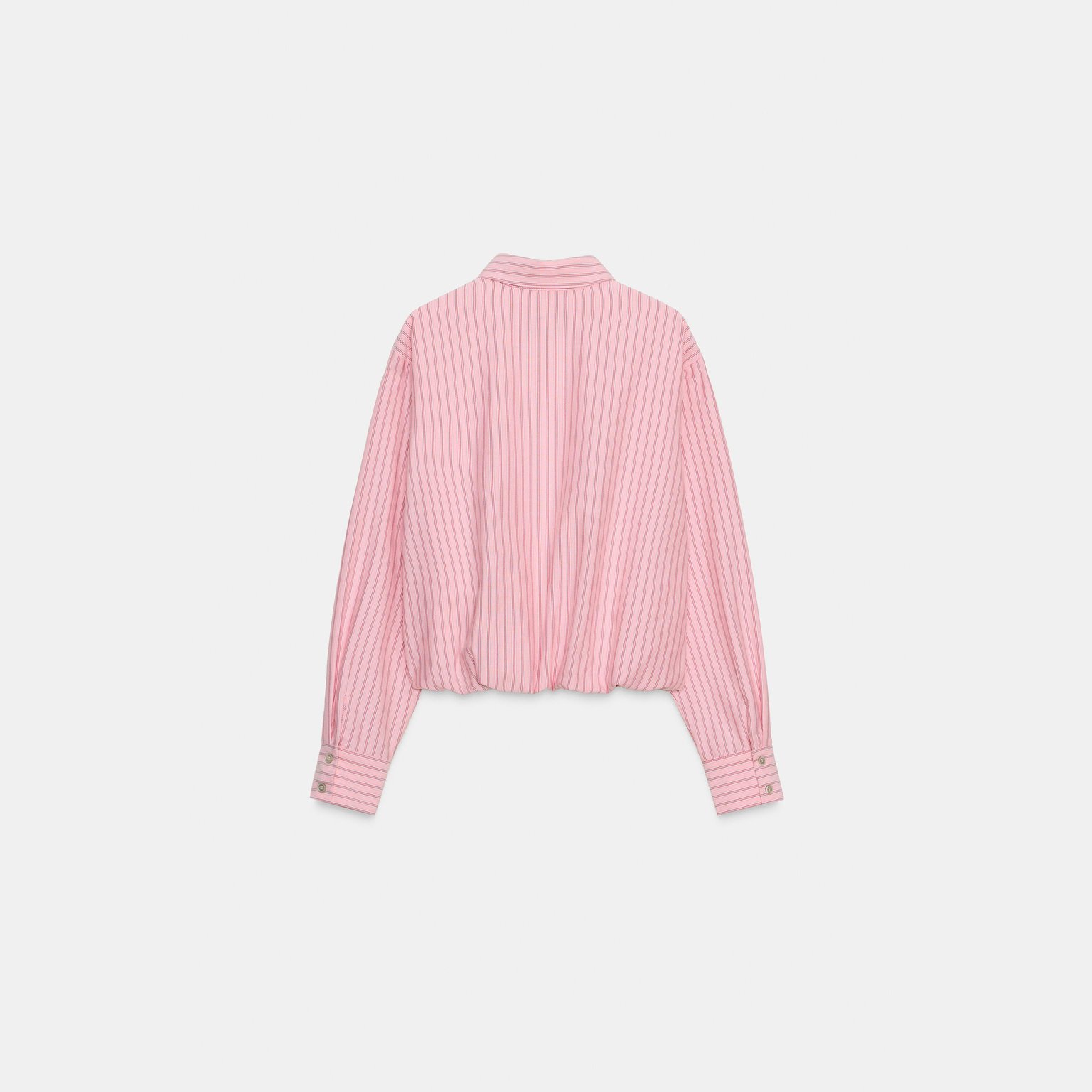 قميص أوكسفورد مخطّط بتصميم بالون – لون زهري/أبيض – Pink/White (Striped Balloon Oxford Shirt) قميص أنيق بتصميم مريح، يتميز بياقة لابيل وأكمام طويلة، مع حافة سفلية مزوّدة بمطاط داخلي يمنح شكل بالون جذابًا. يأتي بإغلاق أمامي كامل بأزرار، مما يجعله خيارًا مثاليًا للإطلالات اليومية والكاجوال الأنيقة.