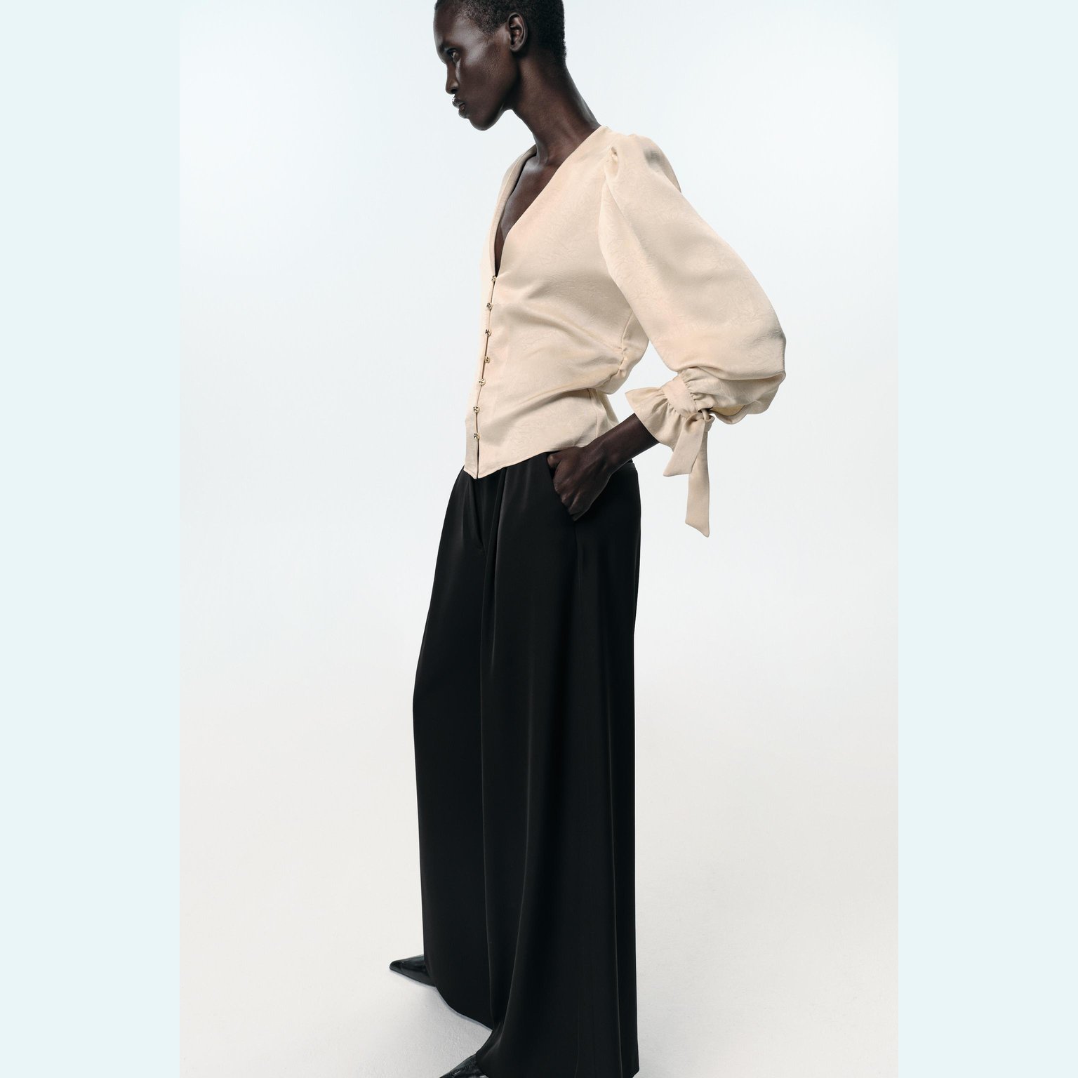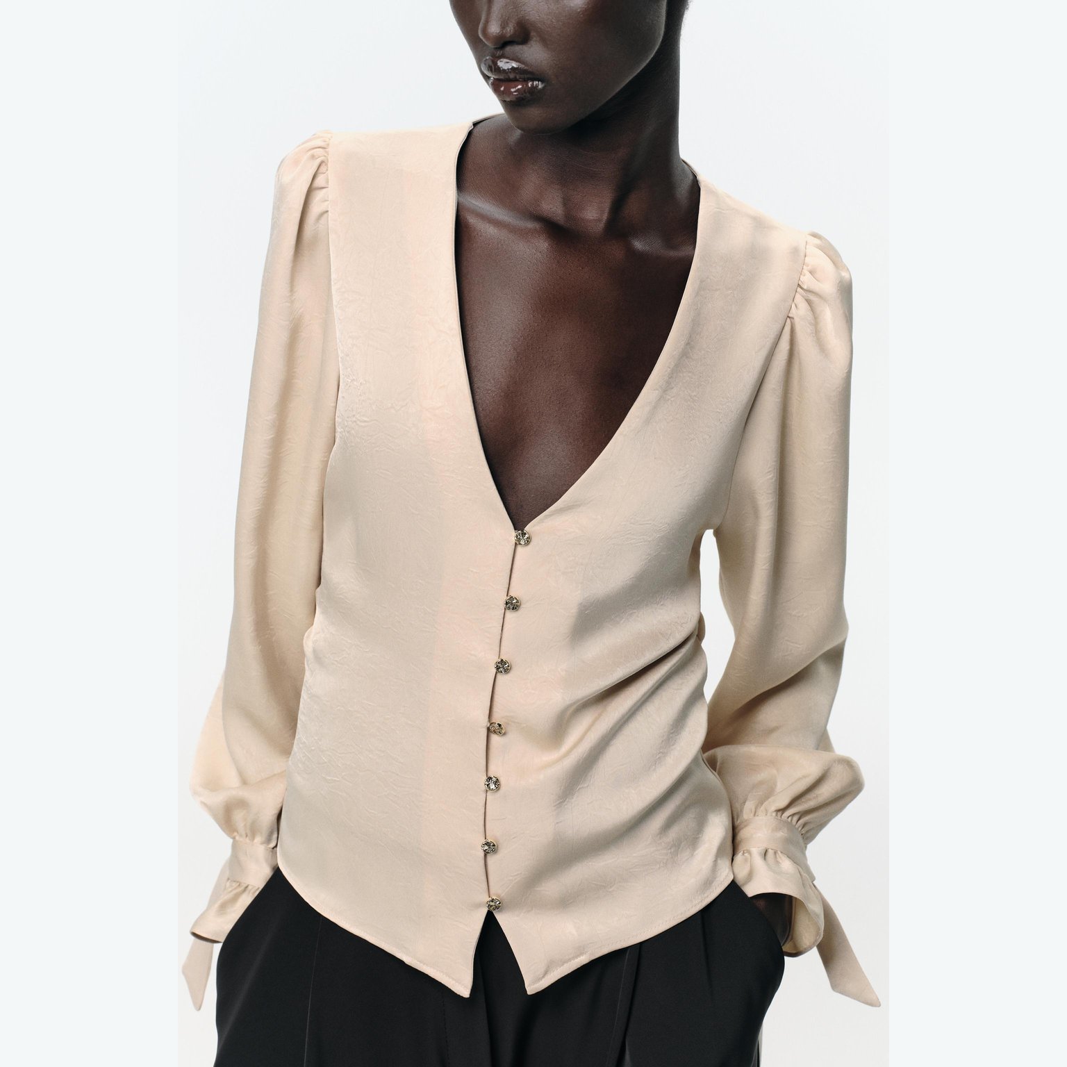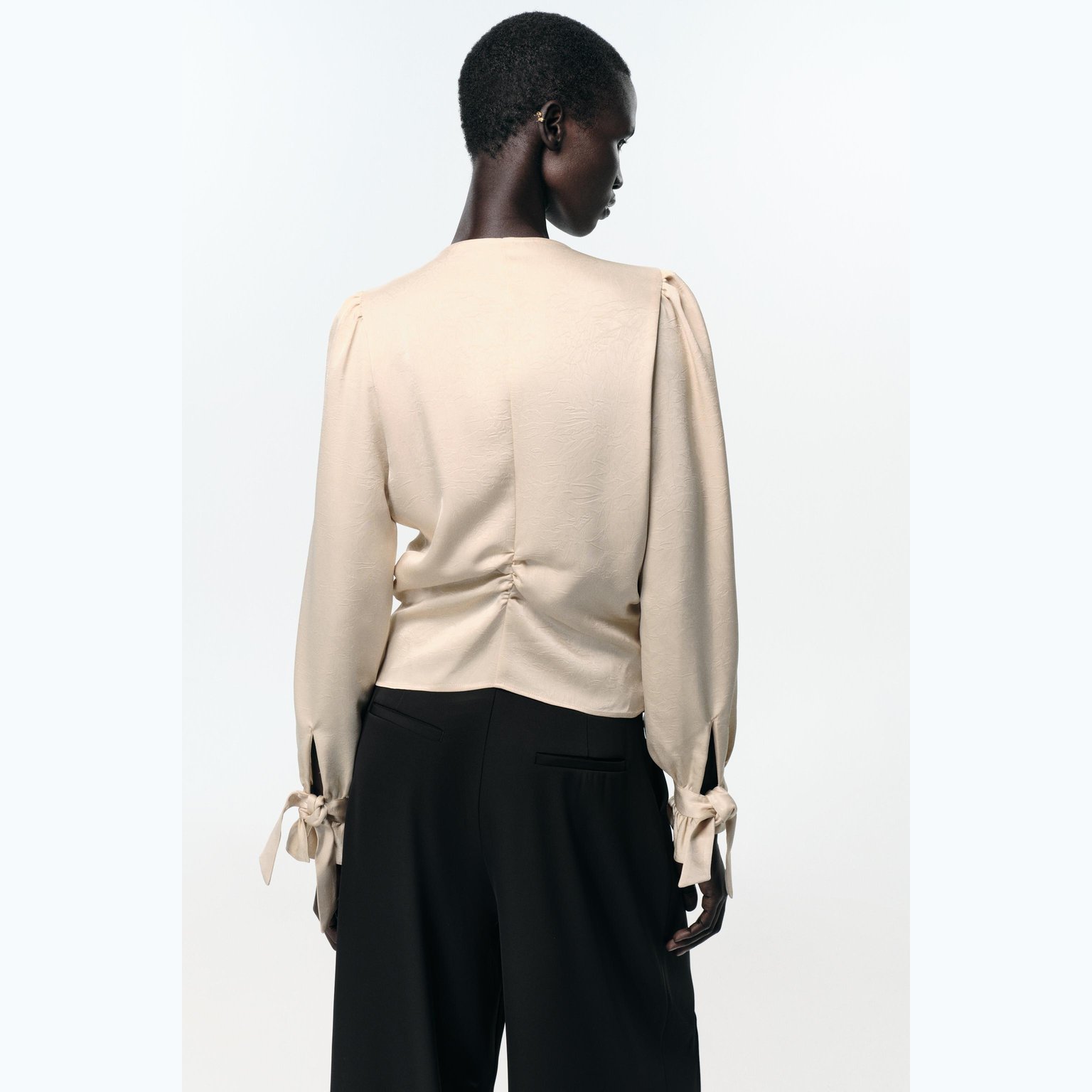 بلوزة ساتان بقصّة ضيّقة مع تأثير مجعّد – لون إيكرُو – Ecru (Fitted Creased‑Effect Blouse) بلوزة أنيقة بتصميم ناعم، تتميز بياقة V وأكمام طويلة مع أكتاف منفوشة تضيف لمسة راقية. تأتي بربطة على الكُفّ وكشكش جانبي يمنح انسيابية جميلة، إضافة إلى قماش ساتان بتأثير مجعّد يمنح مظهرًا عصريًا. الإغلاق أمامي كامل بأزرار لمظهر نظيف وعملي يناسب الإطلالات اليومية والكاجوال الأنيقة.