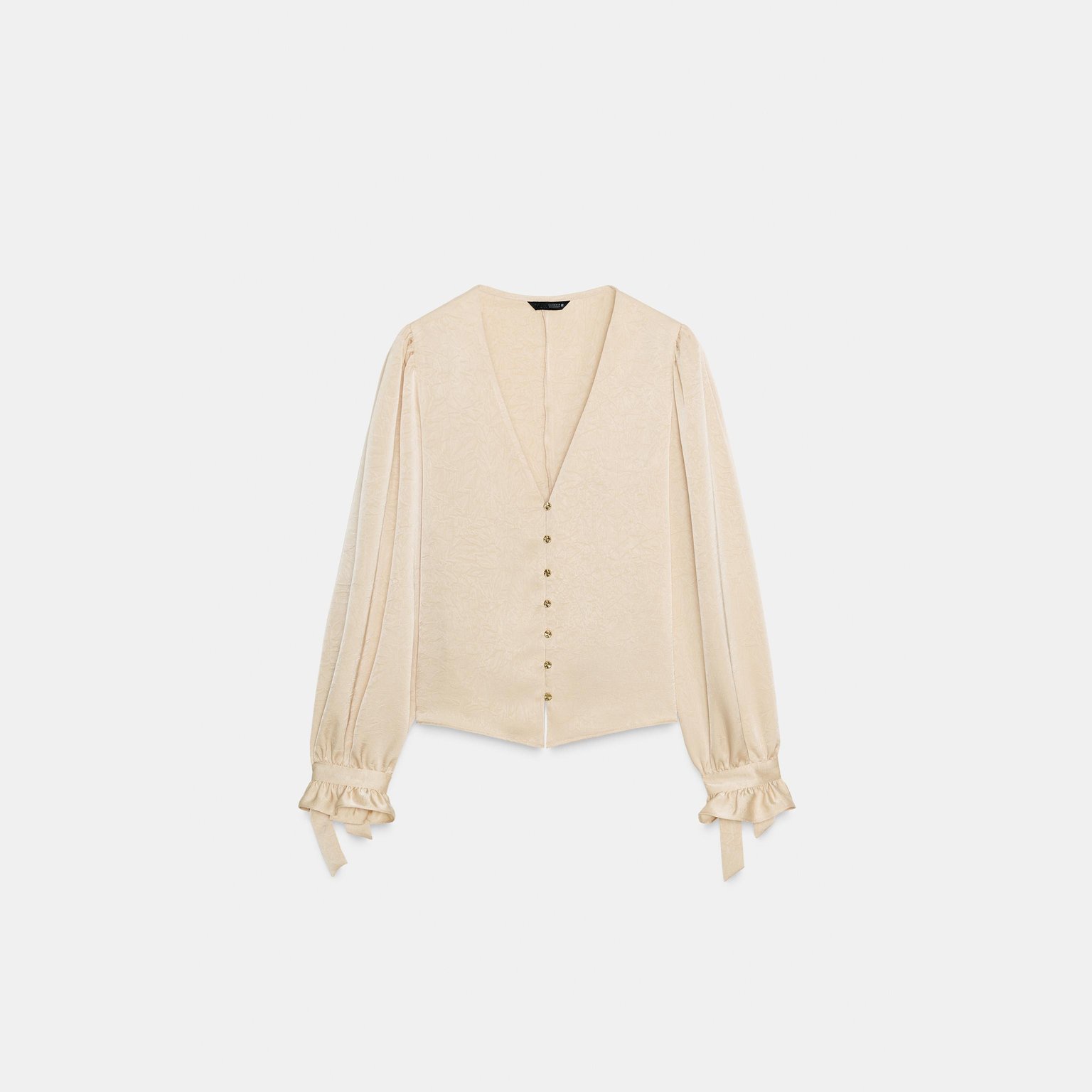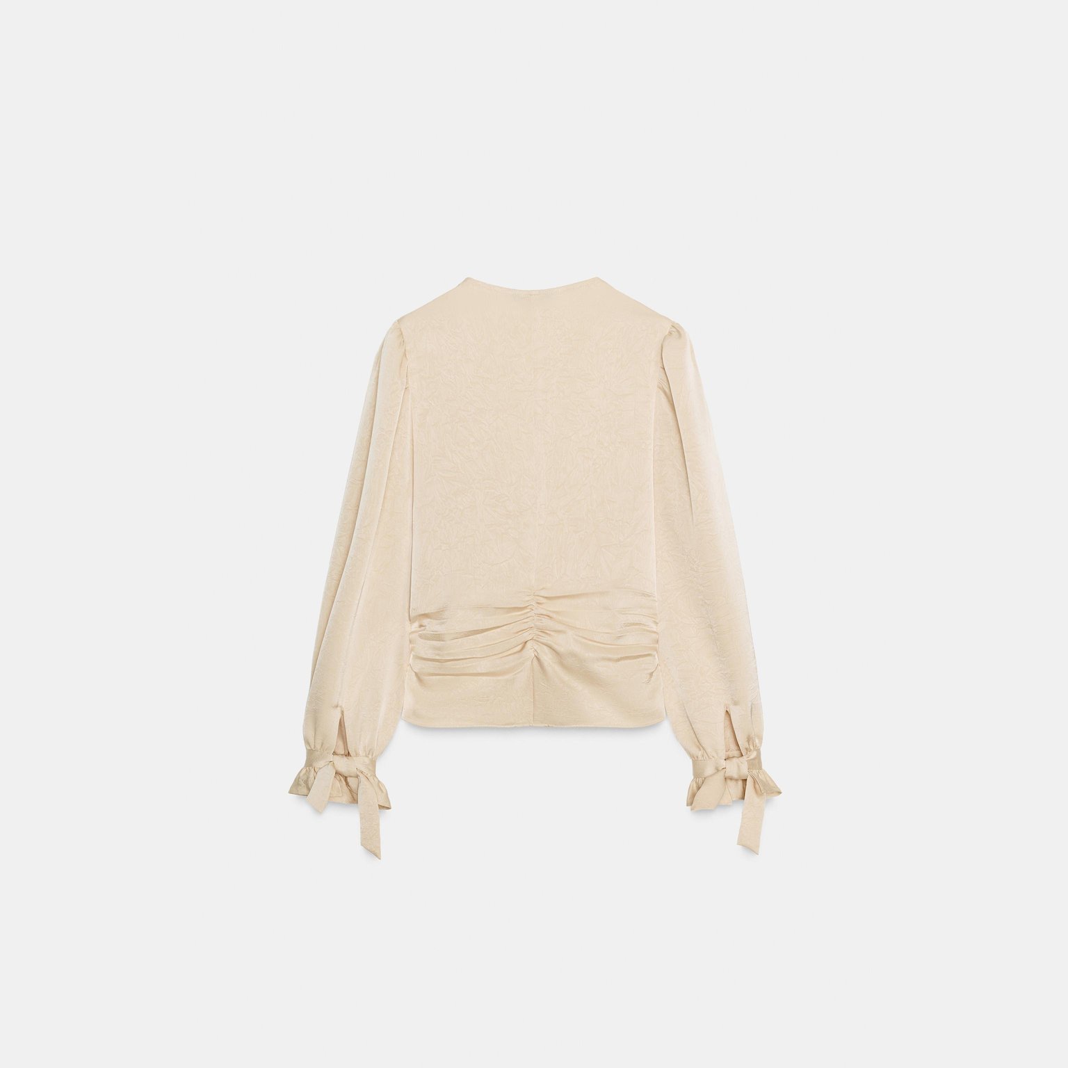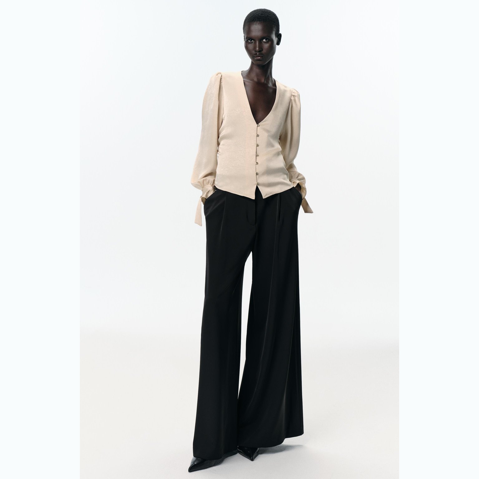 بلوزة ساتان بقصّة ضيّقة مع تأثير مجعّد – لون إيكرُو – Ecru (Fitted Creased‑Effect Blouse) بلوزة أنيقة بتصميم ناعم، تتميز بياقة V وأكمام طويلة مع أكتاف منفوشة تضيف لمسة راقية. تأتي بربطة على الكُفّ وكشكش جانبي يمنح انسيابية جميلة، إضافة إلى قماش ساتان بتأثير مجعّد يمنح مظهرًا عصريًا. الإغلاق أمامي كامل بأزرار لمظهر نظيف وعملي يناسب الإطلالات اليومية والكاجوال الأنيقة.