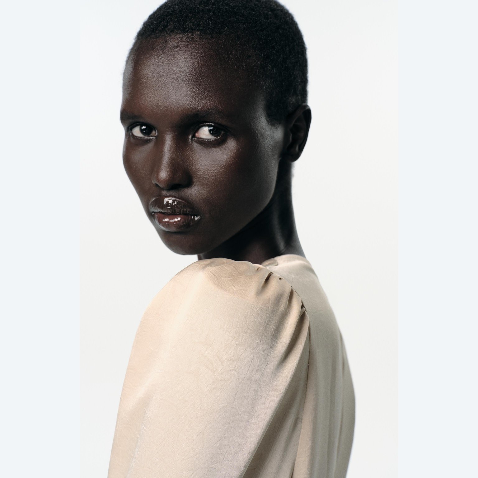 - القماش: ساتان بتأثير مجعّد – Creased‑Effect Satin