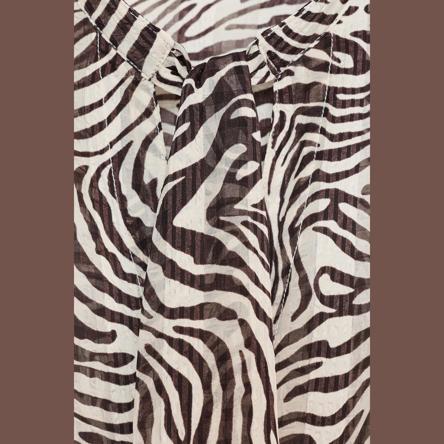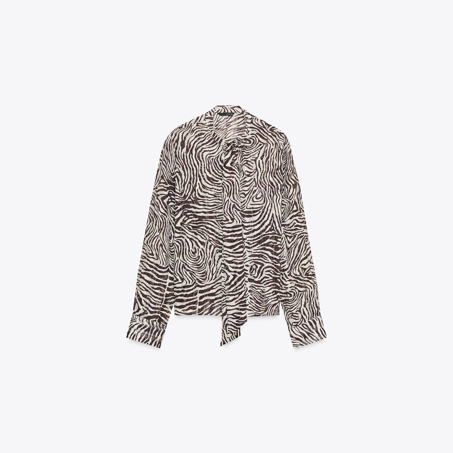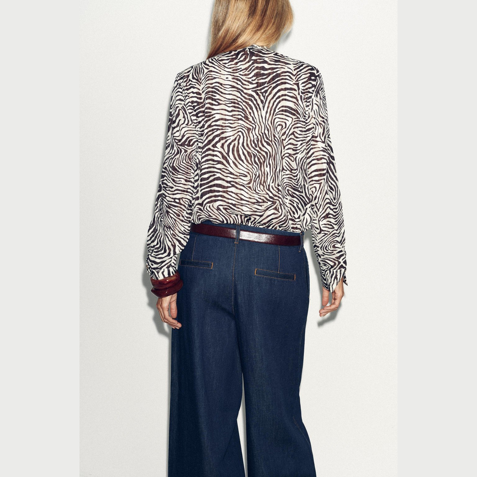 بلوزة بنقشة حيوانية مع ربطة أمامية – Zebra (Animal Print Blouse with Bow) بلوزة أنيقة بتصميم مميز، تجمع بين ياقة دائرية وفتحة V مزوّدة بربطة تضيف لمسة أنثوية راقية. تأتي بأكمام طويلة مع أساور بأزرار، إضافة إلى إغلاق أمامي كامل بأزرار لمظهر نظيف وعملي يناسب الإطلالات اليومية والكاجوال الأنيقة.