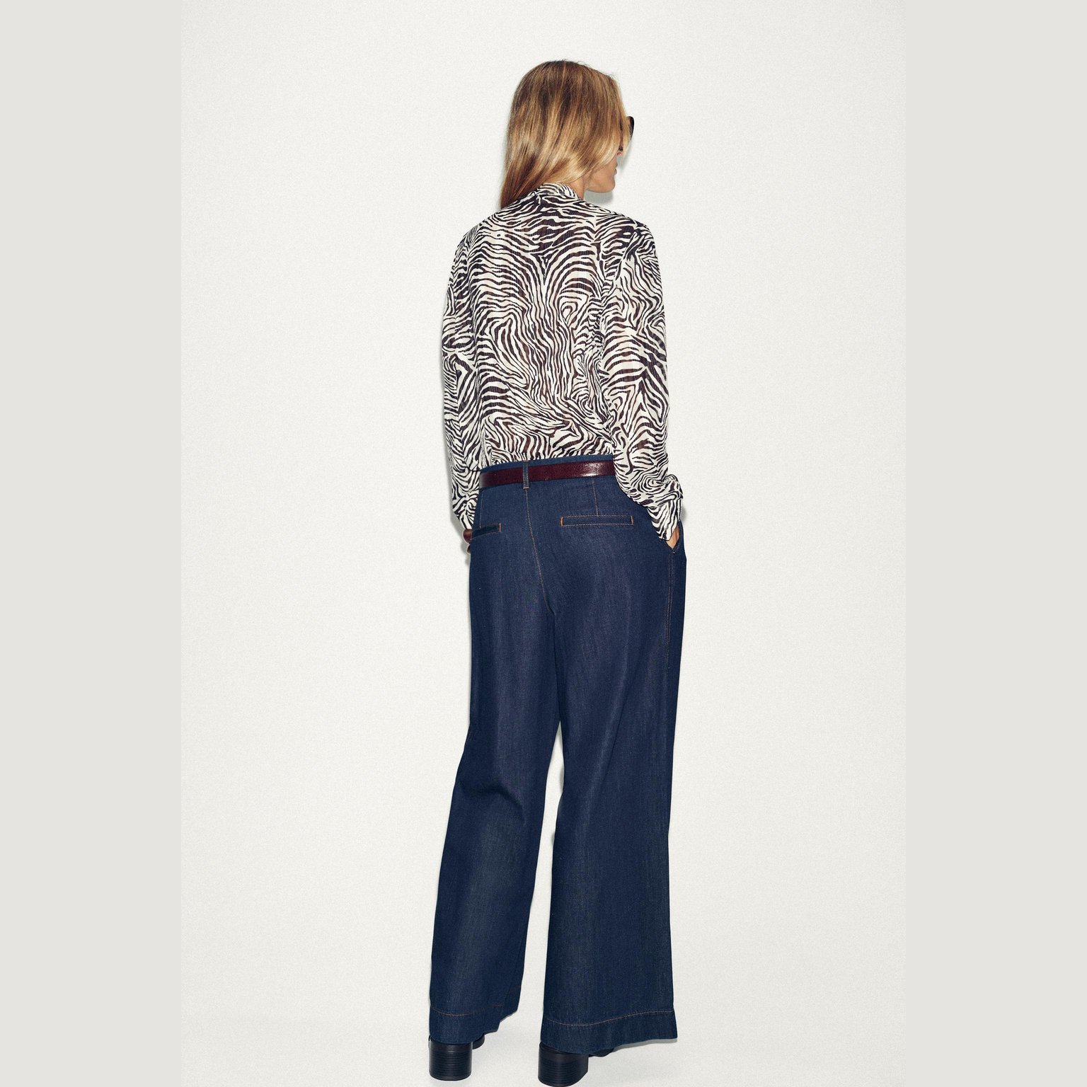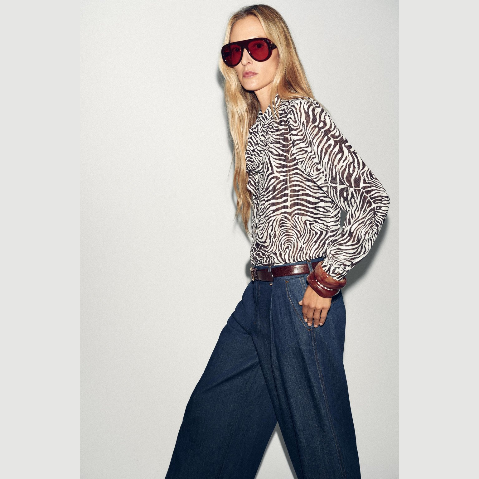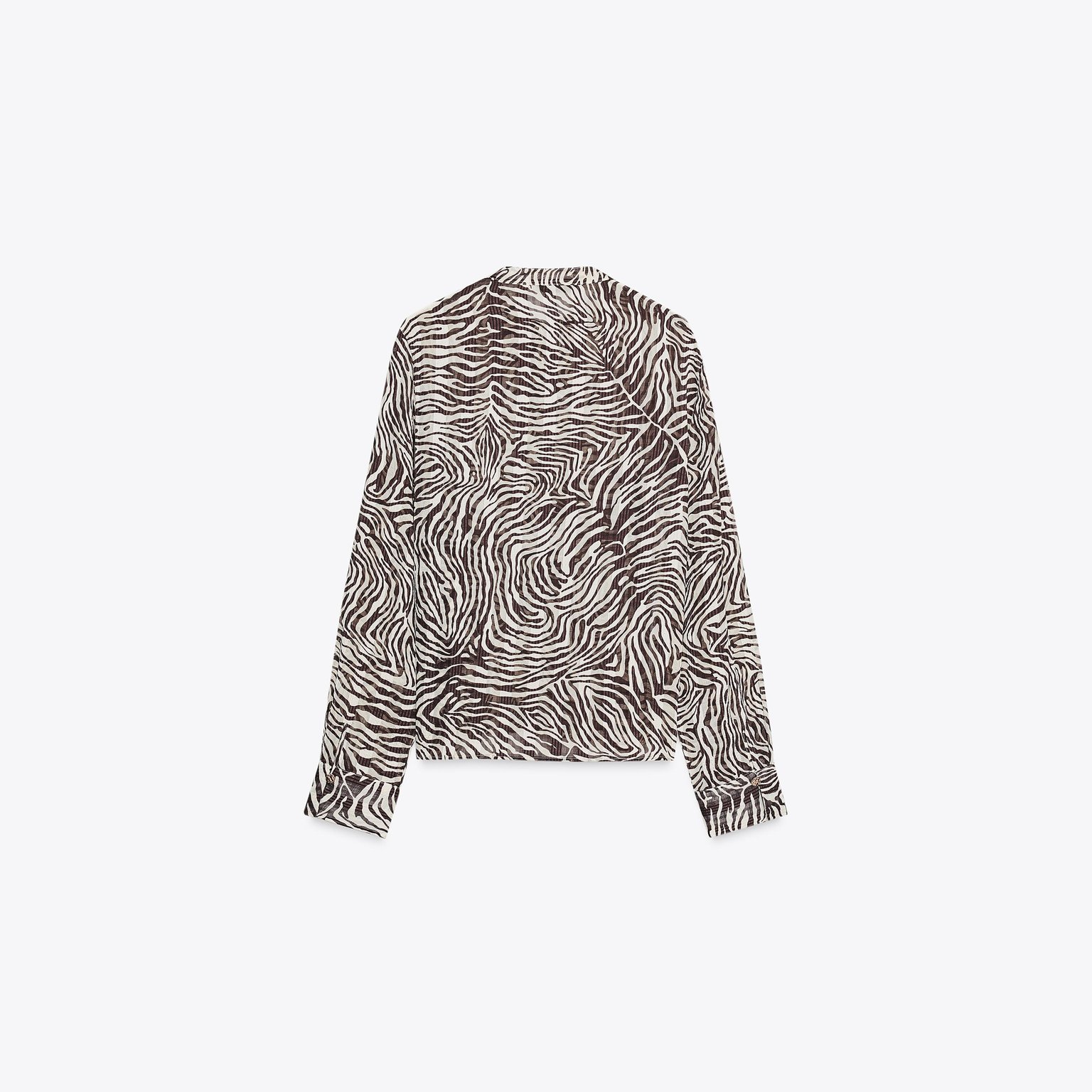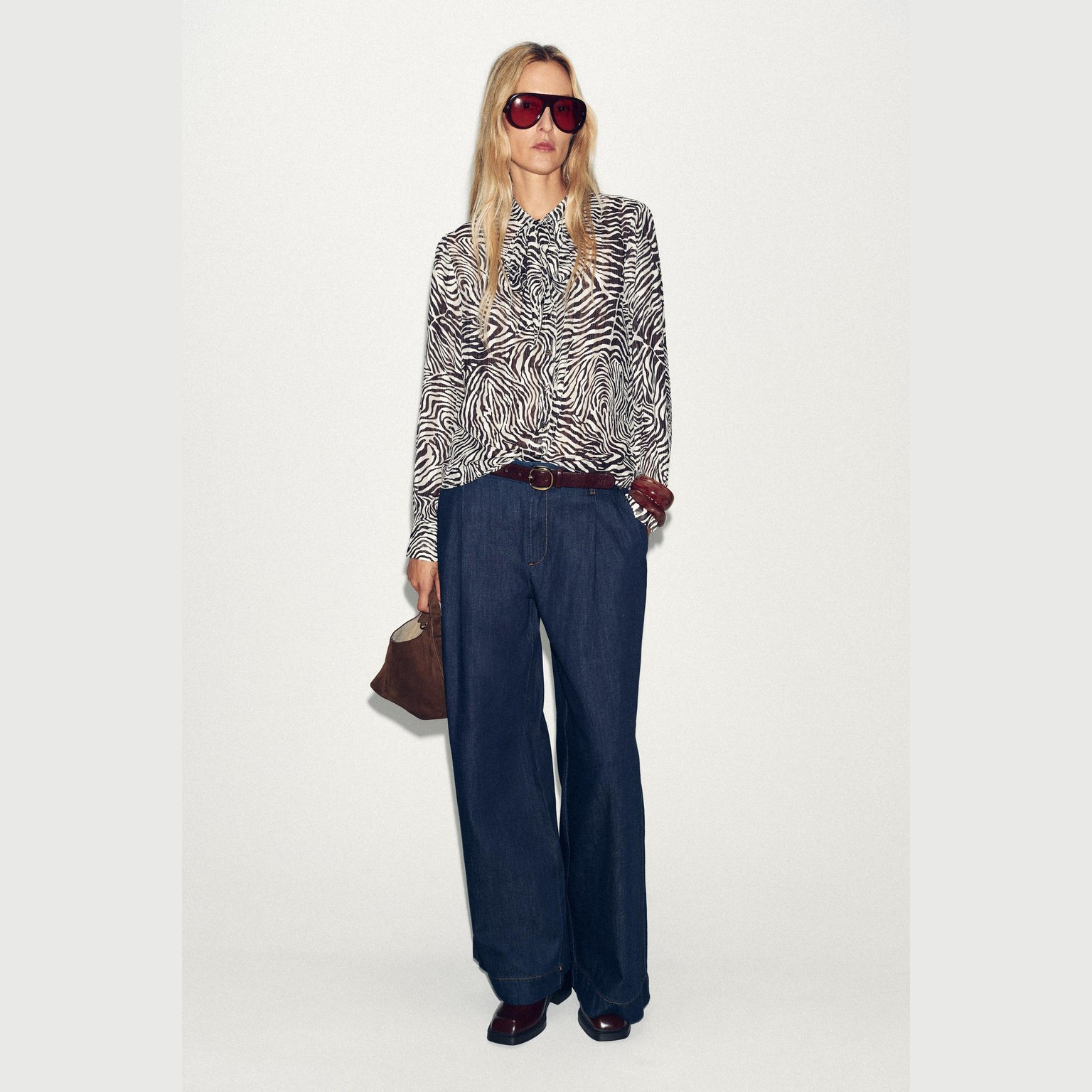 بلوزة بنقشة حيوانية مع ربطة أمامية – Zebra (Animal Print Blouse with Bow) بلوزة أنيقة بتصميم مميز، تجمع بين ياقة دائرية وفتحة V مزوّدة بربطة تضيف لمسة أنثوية راقية. تأتي بأكمام طويلة مع أساور بأزرار، إضافة إلى إغلاق أمامي كامل بأزرار لمظهر نظيف وعملي يناسب الإطلالات اليومية والكاجوال الأنيقة.