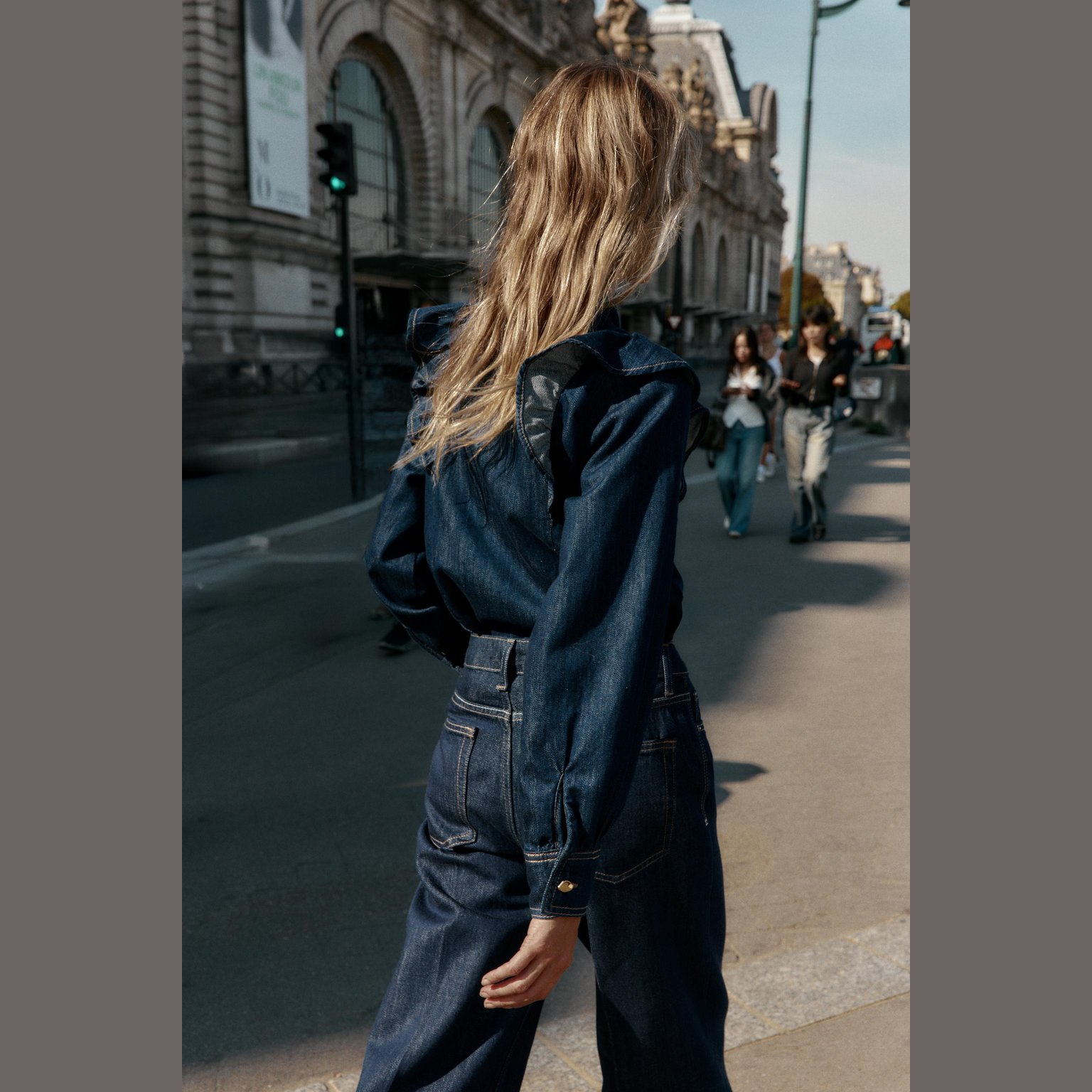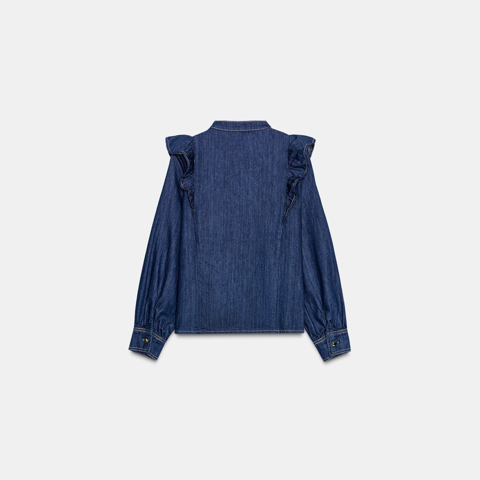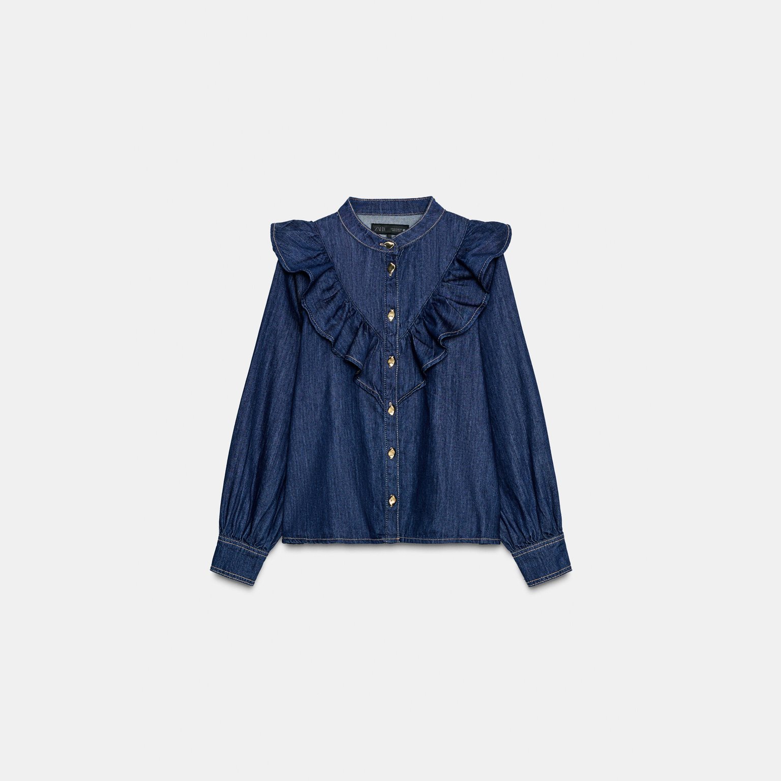 قميص دنيم بياقة دائرية مع كشكش – لون أزرق – Blue (Z1975 Denim Shirt with Ruffles) قميص دنيم أنيق بتصميم ناعم، يتميز بياقة دائرية وأكمام طويلة، مع تفاصيل كشكش تضيف لمسة أنثوية رقيقة. يأتي بإغلاق أمامي كامل بأزرار، مما يجعله خيارًا عمليًا ومناسبًا للإطلالات اليومية والكاجوال.
