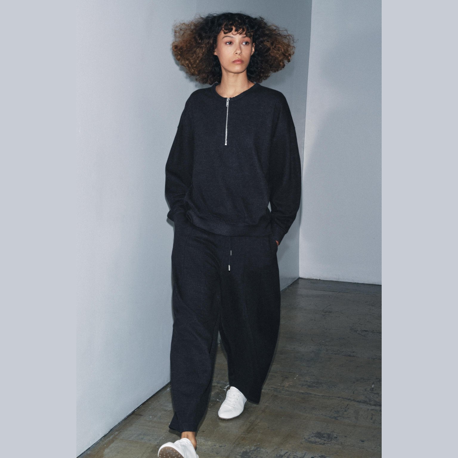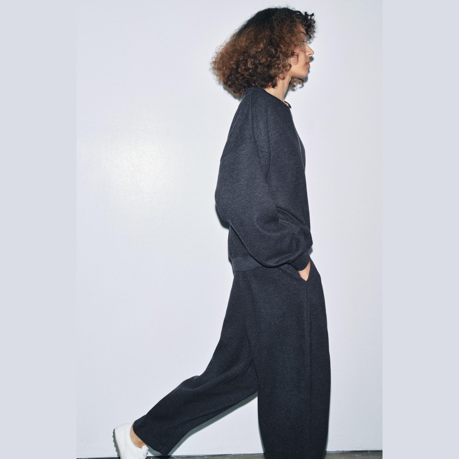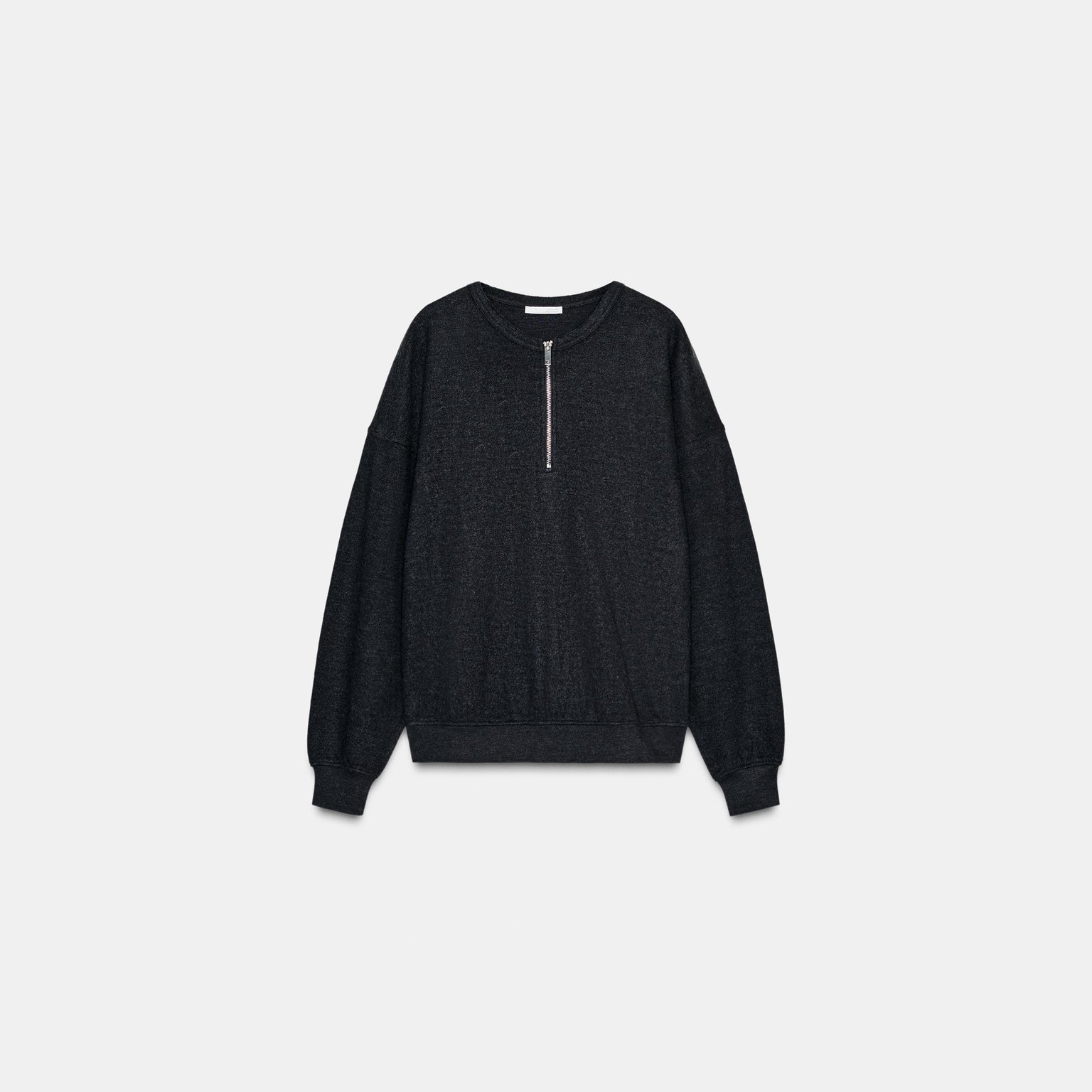 سويتشيرت ناعم بخامة مريحة وتصميم عملي يأتي بياقة مستديرة وأكمام طويلة مع سحاب أمامي كامل، يتميز بملمس ريب مرن يمنح راحة إضافية وأناقة بسيطة، مما يجعله مناسبًا للإطلالات اليومية والكاجوال.