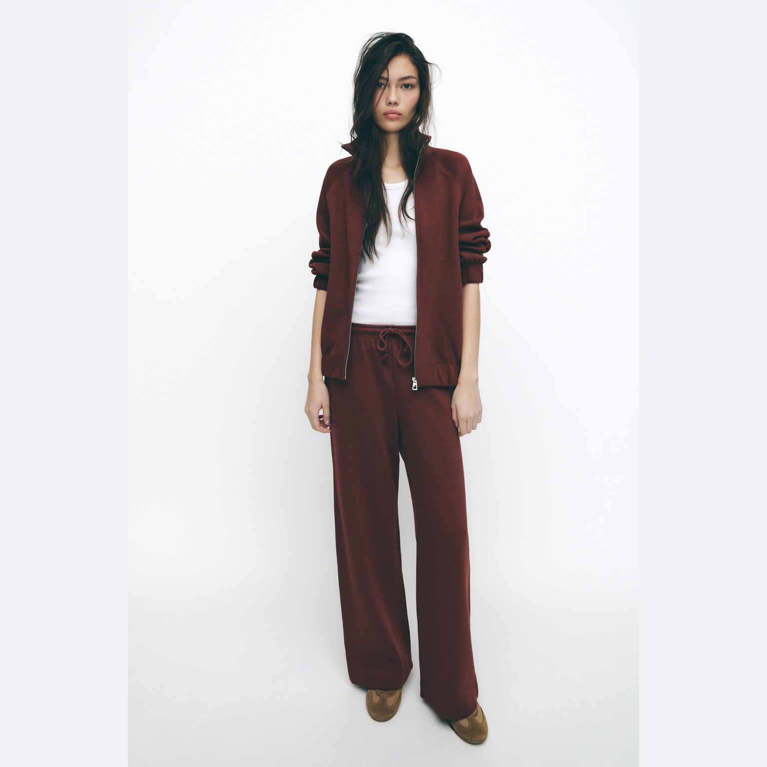 سويتشيرت ناعم بخامة مريحة وتصميم عملي يأتي بياقة مستديرة وأكمام طويلة مع سحاب أمامي كامل، يتميز بملمس ريب مرن يمنح راحة إضافية وأناقة بسيطة، مما يجعله مناسبًا للإطلالات اليومية والكاجوال.