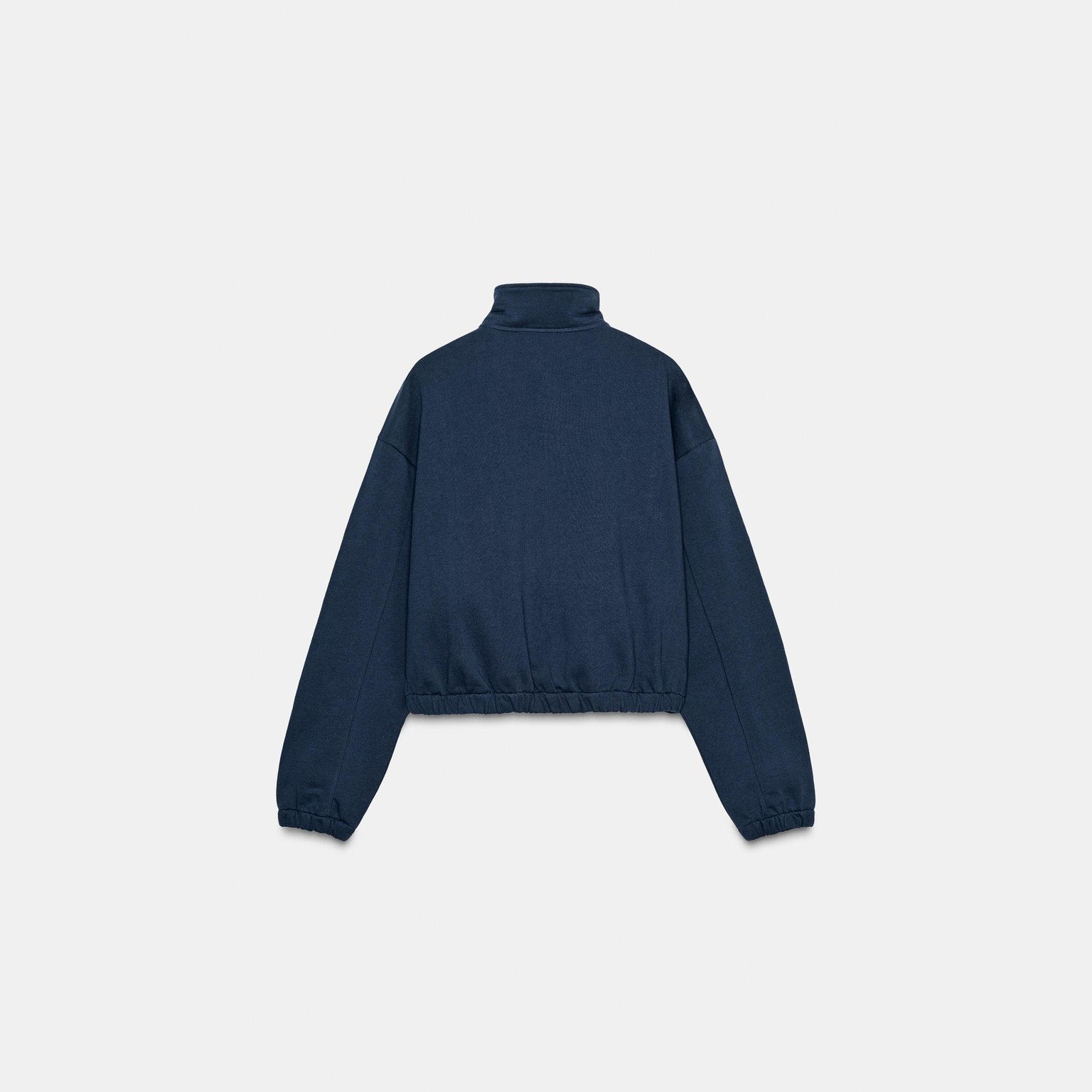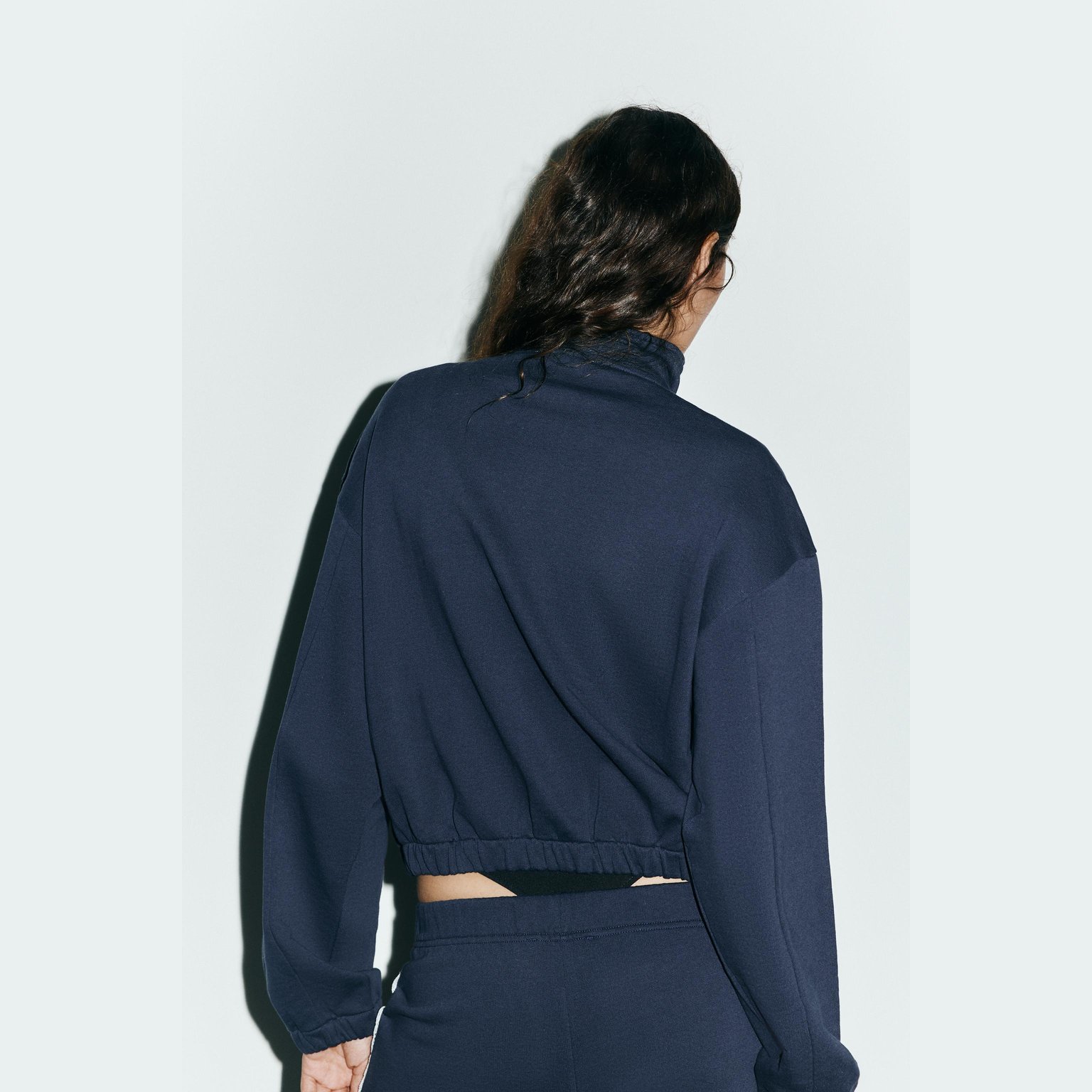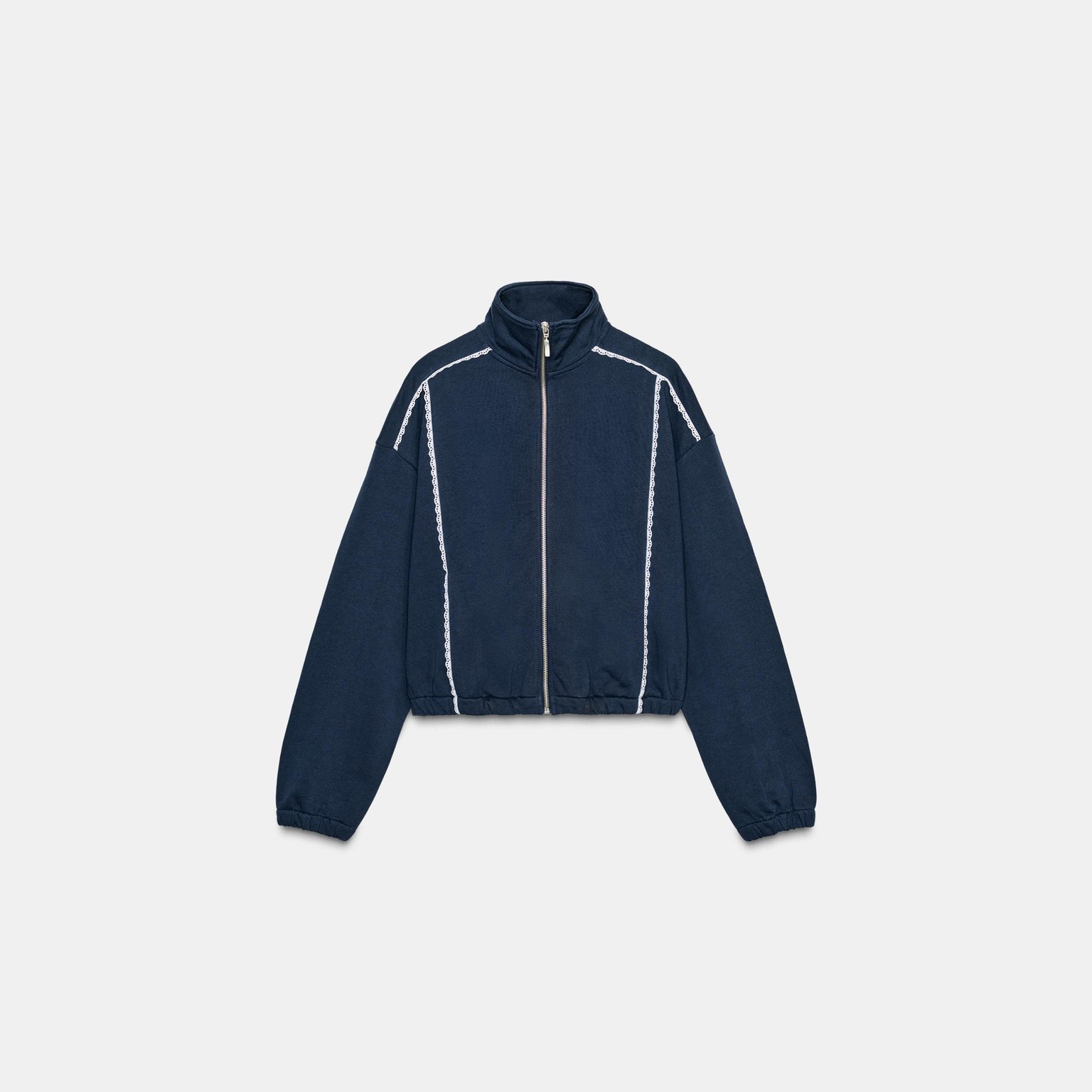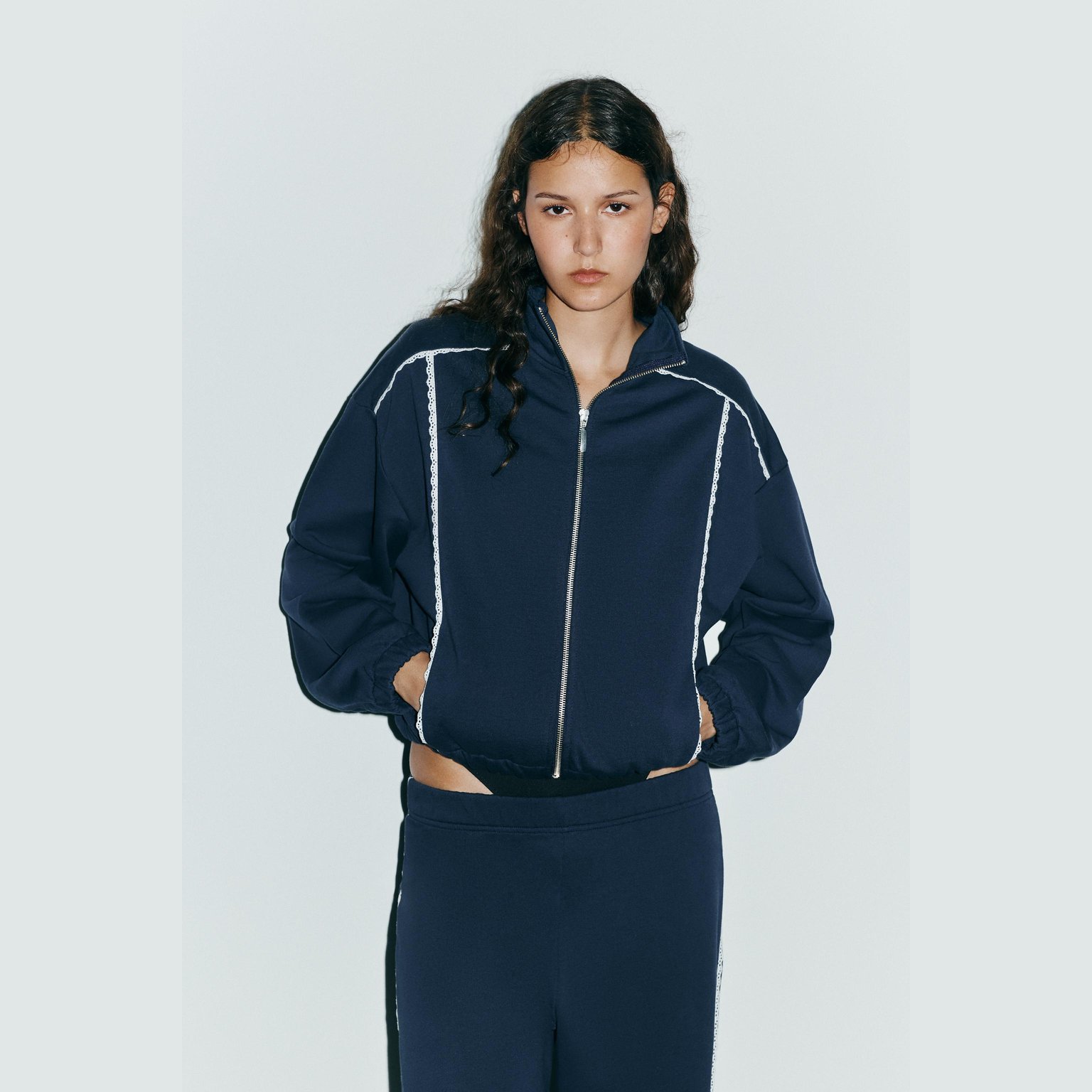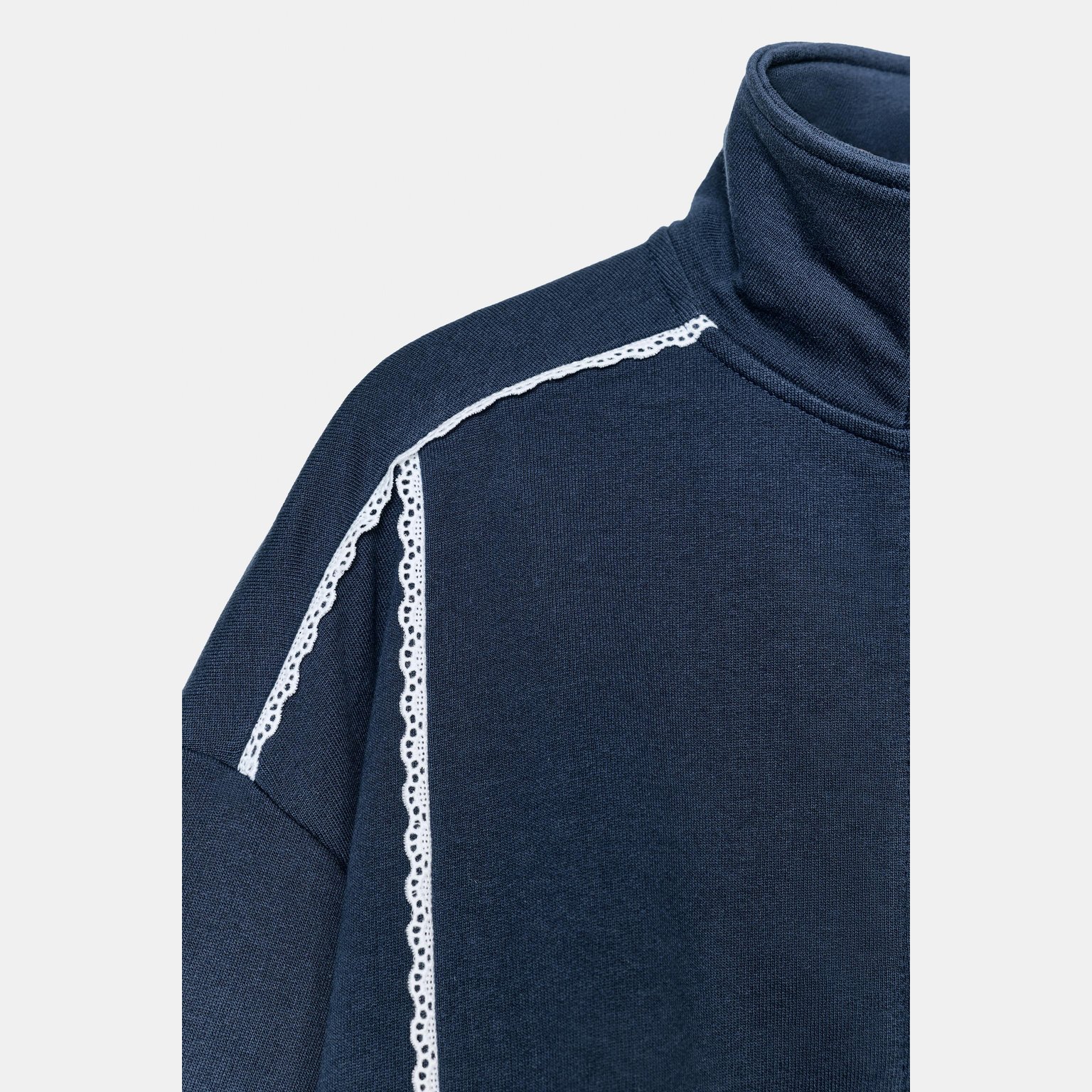 سويتشيرت مريح بتصميم عصري يأتي بياقة عالية وأكمام طويلة مع أساور مطاطية، يتميز بتفصيلة دانتيل متباينة تضيف لمسة أنثوية ناعمة، إضافة إلى سحاب أمامي يمنح عملية وأناقة بسيطة مناسبة للإطلالات اليومية والكاجوال.