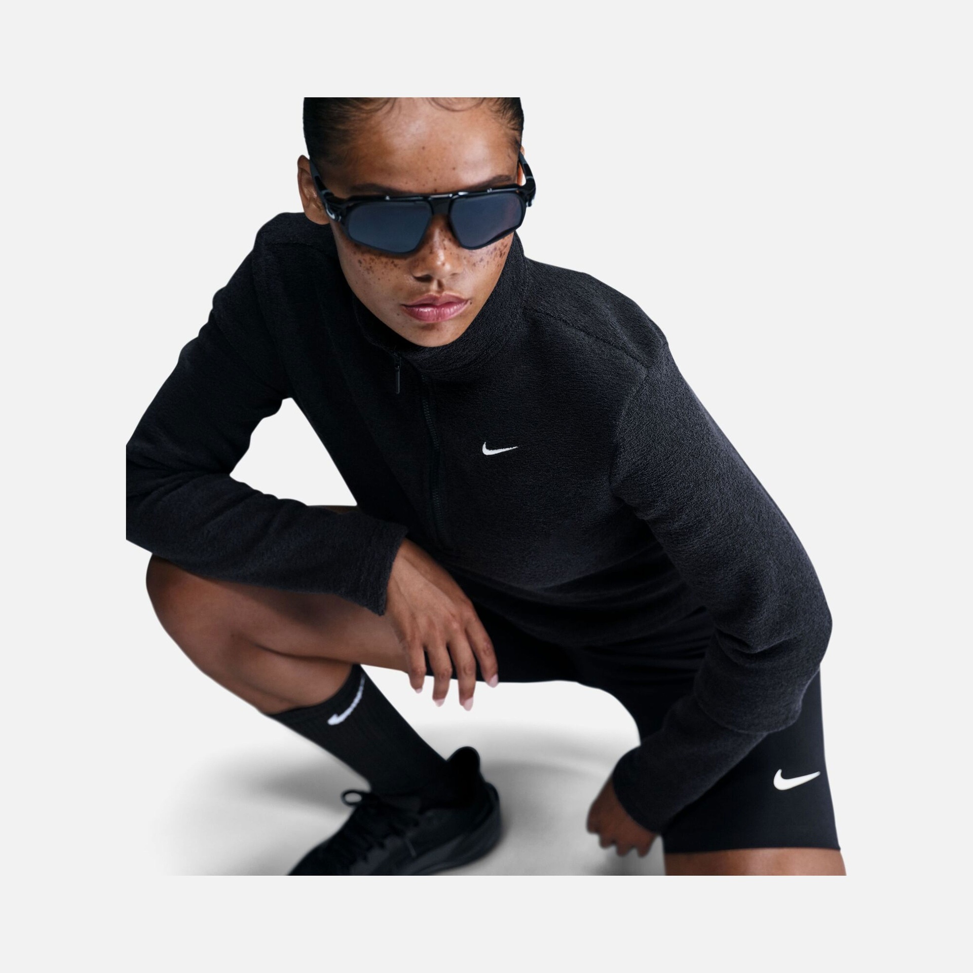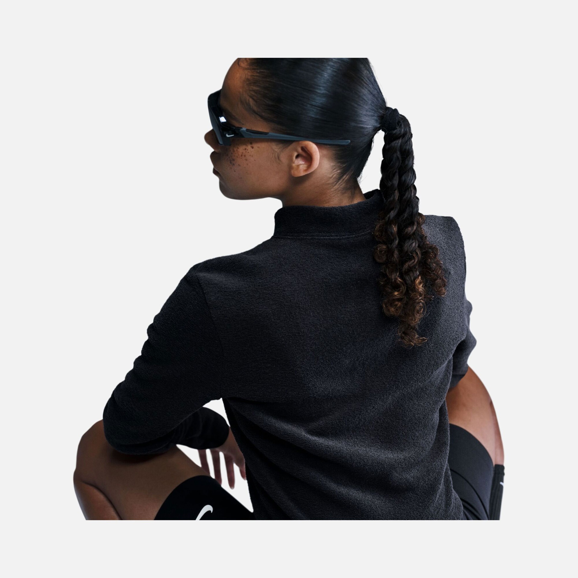 • تفاصيل التصميم: ياقة مرتفعة مزودة بسحاب نصفي وشعار نايكي (Swoosh) مطرز على الصدر.