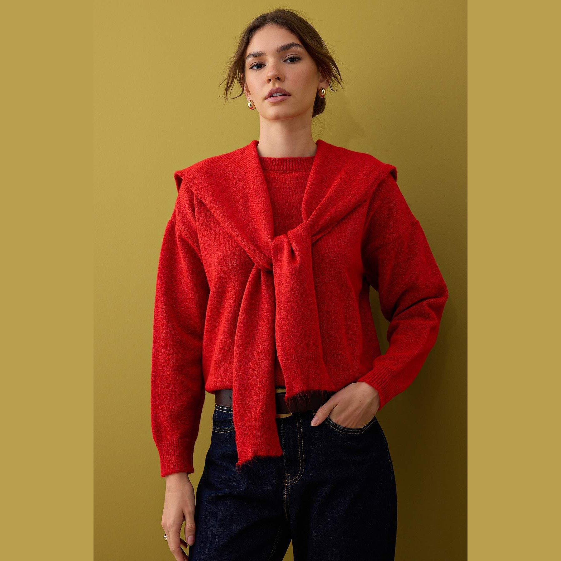 أضيفي لمسة من الدفء والأناقة الاستثنائية إلى خزانة ملابسك الشتوية مع كنزة التريكو الفاخرة من "ترينديل ميلا". تتميز هذه القطعة بتصميمها العصري الذي يجمع بين الراحة الفائقة والمظهر الجذاب، حيث يأتي الوشاح المتصل ليمنحكِ إطلالة متكاملة ودافئة دون عناء التنسيق. صُممت هذه الكنزة لتكون رفيقتكِ المثالية في الأيام الباردة، بفضل نسيجها الناعم جداً الذي يداعب بشرتكِ ويمنحكِ شعوراً بالرفاهية طوال اليوم، بينما يضفي اللون الأحمر الجريء لمسة من الحيوية والثقة على مظهركِ.