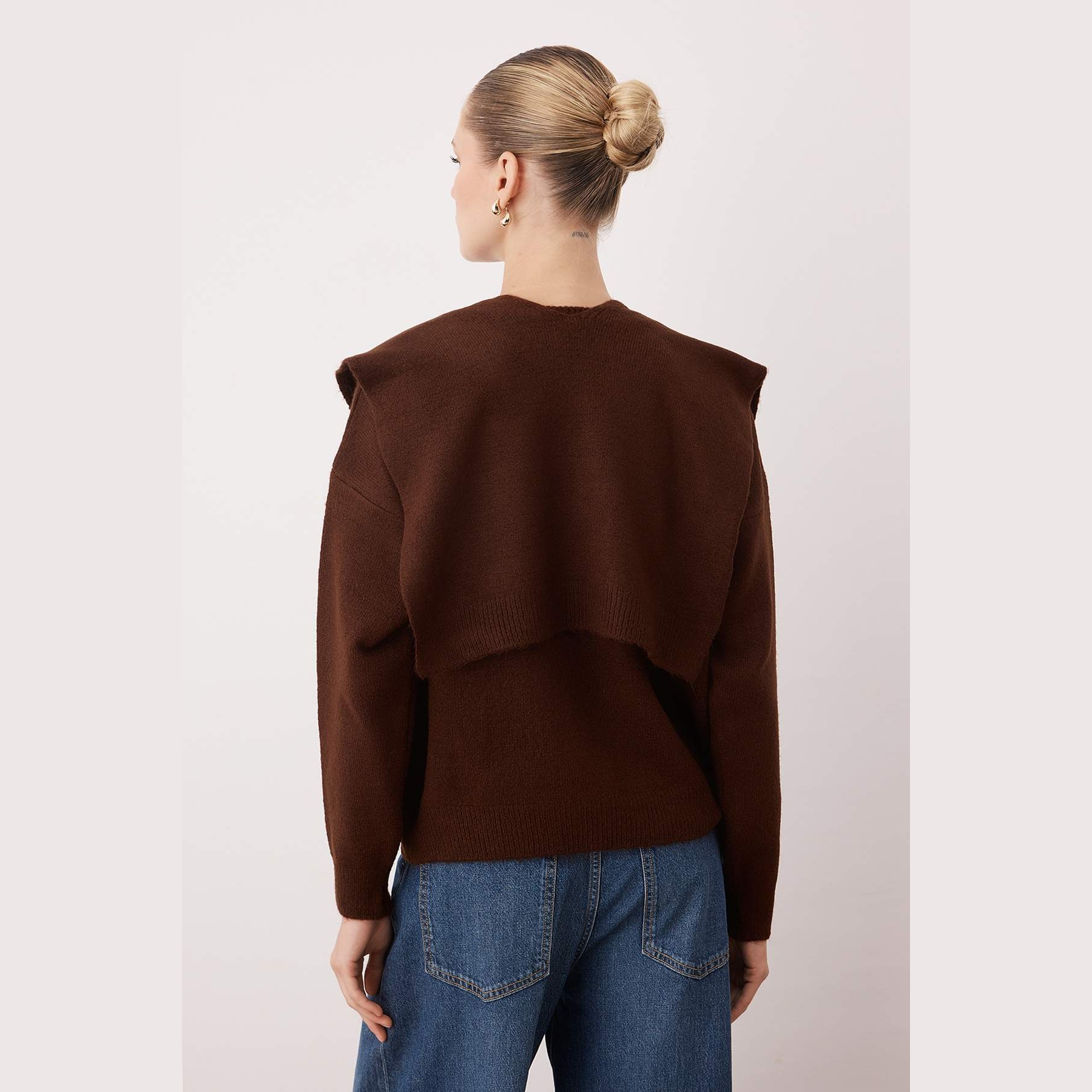 • تفاصيل التصميم: ياقة مستديرة (Bisiklet Yaka)، أكمام طويلة، وتصميم يجمع بين الكنزة والشال بأسلوب "شالي" فريد.