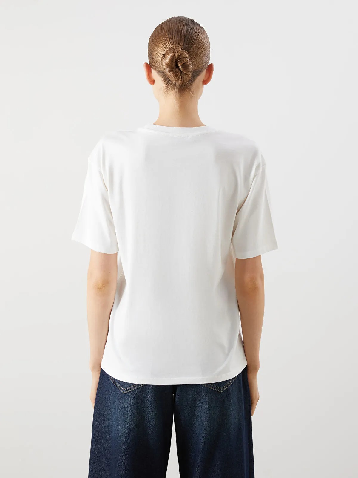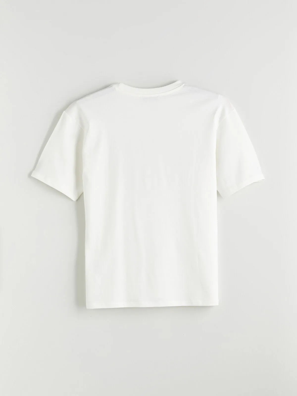 تيشيرت نسائي بلون بيج فاتح ناعم (Ekru)، بياقة دائرية وأكمام قصيرة، مزين بطبعة أمامية أنيقة تعزز من أسلوبك الكاجوال العصري. تصميم Oversize يمنح حرية حركة وراحة طوال اليوم، مثالي لإطلالة مريحة وواسعة بأسلوب عصري أنيق.