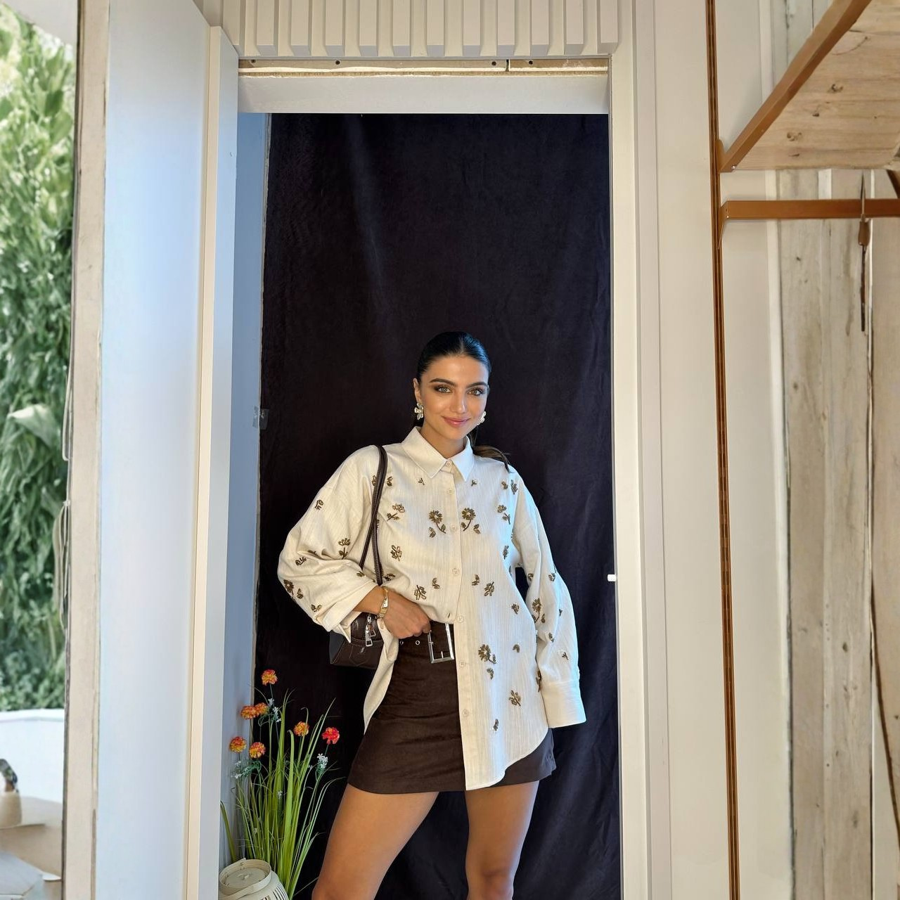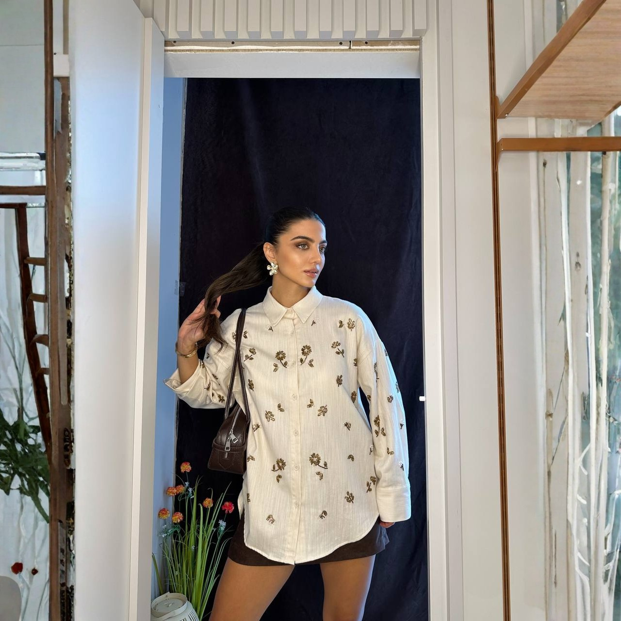 قميص أنيق بلمسة فنية مميزة يجمع بين البساطة والطابع الأنثوي الراقي، مزين بتطريزات ناعمة موزعة على كامل التصميم تضيف لمسة فخمة دون مبالغة. يتميز بقصة مريحة وطول مناسب للإطلالات اليومية العصرية، ويمكن تنسيقه بسهولة مع الشورت أو البنطال أو التنورة لإطلالة كاجوال أنيقة أو شبه رسمية.