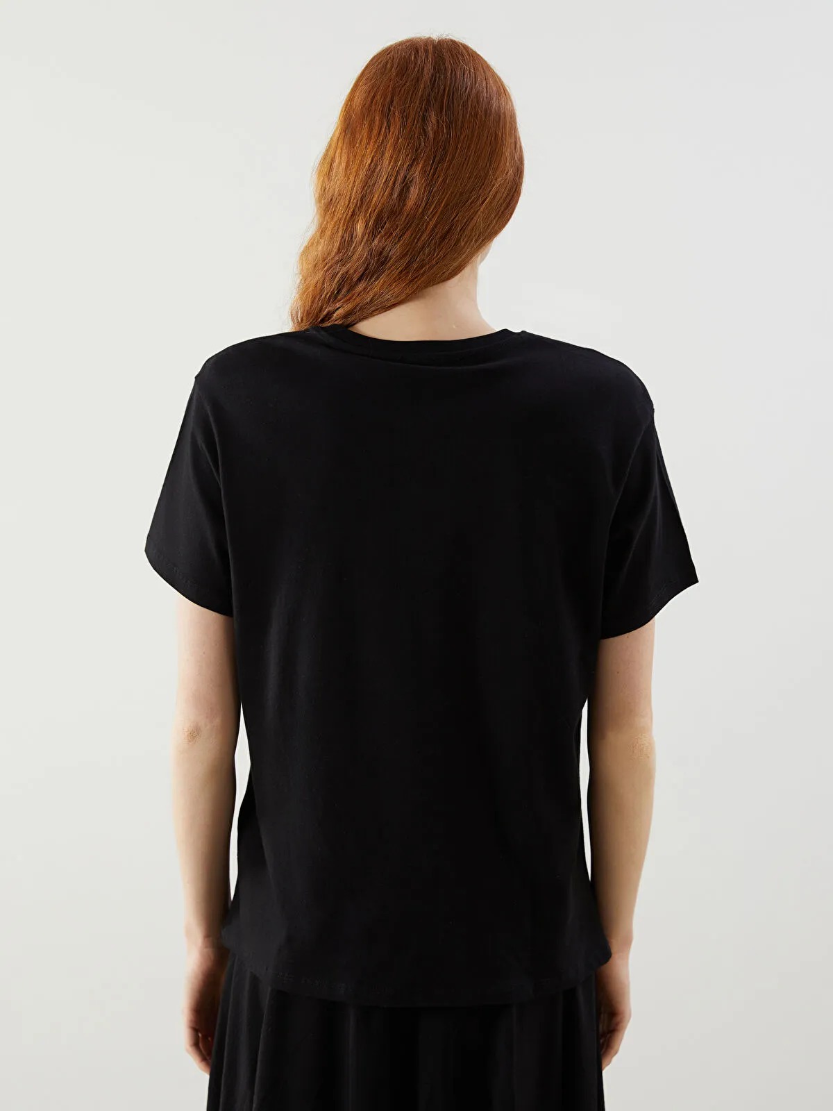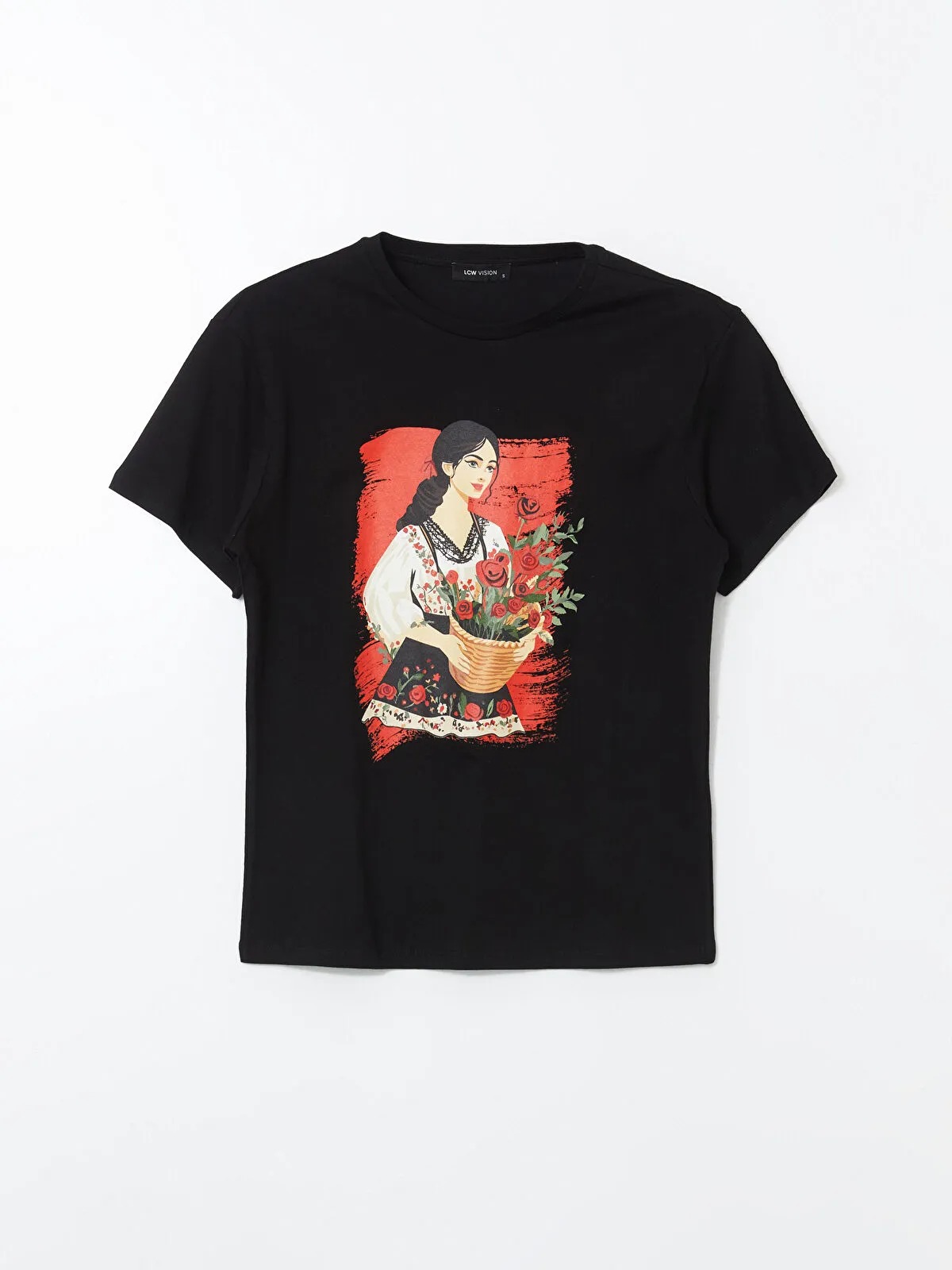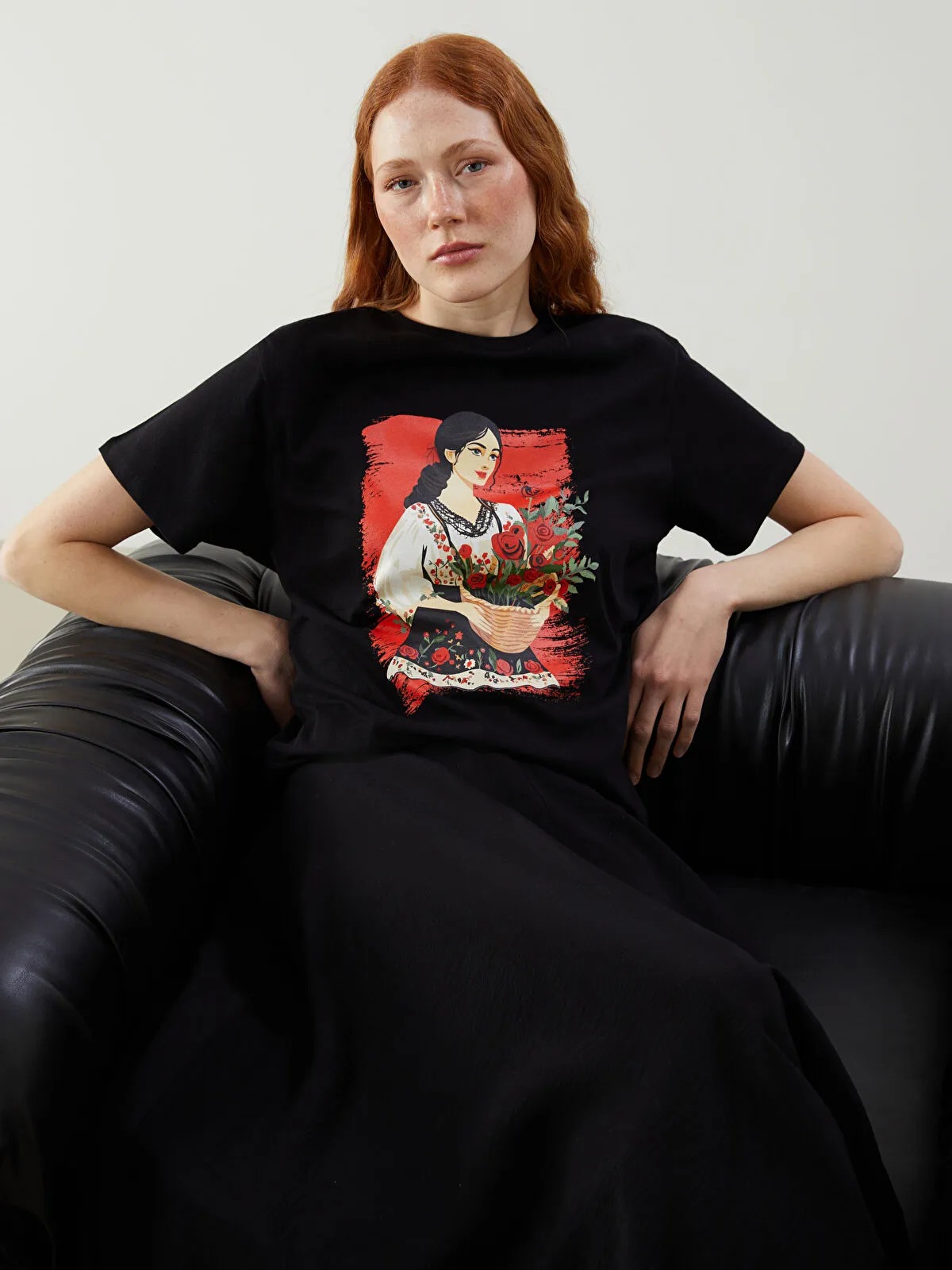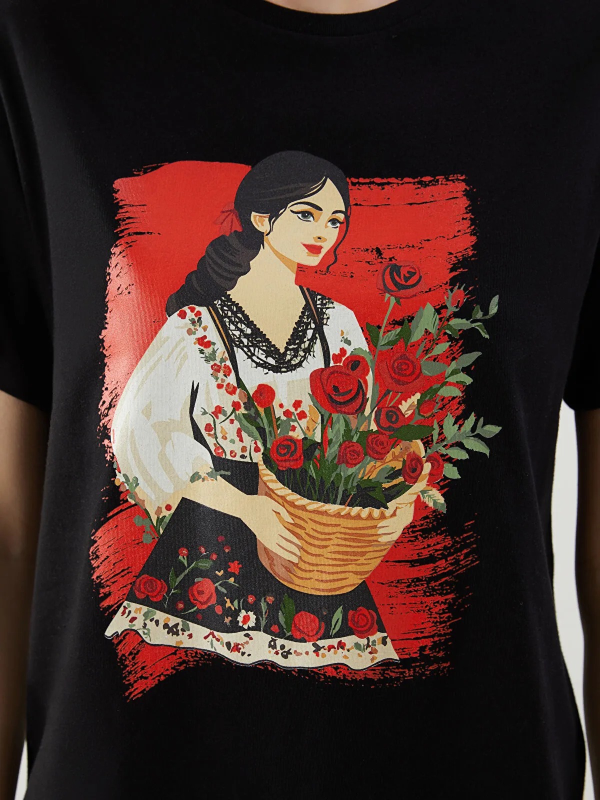 تيشيرت نسائي بلون أسود ناصع، بياقة دائرية قصيرة وأكمام قصيرة، مزين بطبعة أمامية أننيقة تضفي لمسة عصرية أنثوية. تصميم Loose & Bol يمنح حرية حركة وراحة طوال اليوم، مثالي للإطلالة الكاجوال المتوازنة والعصرية.