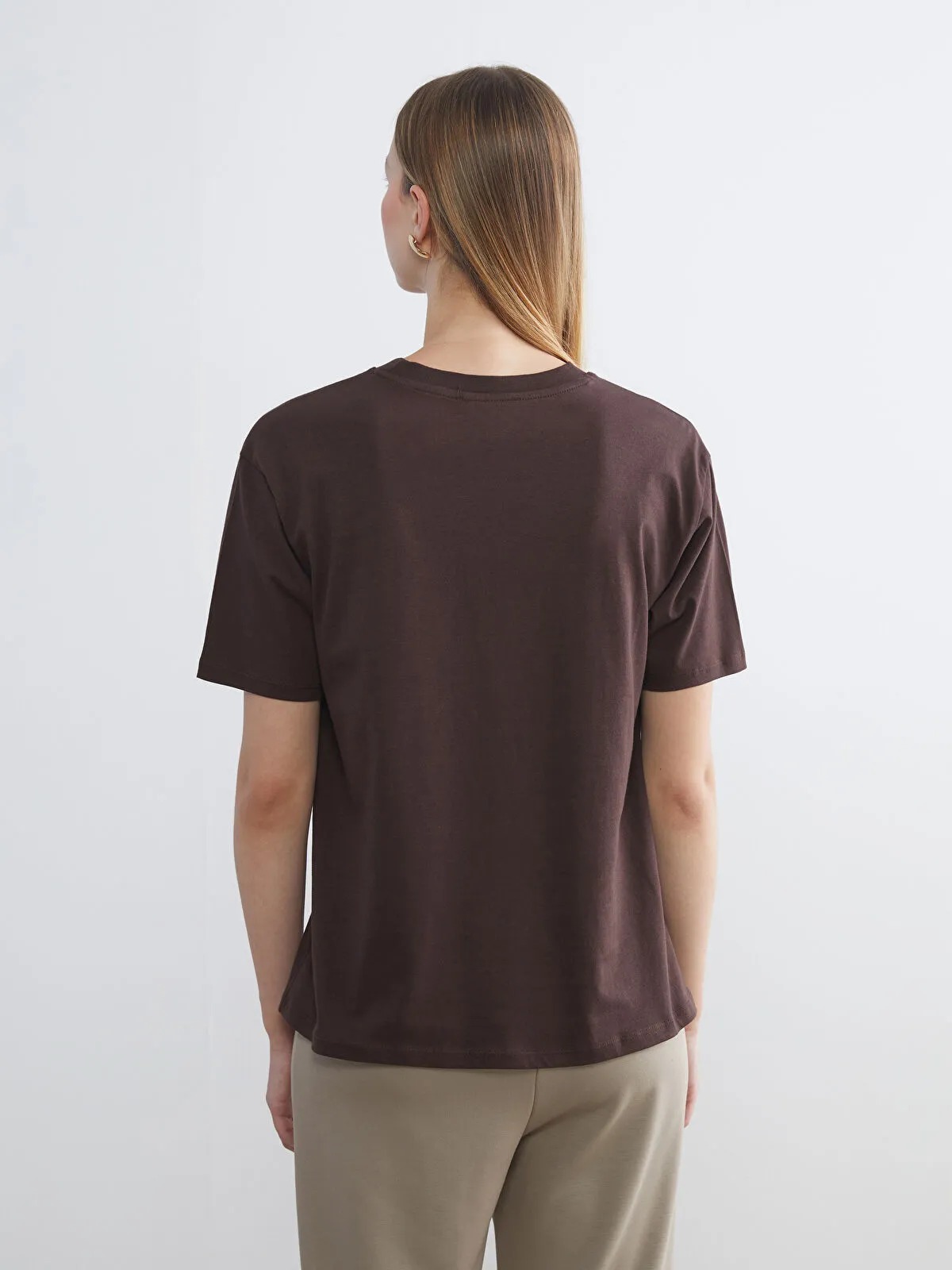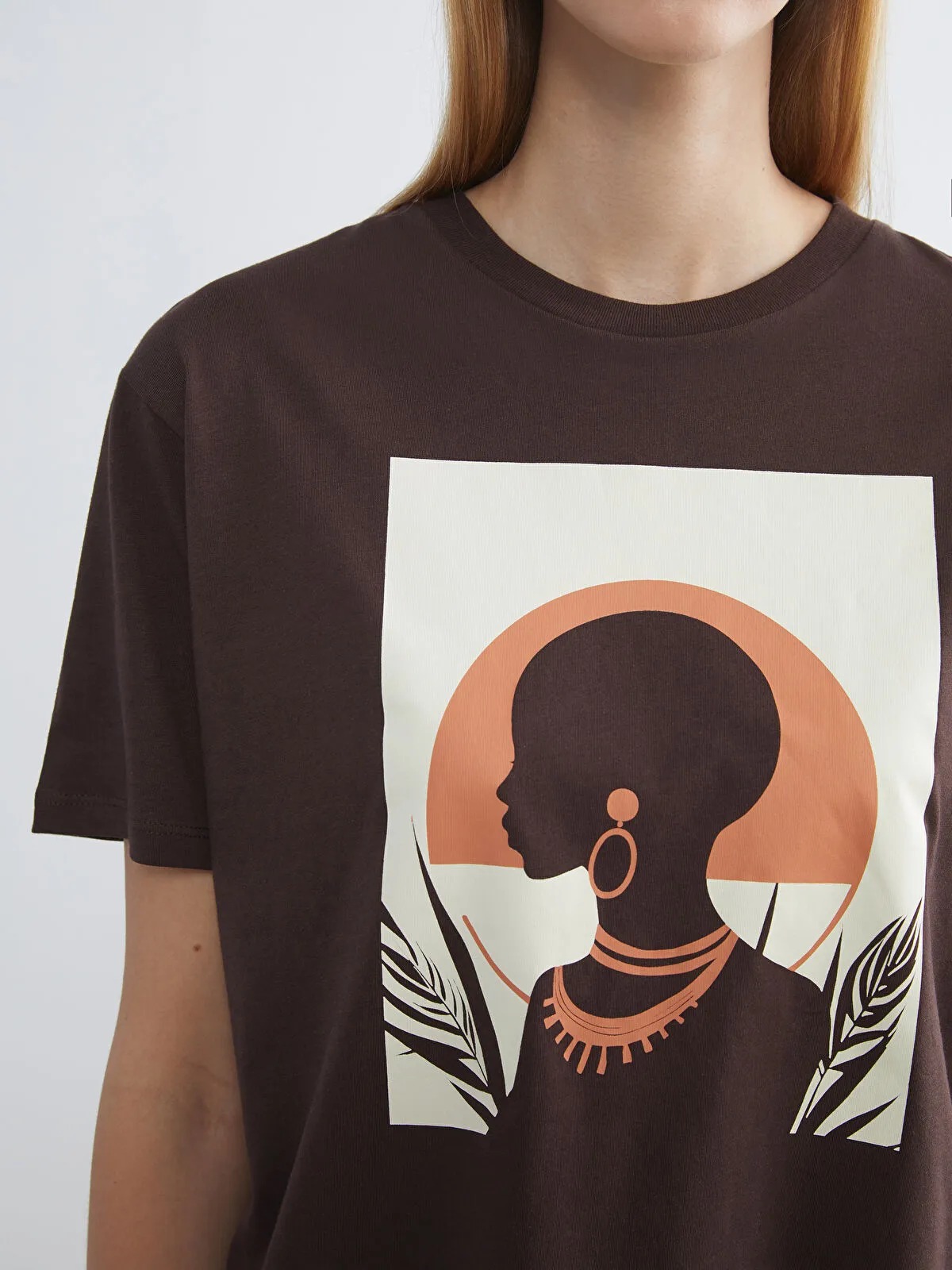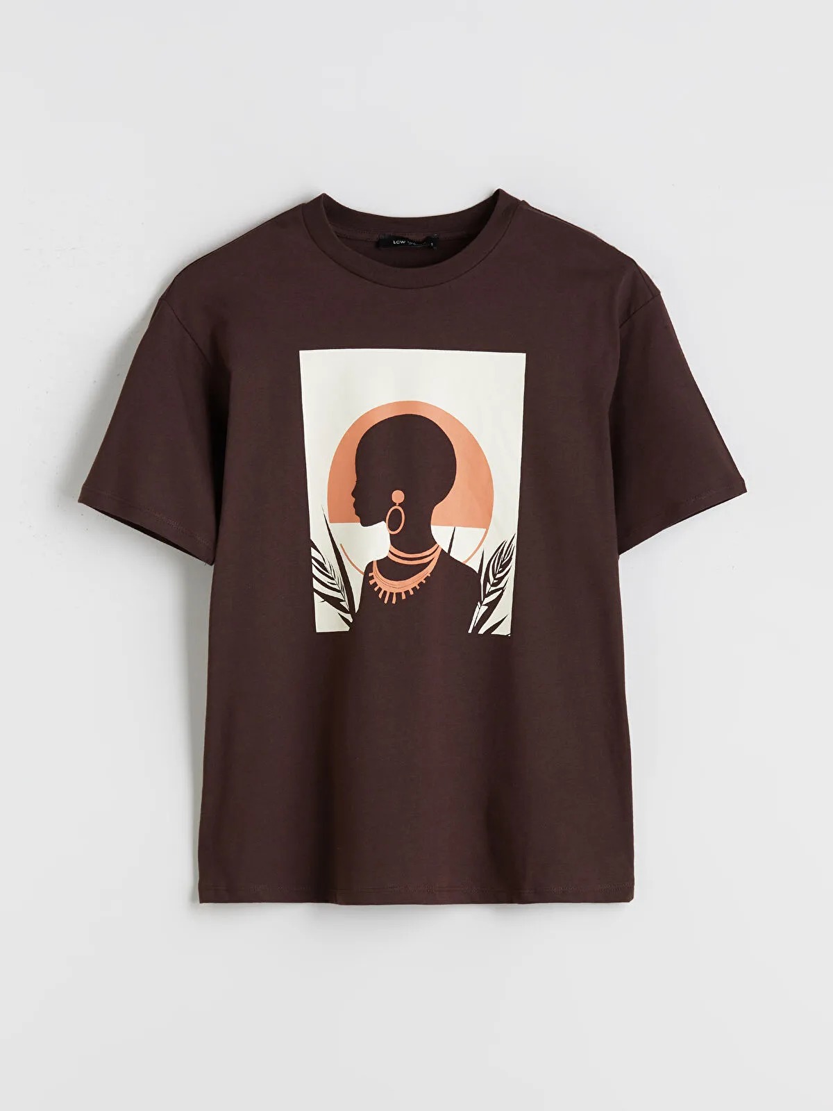 تيشيرت نسائي بلون بني داكن (كافية)، بياقة دائرية قصيرة وأكمام قصيرة، مزين بطبعة أننيقة تضيف لمسة كاجوال أنثوية تلفت الأنظار. تصميم Oversize يمنح حرية حركة وراحة ممتازة طوال اليوم، مثالي للمظهر الواسع والعصري.