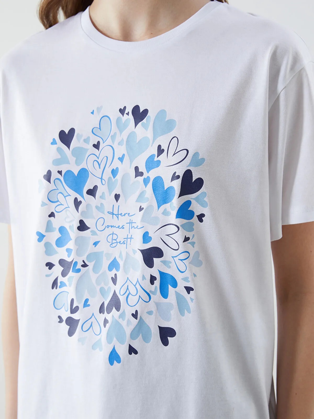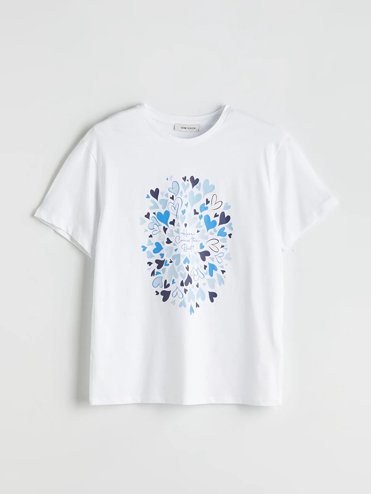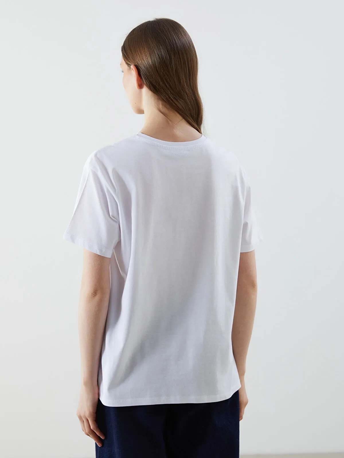 تيشيرت نسائي بلون أبيض ناصع، بياقة دائرية قصيرة وأكمام قصيرة، مزين بطبعة أنيقة أمامية تضفي لمسة أنثوية عصرية. تصميم Loose Fit من مجموعة LCW Vision يمنح حرية حركة وراحة طوال اليوم، مثالي للإطلالة الكاجوال المتوازنة والمريحة.