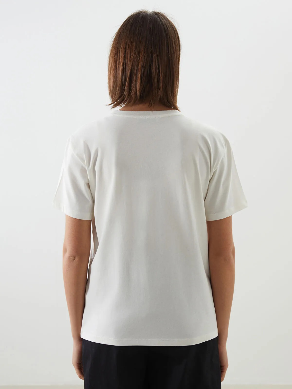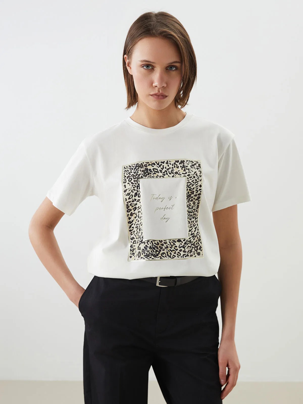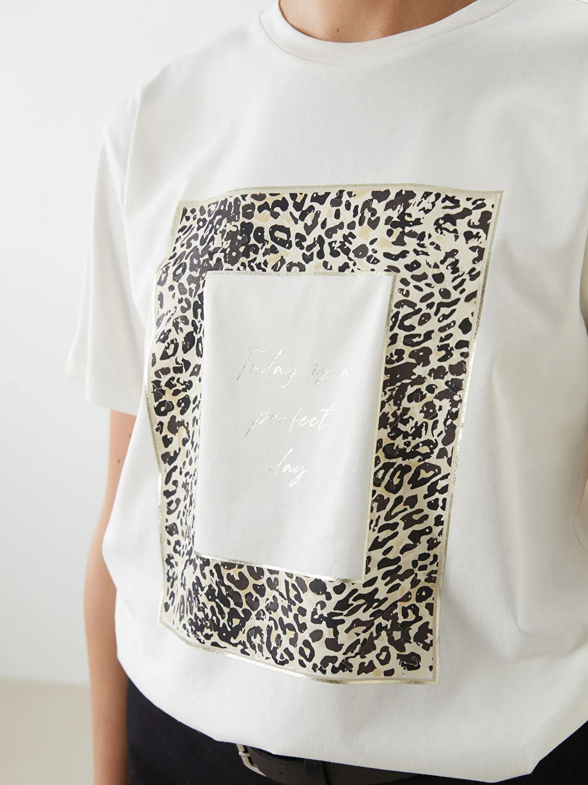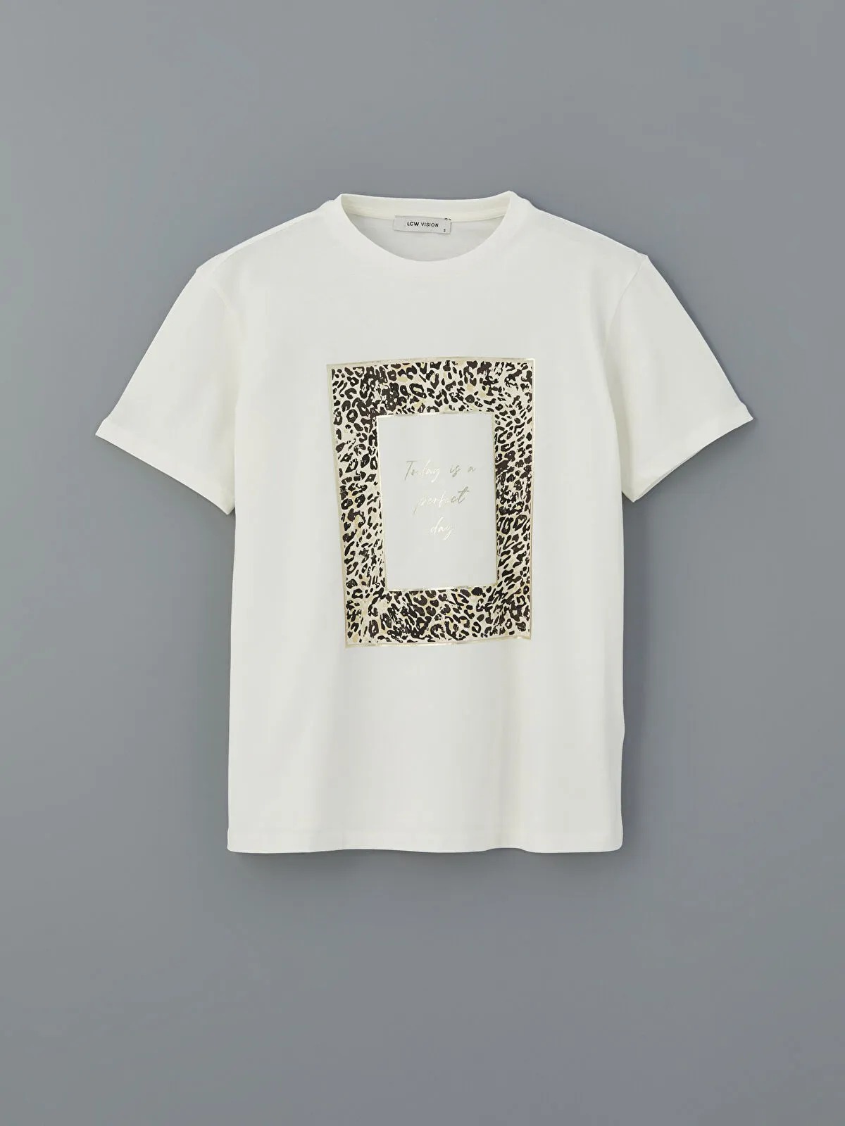 تيشيرت نسائي بلون بيج فاتح (Ekru)، بياقة دائرية قصيرة وأكمام قصيرة، مزين بطبعة أنيقة أمامية تشمل إطار بنمط حيواني وكلمات عصرية. يأتي من مجموعة LCW Vision، مما يضفي لمسة كاجوال أننيقة ومناسبة للارتداء اليومي الراقي.