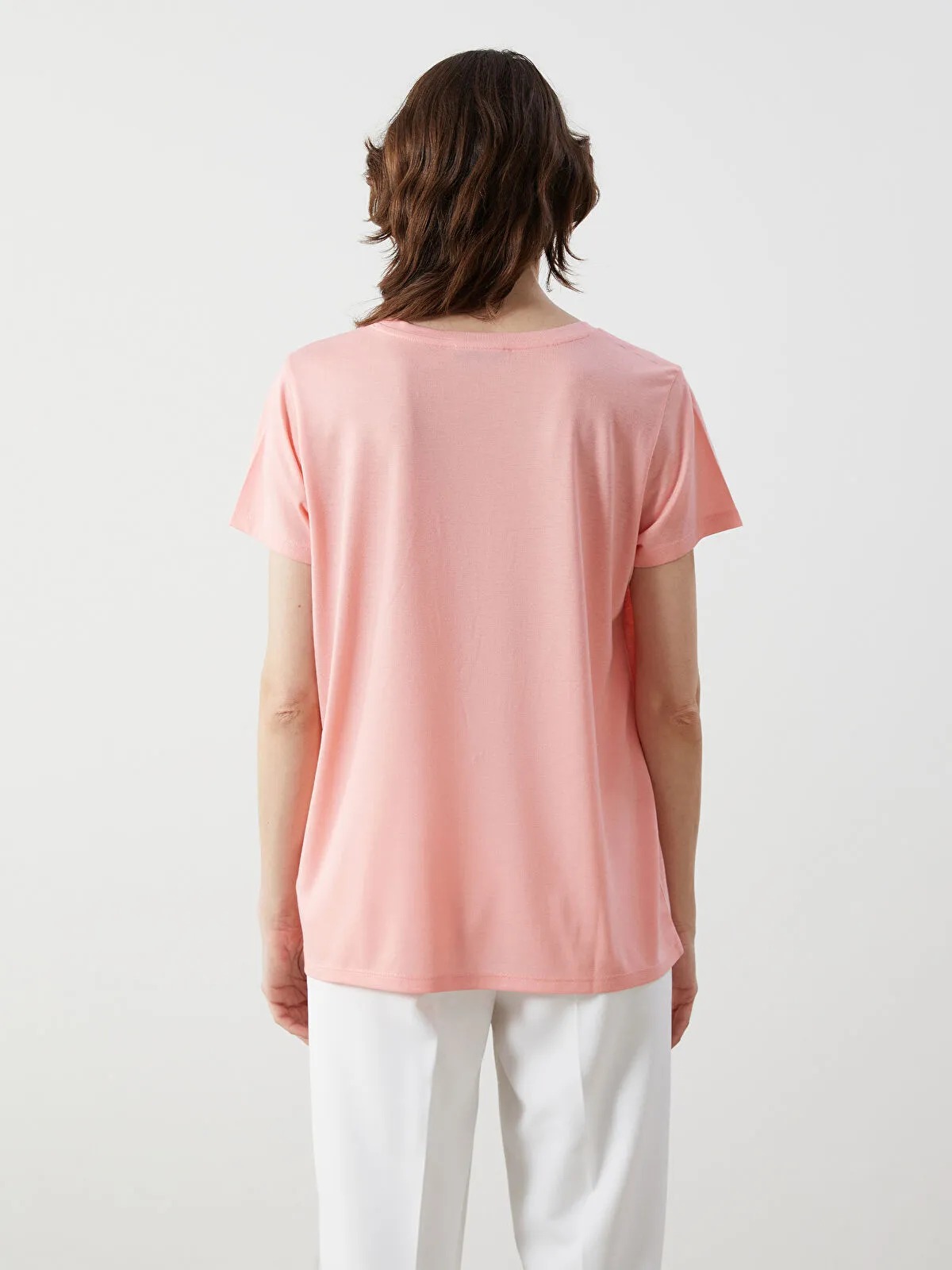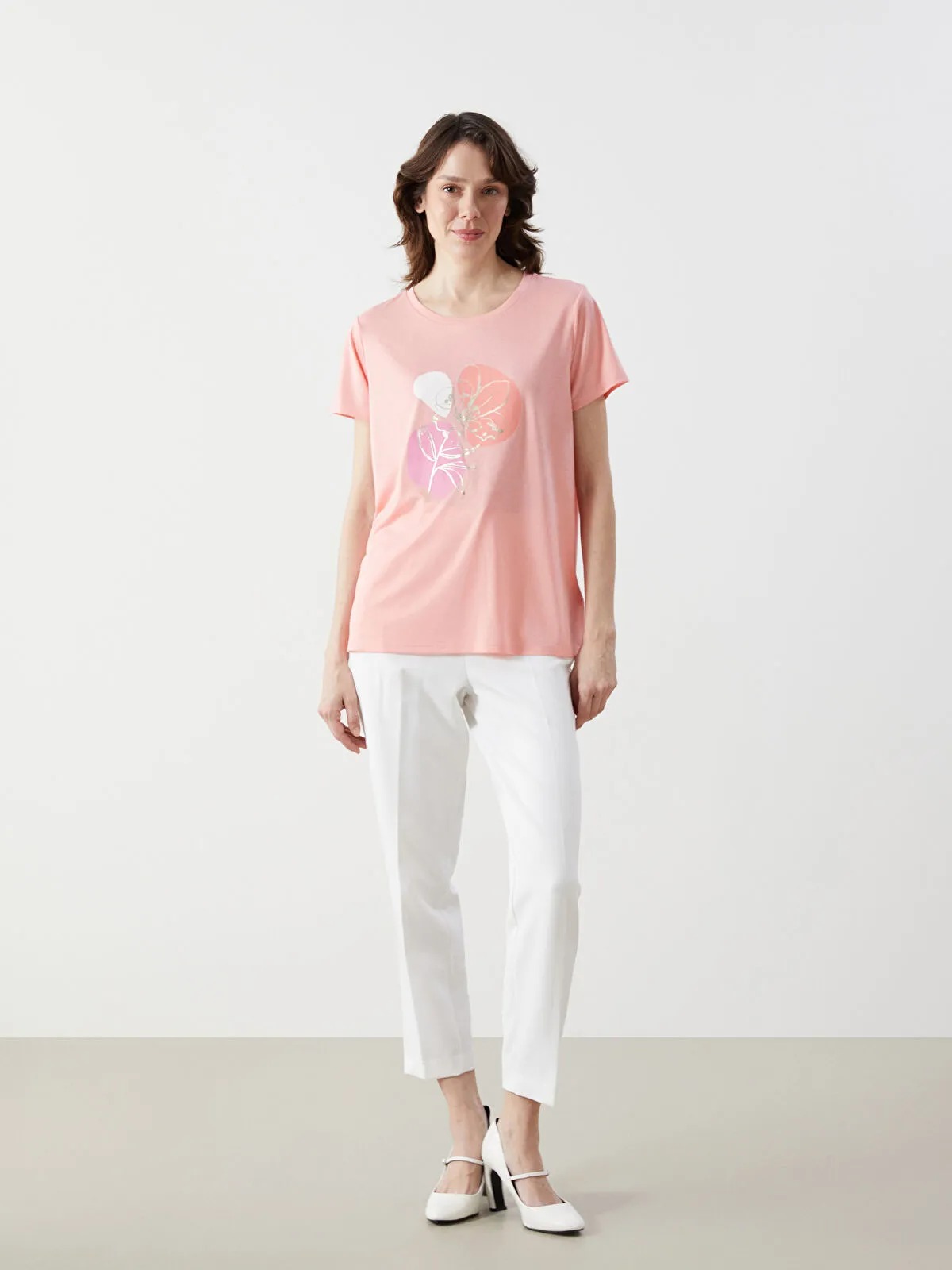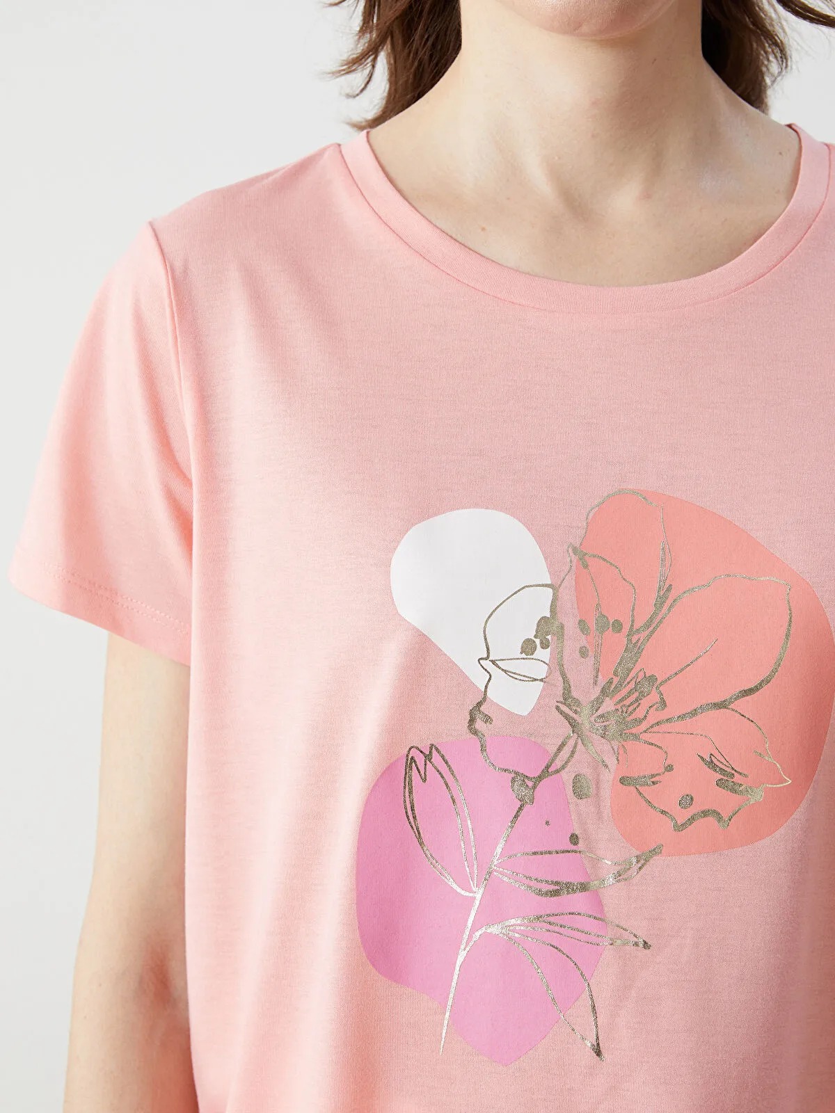 تيشيرت وردي فاتح بتصميم زيتي مميز، بياقة دائرية وأكمام قصيرة، مزين بنقش أزهار ناعم. القصة الفضفاضة Loose & Bol تمنحك مظهرًا أنيقًا وحركة مريحة في الوقت ذاته، مثالي لإطلالات الصيف الكاجوال.
